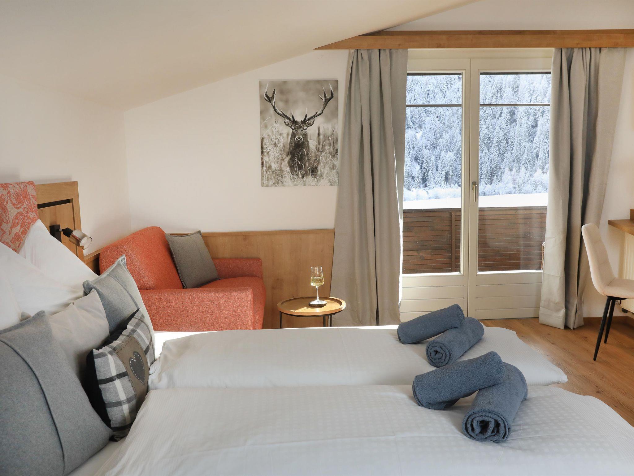 Modernes Schlafzimmer mit Vorraum Bad und direktem Zugang zum Garten. Die Ausstattung mit all den Extras, die Sie in unseren Doppelzimmern vorfinden, werden Sie schätzen.