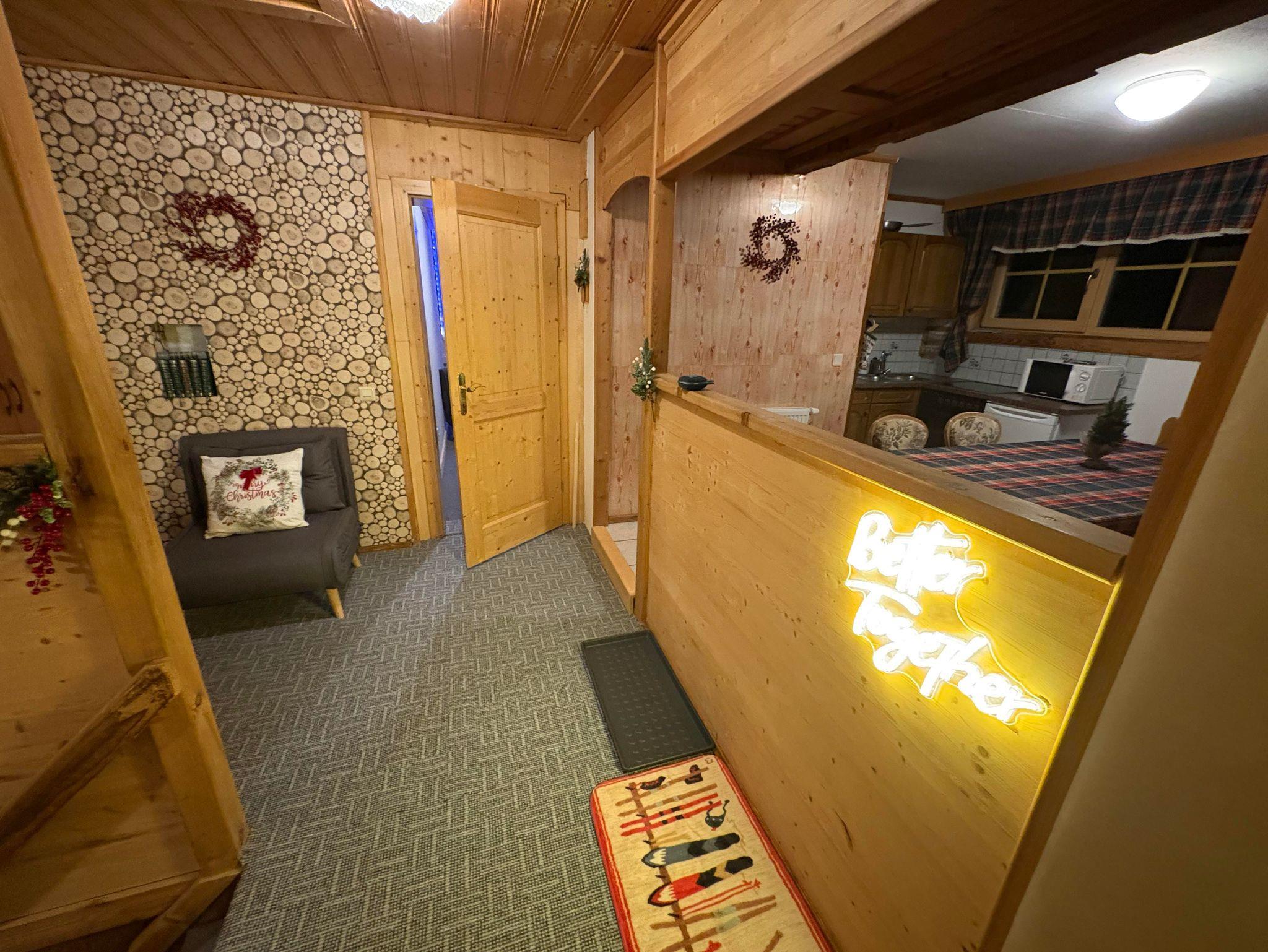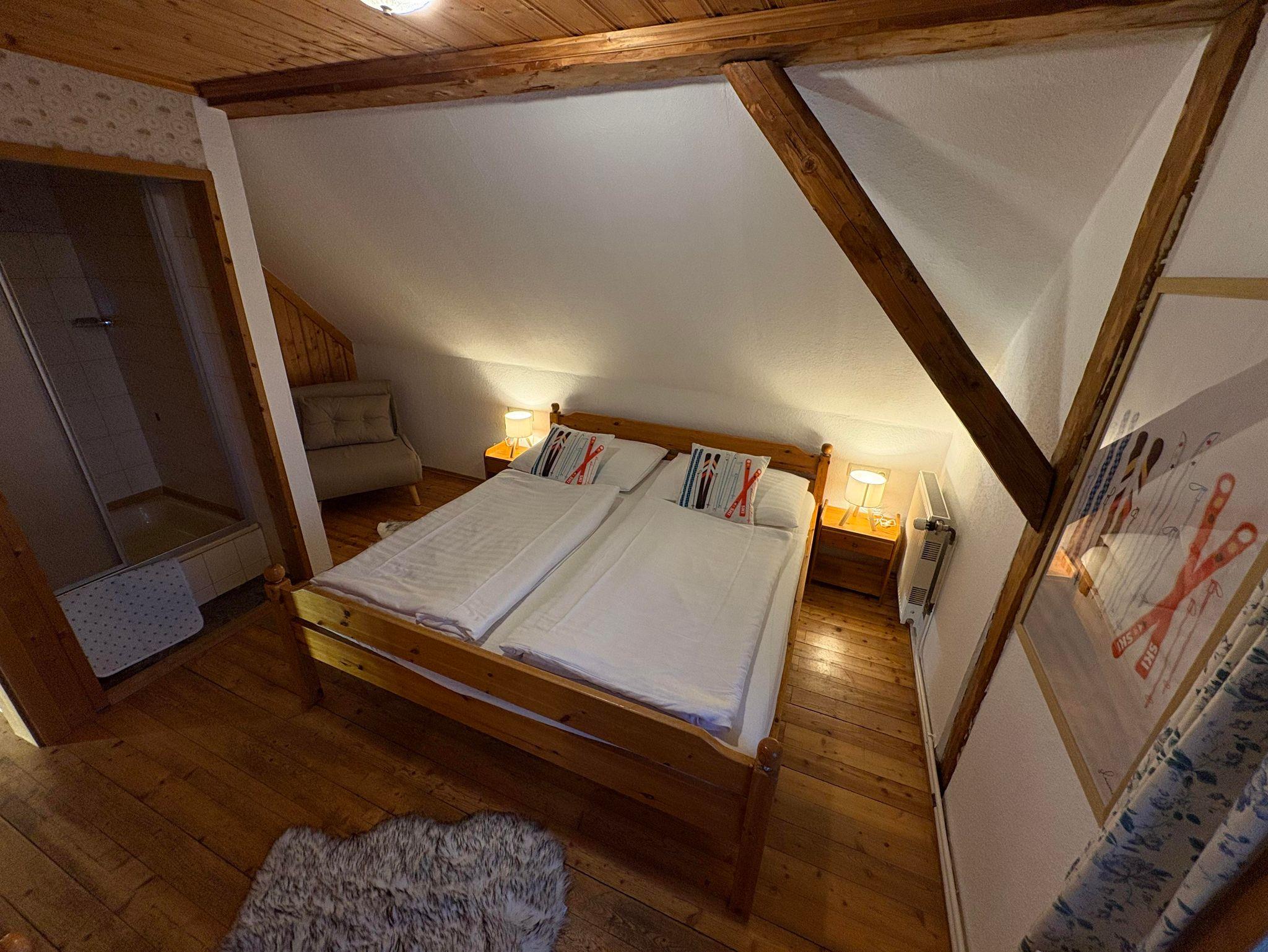 Die Dachgeschosswohnung für 10–12 Personen bietet viel Platz für Familien oder Gruppen. Es gibt drei Schlafzimmer mit Doppelbett, wobei eines davon zusätzlich mit einem Sesselbett ausgestattet ist. Ein weiteres Schlafzimmer verfügt über zwei Etagenbetten und ein Sesselbett, ideal für Kinder oder zusätzliche Gäste. Eine große, gut ausgestattete Küche und ein gemütlicher Essbereich bilden den zentralen Wohnraum. Der überdachte Balkon bietet einen schönen Ausblick. Ideal für alle, die eine großzügige Unterkunft im alpinen Stil suchen.