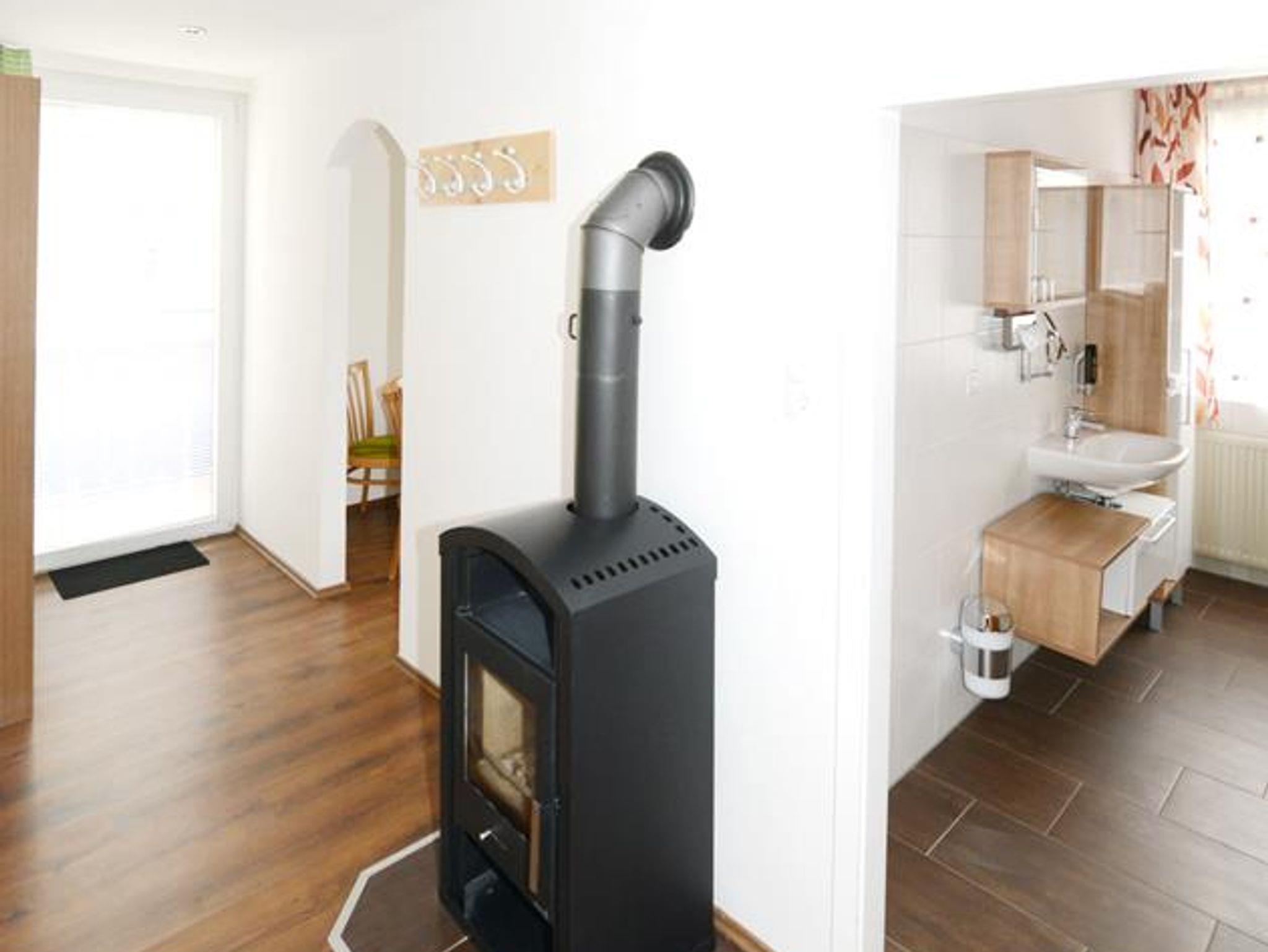 Sie umfasst 2 Doppelzimmer mit je einer ausziehbaren Schlafcouch, eine voll ausgestattete Wohnküche mit Essbereich, einen Kaminofen, Flatscreen Fernseher mit Kabelanschluss und kostenloses Wlan.