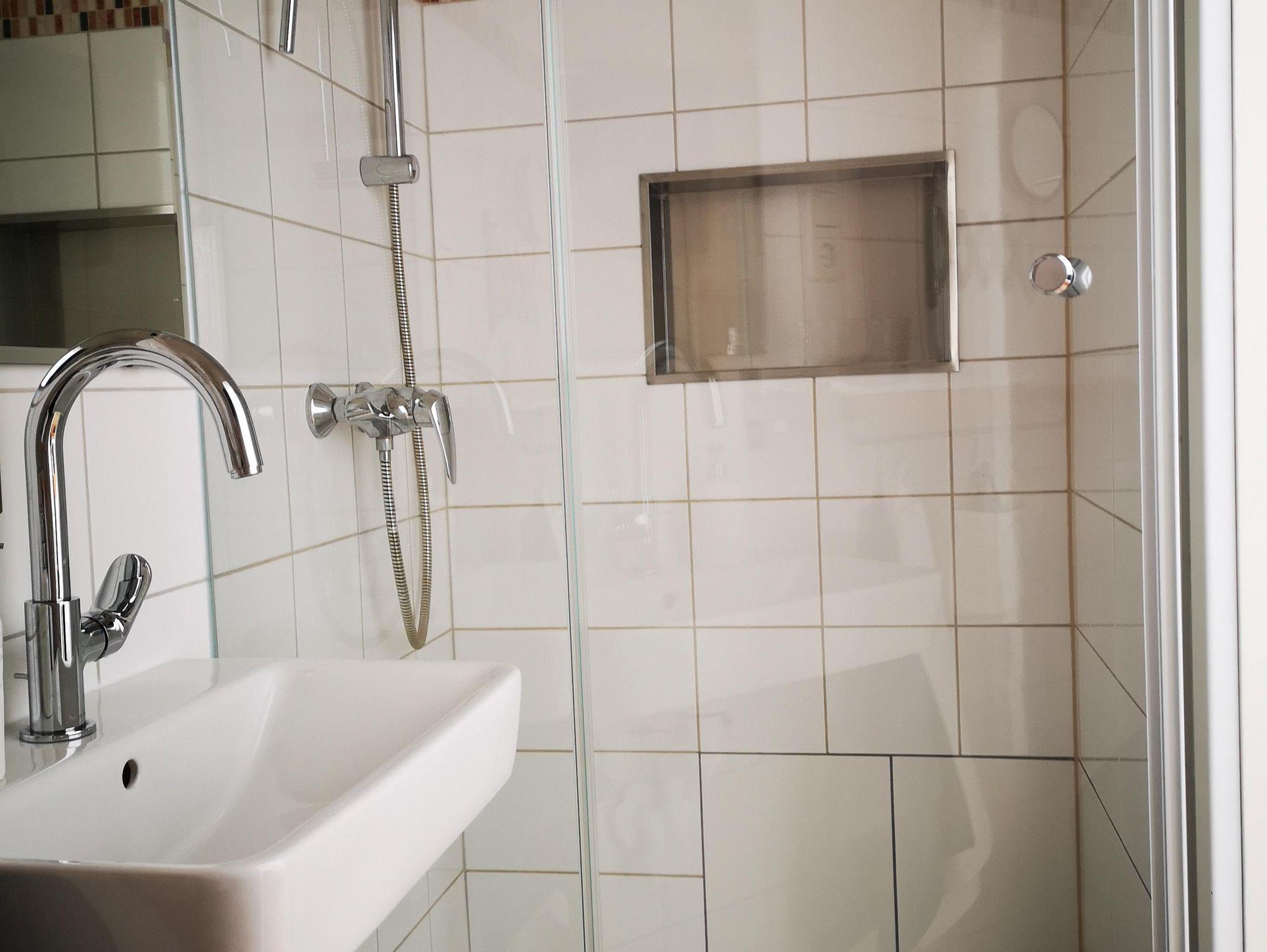 Das Badezimmer hat eine angenehm große Dusche und Ablageflächen für alle Utensilien, Handtücher und Fön liegen selbstverständlich für Sie bereit.