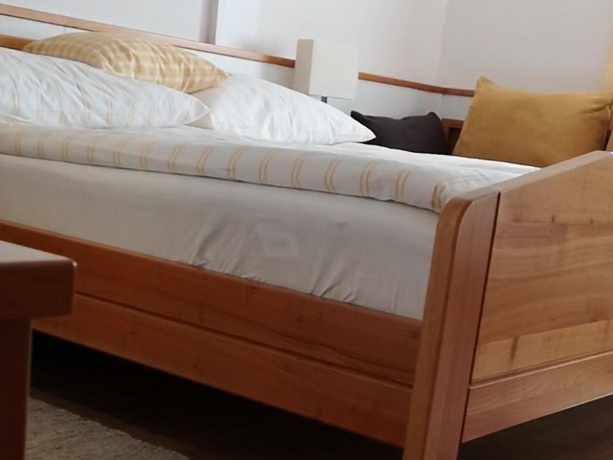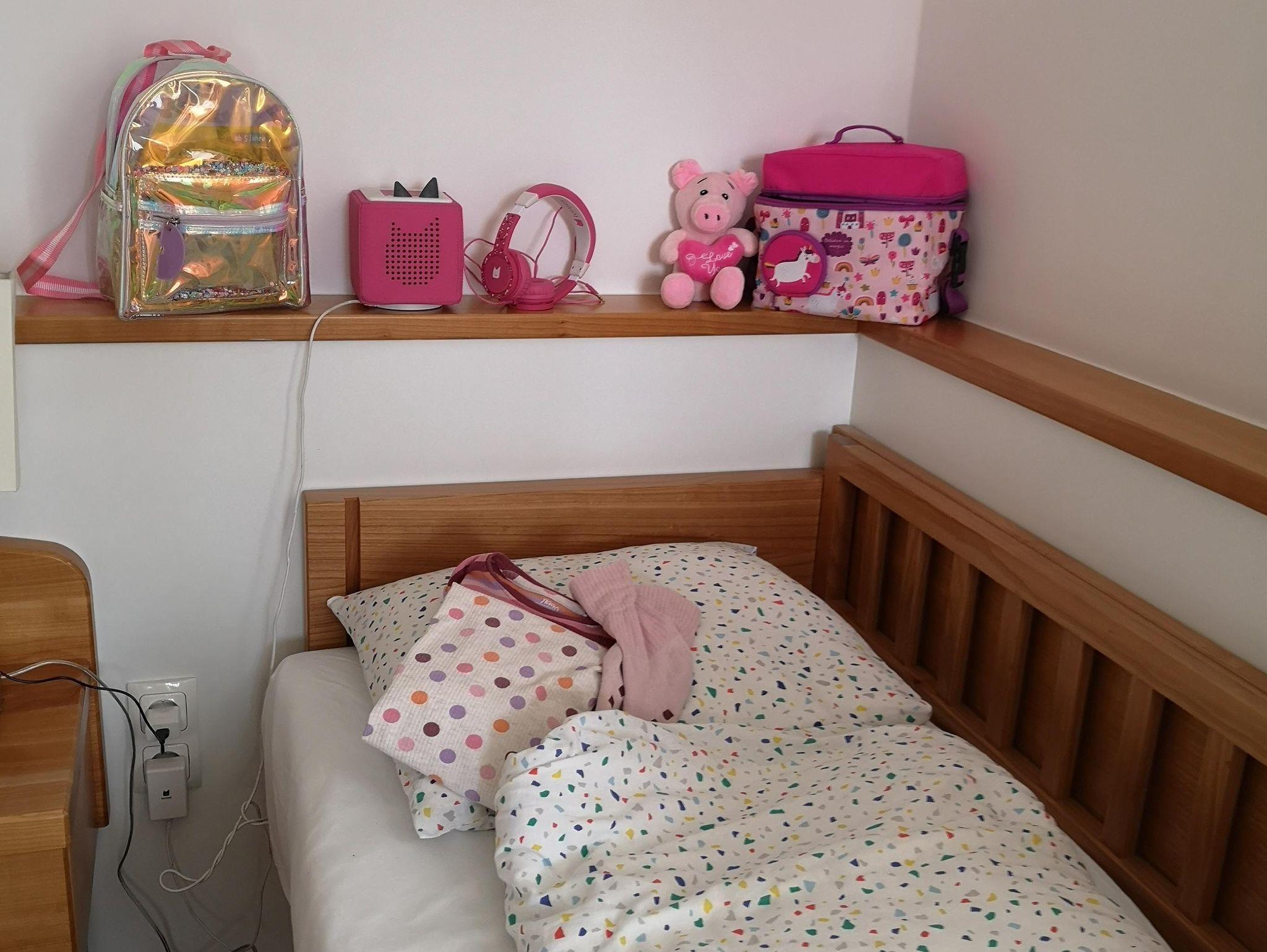 Der Tischler hat die Möbel in Kirsche massiv maßgefertigt - der Kirschbaum stand früher am Rand unserer Wiese und sorgt in seinem zweiten Leben für eine behagliche Atmosphäre. Es gibt ein Kind Size Bett und eine gemütliche Couch, die bei Bedarf für bis zu zwei Kinder ausgezogen werden kann. Die Ablage hinter diesem KInderbett hat die perfekte Größe für die Toniebox.