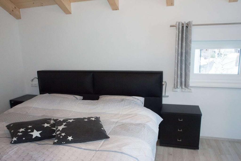 Se også denne videoen: https://youtu.be/Hz8OpFtKsVY Huset ble nybygd i desember 2017. Utvendig ser det originalt ut, men innvendig er det komfortabelt og moderne. Kjøkkenet har alt du trenger, inkludert mikrobølgeovn, oppvaskmaskin, stekeovn, kaffemaskin, Nespresso-maskin osv. Det er tre soverom, hvert med plass til to personer. Sengene er alle av høy kvalitet med springmadrass. To soverom oppe har eget bad. Ett soverom har en sørvendt balkong. I 2022 byttet vi ut den originale stigen til det tredje soverommet på loftet med en skikkelig trapp. Stuen har en komfortabel sofa, en moderne TV med nederlandske, tyske og østerrikske kanaler i HD, en lydplanke og en peis. Boden i første etasje har en vaskemaskin-tørketrommel-kombinasjon og er egnet for tørking av tursko og skistøvler.