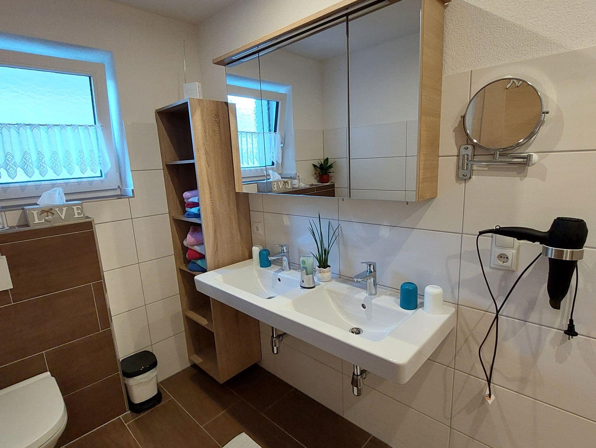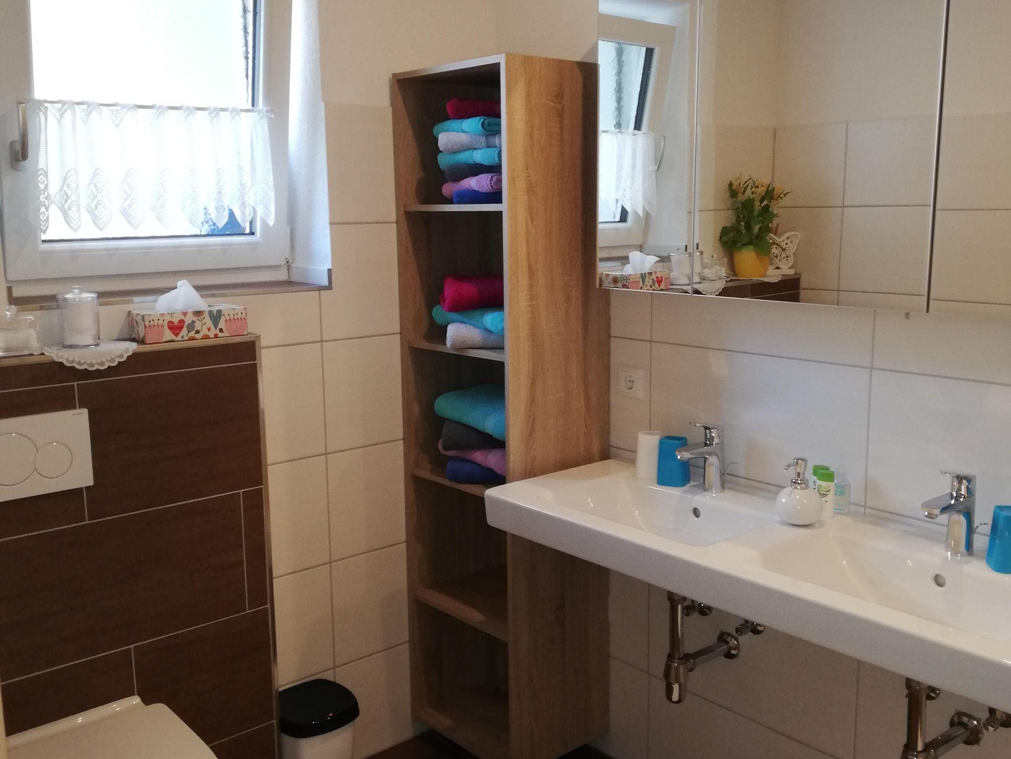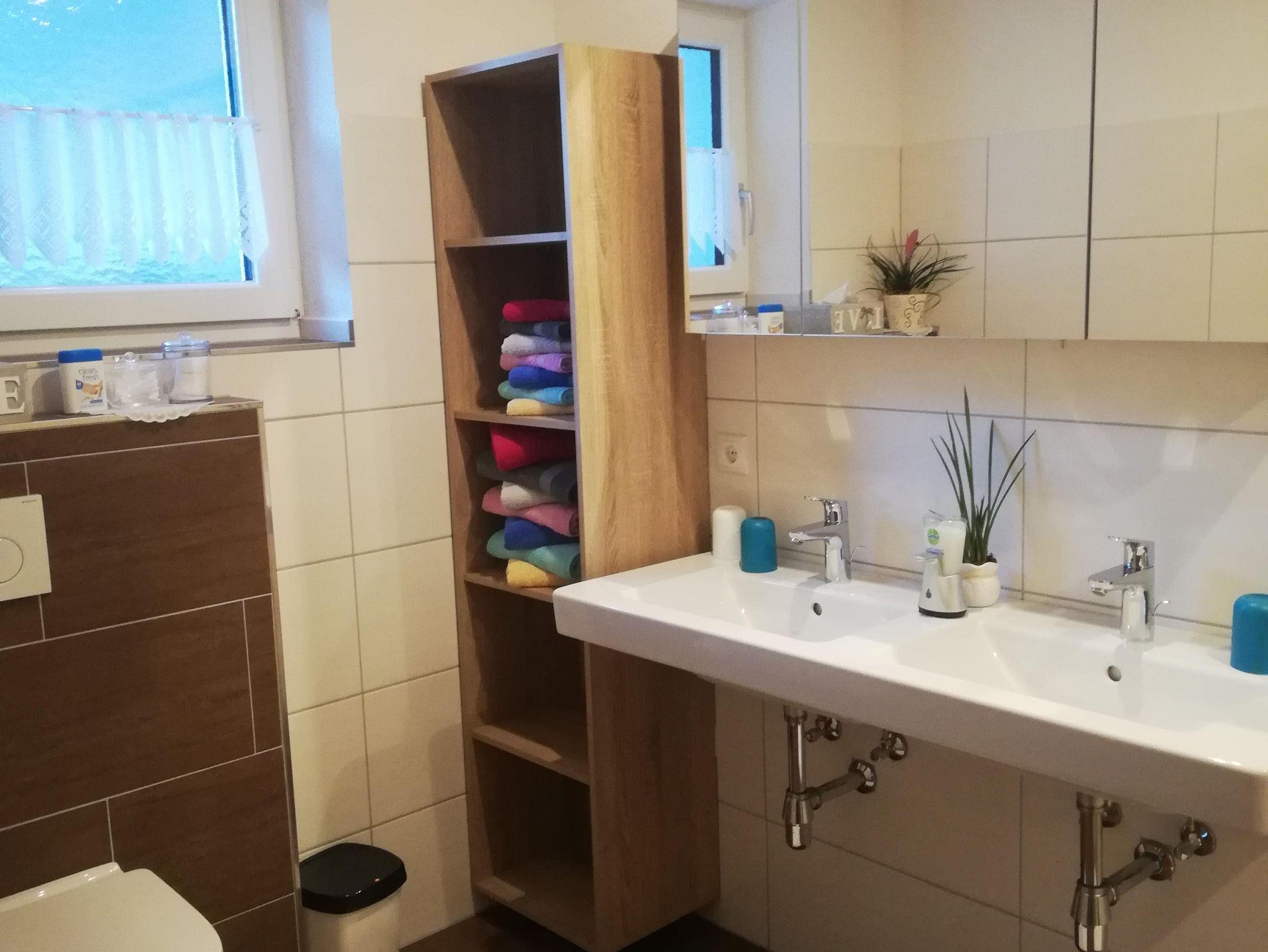 Eigener Eingang zum Apartment und gratis W-LAN/Wifi. Die Küche ist mit einem Küchenblock, vielen Küchenutensilien, (sowie Salz, Pfeffer, Zucker, versch. Tees, Spülmittel, Geschirrspültabs, Spül- und Geschirrtücher, usw.) 4 Platten Herd, Backofen, Dampfabzug, Kühlschrank mit Gefrierfach, Geschirrspüler, Kaffeemaschine, Toaster, Stab und Handmixer, Wasserkocher, großem Tisch mit Eckbank, und einem SAT TV ausgestattet. Unser Brötchenservice von Montag bis Samstag(außer Feiertage) verwöhnt sie mit frischem Gebäck zum Frühstück! Das Wohnzimmer ist mit einem gemütlichen Ecksofa und Tischchen für nette Spielabende, sowie einem großen SAT Fernseher ausgestattet. Das Apart bietet drei separate Vollholz Schlafzimmer. Zwei Zimmer sind mit einer Verbindungstür verbunden. Bad mit Dusche, WC und Doppelwaschbecken, WC extra, Garderobe, Terrasse, Liegewiese.