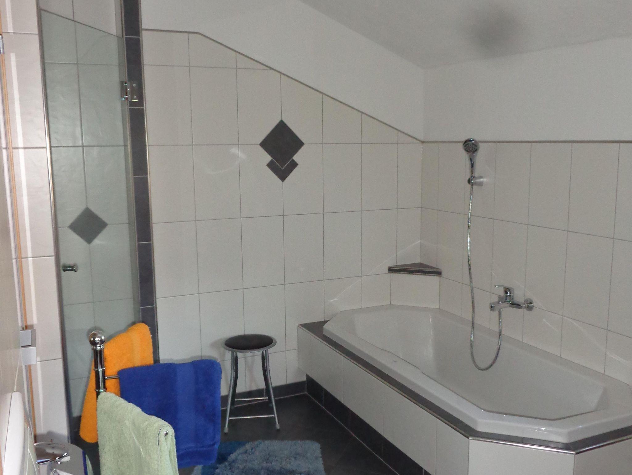 Die Wohnung verfügt über einen hellen Wohnraum mit Kochzeile, Sitzecke und Couch und Balkon. Daneben ist ein Bad mit WC/Dusche. Im unteren Stock befinden sich 3 Schlafzimmer, die Garderobe und ein großes Bad mit Dusche/Badewanne und Infrarotkabine.