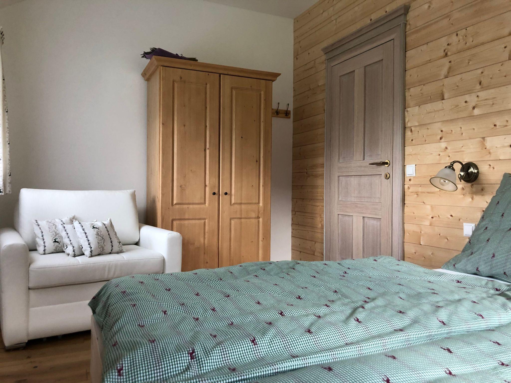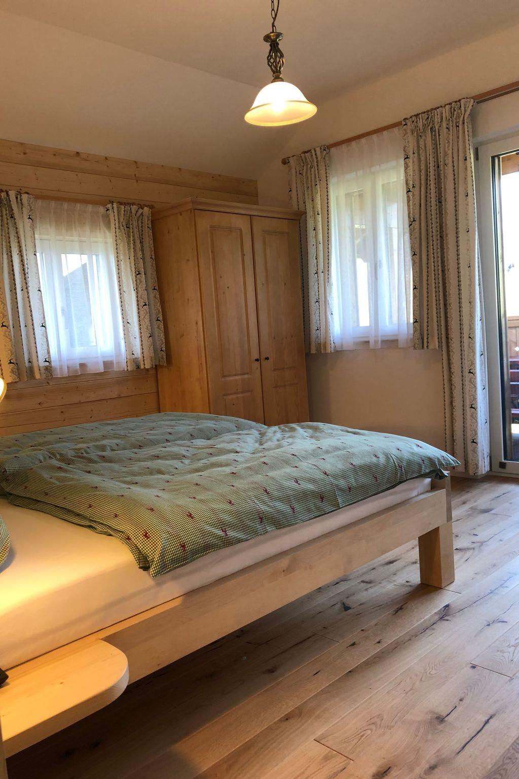 In our new flat chalet you can choose between one flat for four guests (extra bed possible) and two flats for two guests each (extra bed possible) with upscale alpine-style furnishings, one designed for four guests (with children's travel bed 120 cm on request) and two for two guests (with children's travel bed 120 cm on request). We will be happy to inform you about the possibility of accommodating additional guests on request. Are you travelling in a larger group? No problem: by opening a double connecting door, two flats can be converted into one accommodation unit in no time at all, which in turn can be connected to the flat on the upper floor via a shared staircase. A carport with three parking spaces is located directly next to the chalet. Each of the flats has a balcony or terrace with a bench where you can find the peace and quiet you have been longing for and enjoy a breathtaking panoramic view. Depending on whether you have opted for a flat for two or four guests, you can retreat to two or one bedroom. These are furnished with a 180x200 cm double bed without a footboard. High-quality, medium-hard mattresses and the finest Austrian bed linen ensure that you feel comfortable in bed. If you wish, you can also enjoy the full range of cable TV in the bedroom. The kitchenette with a fridge and freezer compartment, cooker and oven, kettle, coffee machine, a selection of pots, pans, wine and water glasses, as well as country-style china crockery, allows you to self-cater for longer periods of time. A comfortable corner bench invites you to sit together for hours and a beautiful miniature tiled stove provides cosy warmth in addition to the underfloor heating in winter. A comfortable sofa and a modern flat-screen TV harmoniously complement this area and invite you to spend time together. The bathroom pampers you with a spacious shower cubicle and a double or single washbasin. It is equipped with a hairdryer and WC. In the flat for four people you will find a second separate toilet. We have provided you with a towel and a bath towel, as well as shower gel, hair shampoo and body lotion for your first needs. From the eat-in kitchen you can access your own terrace or balcony with a breathtaking view of the mountains, depending on the accommodation unit, which is equipped with cosy seating for you.
