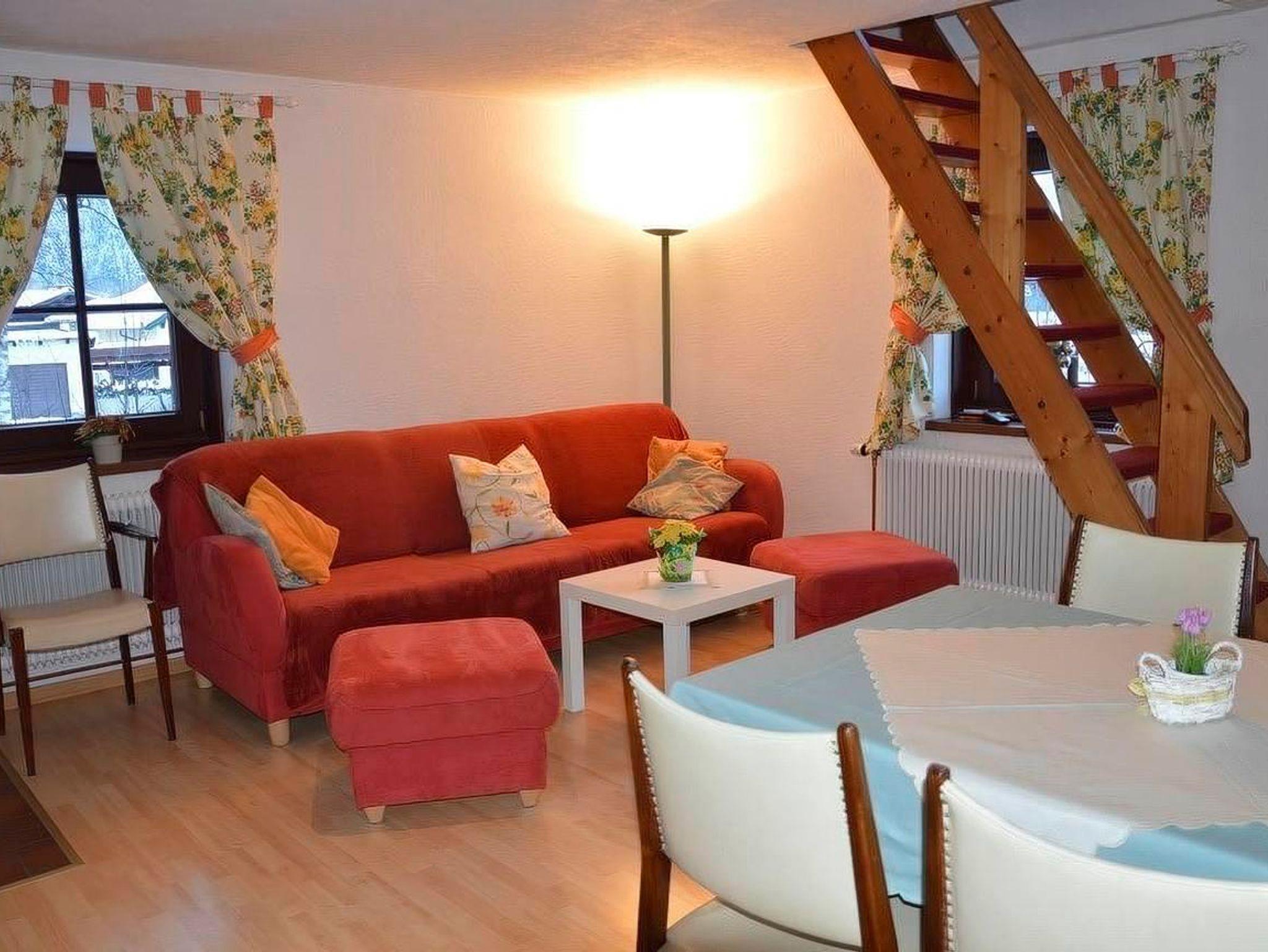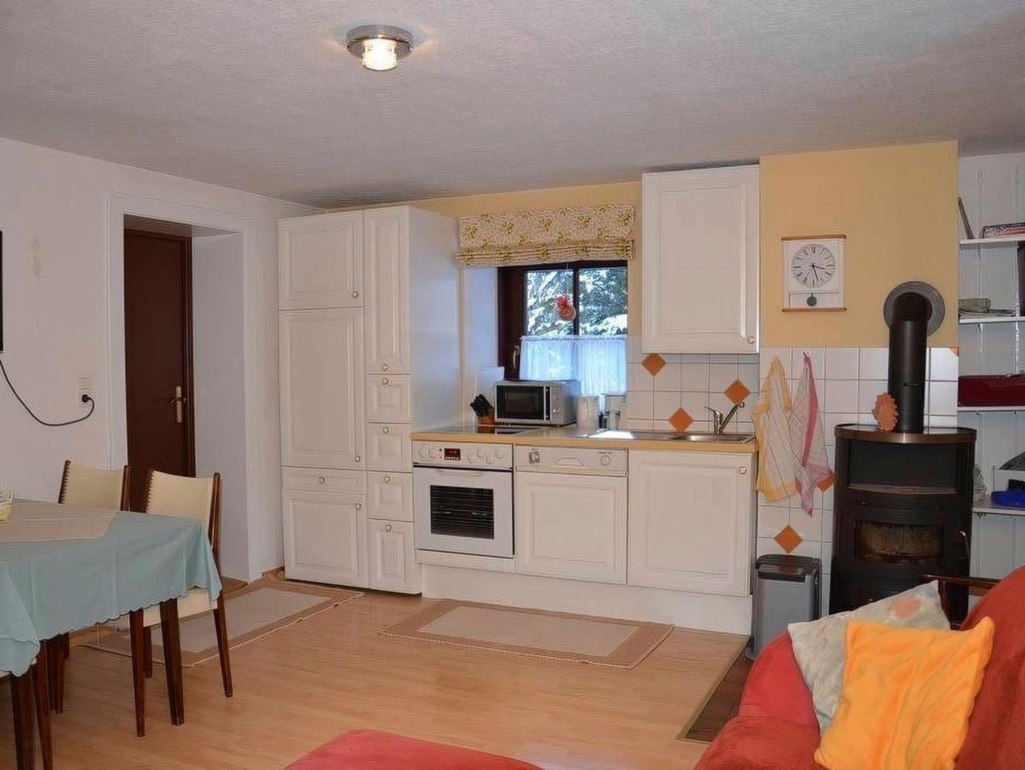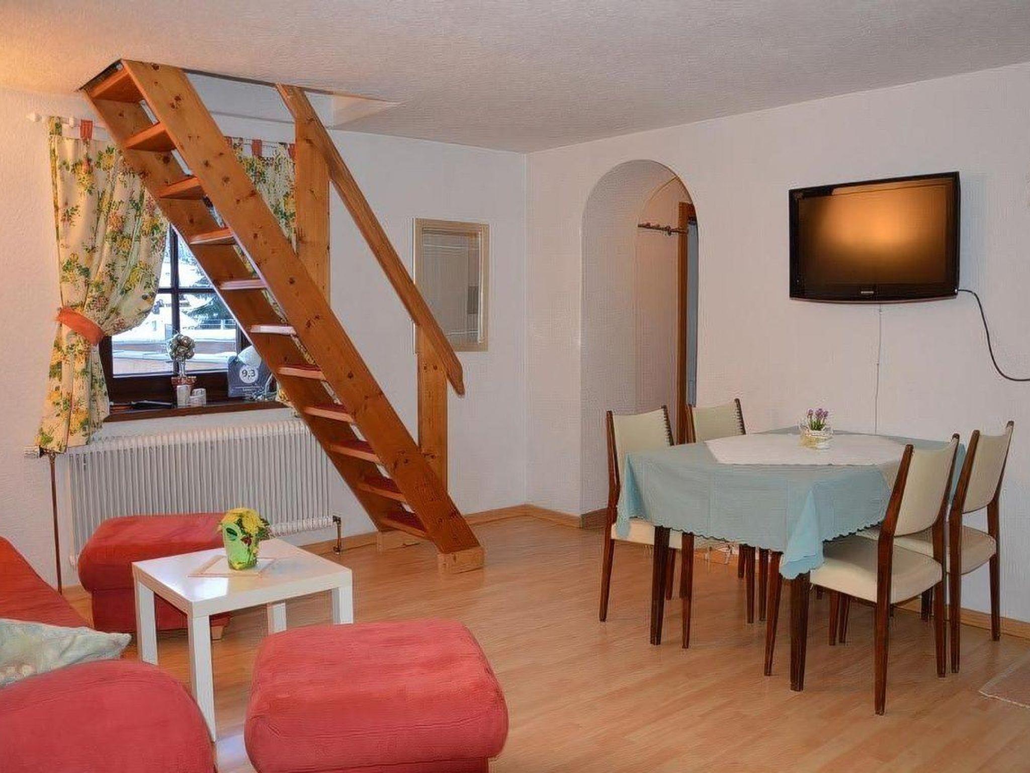 Im EG befindet sich eine Wohnküche mit Esstisch und zusätzlicher Couch. Bad und WC getrennt. In der Mansarde ist der Schlafraum mit 4 Betten. (Schi)Bushaltestelle vor dem Haus. Zum Bäcker 2Minuten