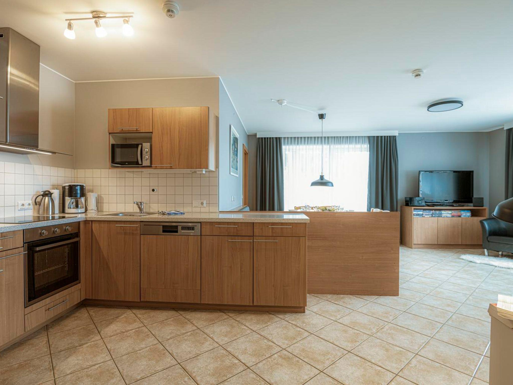 • voll ausgestattete Küche mit Kühlschrank (inkl. Gefrierfach), Induktionsherd, Backofen, Mikrowelle, Cafemaschine, Geschirrspülmaschine