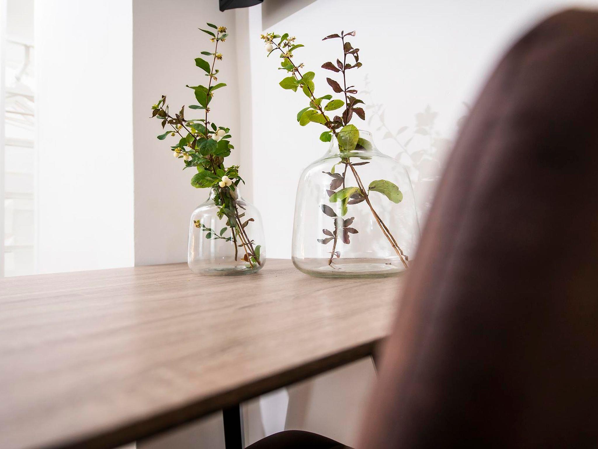 Die Küche ist technisch voll ausgestattet (Kaffeemaschine, Wasserkocher, Geschirrspüler, Geschirr, Utensilien etc.) und im Design auf Top-Niveau: fliederweiß und Eiche Burguesa.