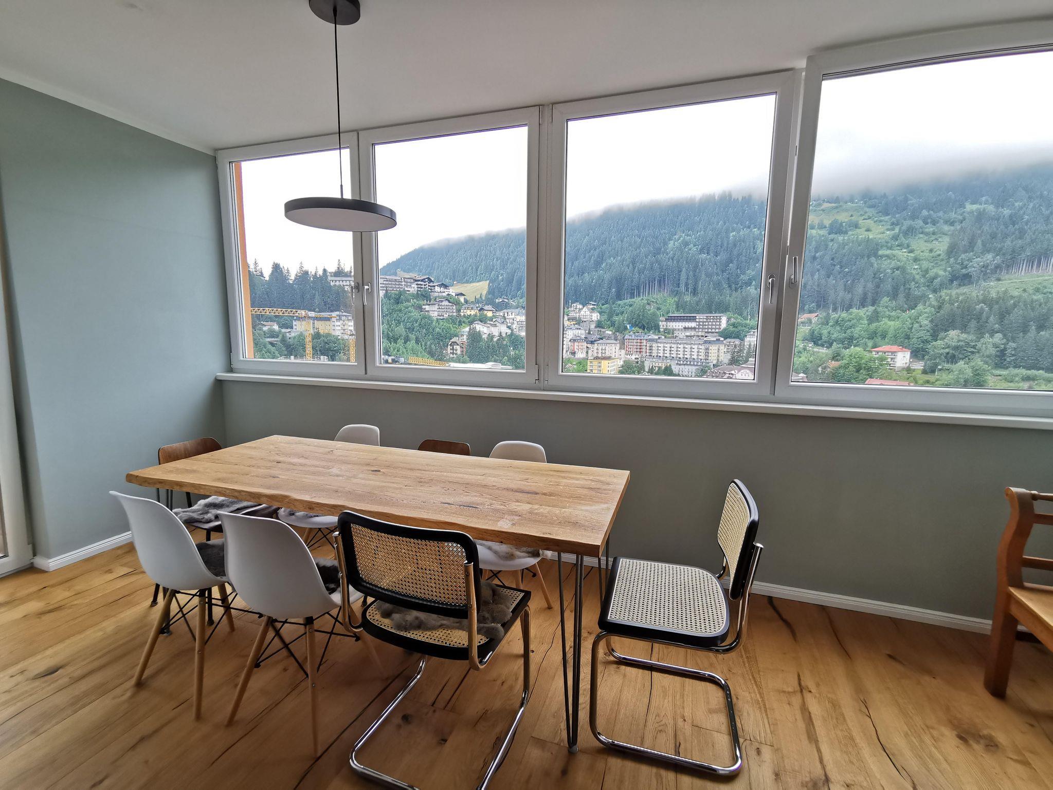 Fast schon trohnend, wie ein Beschützer über Bad Gastein, im orangen Flair, erwacht ein neues Familien Spa Panorama Appartement Haus DAS.SCHILLER.