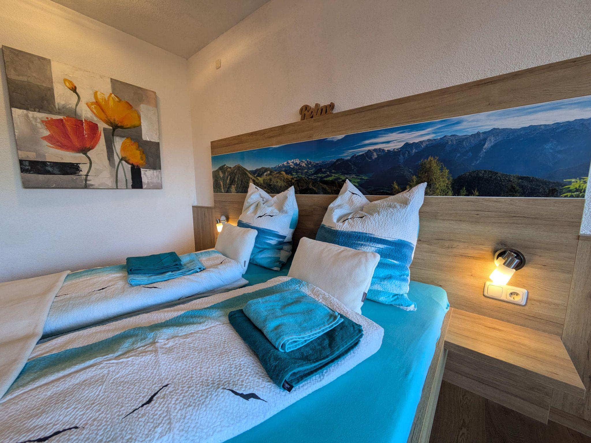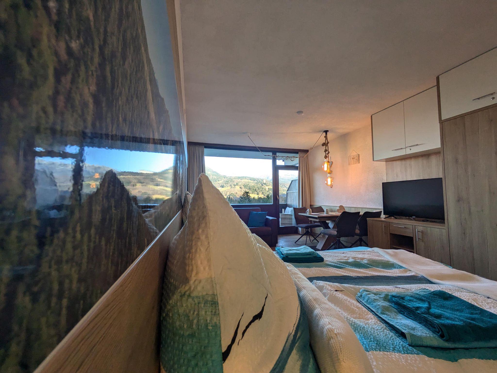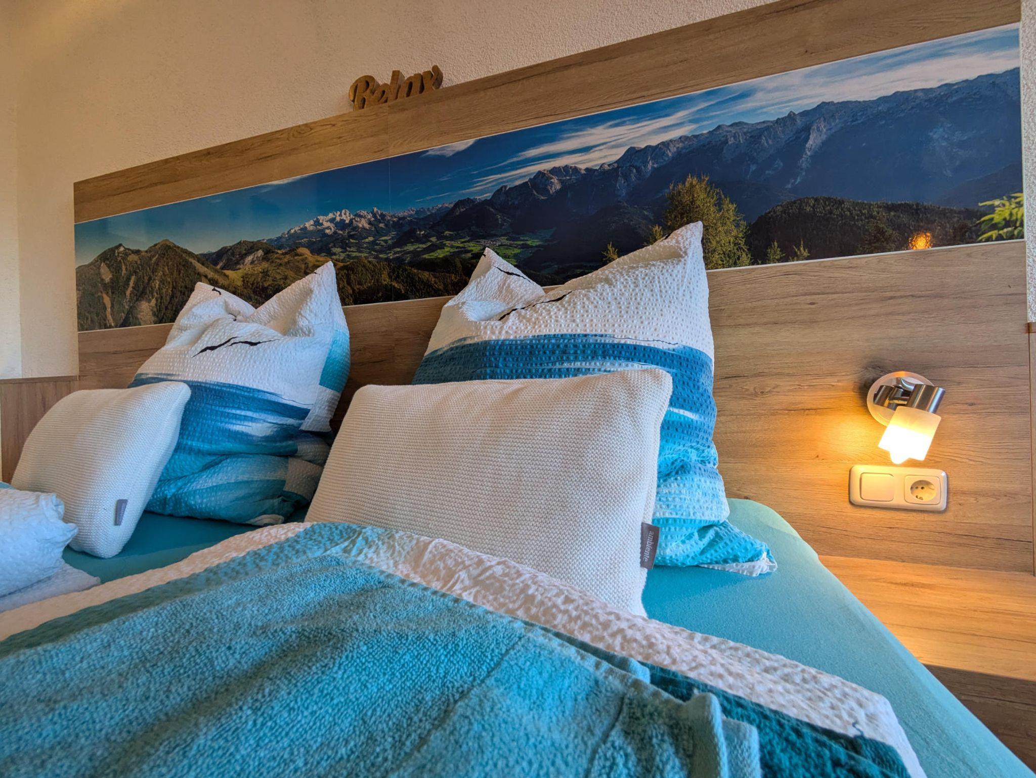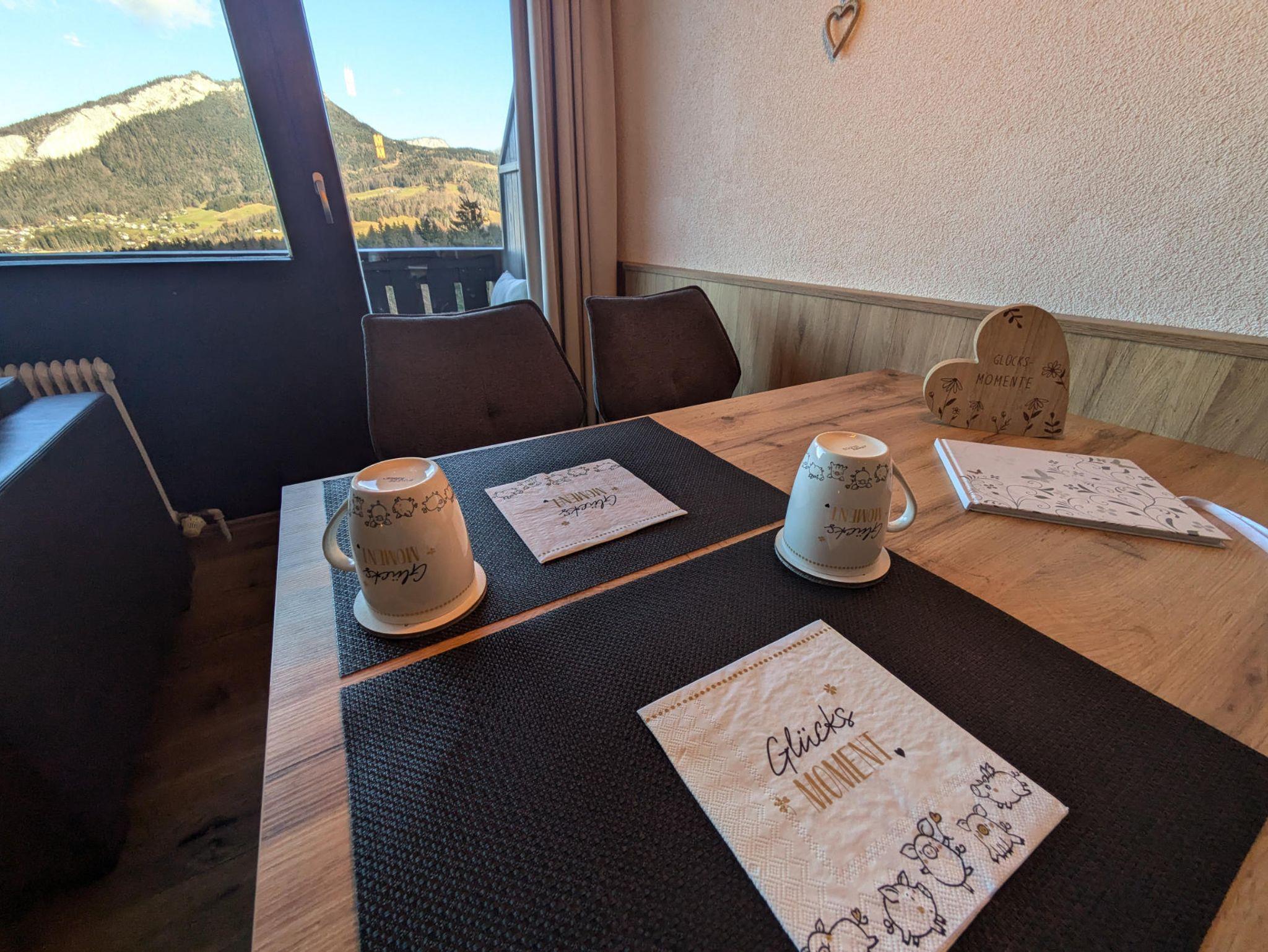 Die Ferienwohnung besticht durch ihre moderne Einrichtung mit viel Holz, die eine warme und gemütliche Atmosphäre schafft. Ein besonderes Highlight ist das liebevoll gestaltete Schlafzimmer: Hinter dem Bett befinden sich Bilder der beeindruckenden Goiserer Berge – ein Gefühl, als würdest du direkt in den Alpen schlafen und morgens mit dem Blick auf den Predigstuhl aufwachen.