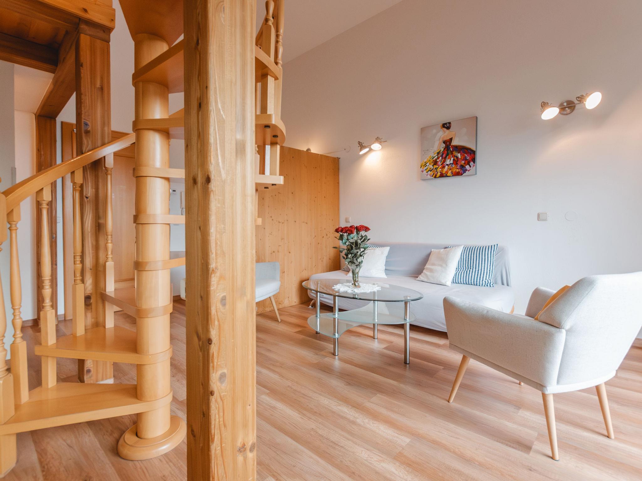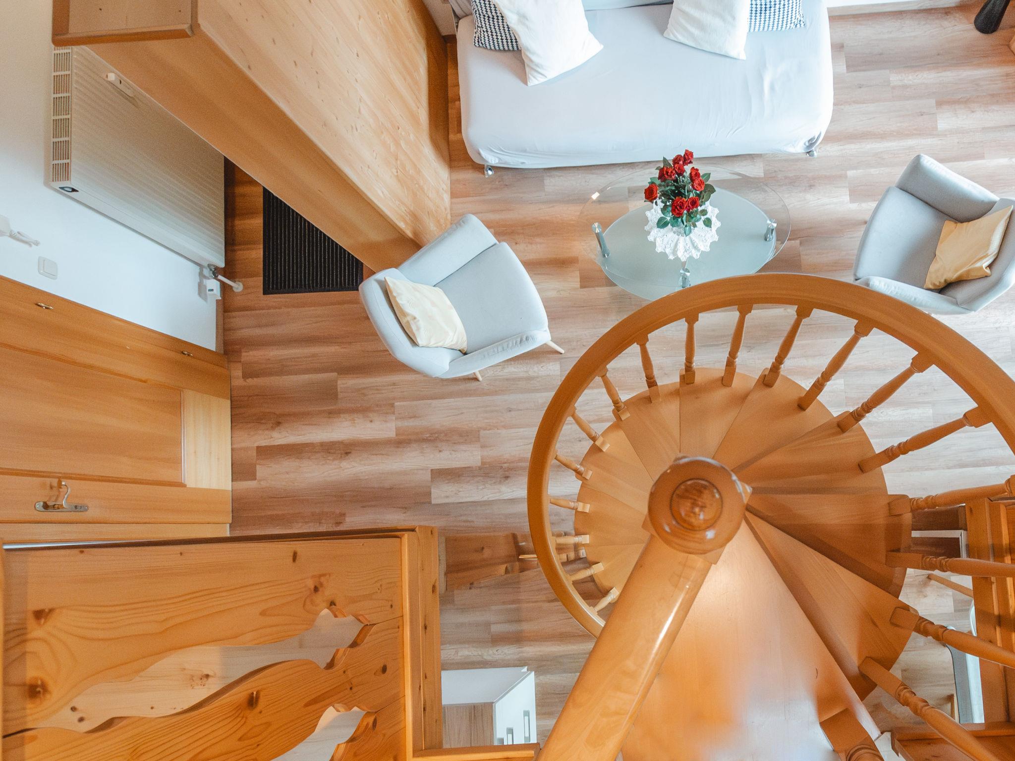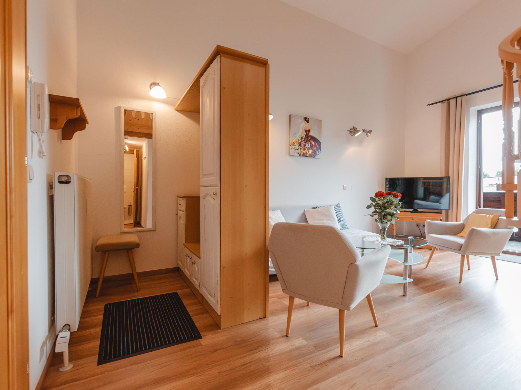 "Anna-Katharina", 1-room apartment 53 m2 on 2nd floor. Object suitable for 2 adults + 2 children. Spacious and bright, very modern and cosy furnishings: entrance hall. Open gallery 17 m2 with 1 double bed. Living/dining room 36 m2 with panoramic window with 1 double sofabed, dining table and cable TV (flat screen). Exit to the balcony. Open kitchen (oven, dishwasher, 4 ceramic glass hob hotplates, toaster, kettle, microwave, electric coffee machine). Shower, sep. WC. Wooden floors. Balcony 10 m2. Balcony furniture. Very beautiful panoramic view of the mountains. Facilities: hair dryer. Internet (WiFi, free). Parking space n 7. Please note: suitable for families. Non-smokers only. Smoke alarm, no lift. The electric coffee machine is a Cafissimo. Instead of an enclosed bedroom, some sleeping areas are located in an open-plan area (gallery, alcove, etc.). 50402-000674-2020