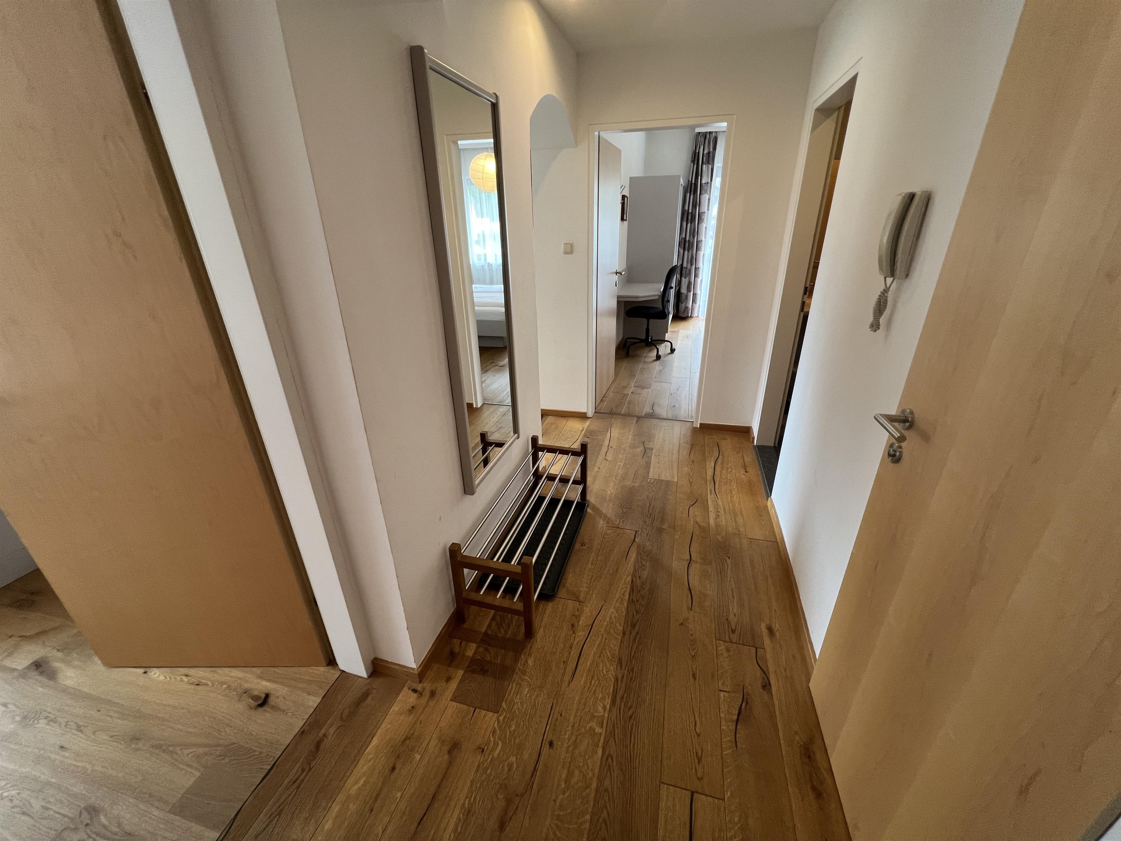 Das Appartement besteht aus einem Wohnraum mit Sitzcouch und Kochnische, einem Schlafraum mit Doppelbett, einem Schlafraum mit Doppelbett und einer Schlafcouch, Vorraum, Dusche/WC und Balkon.