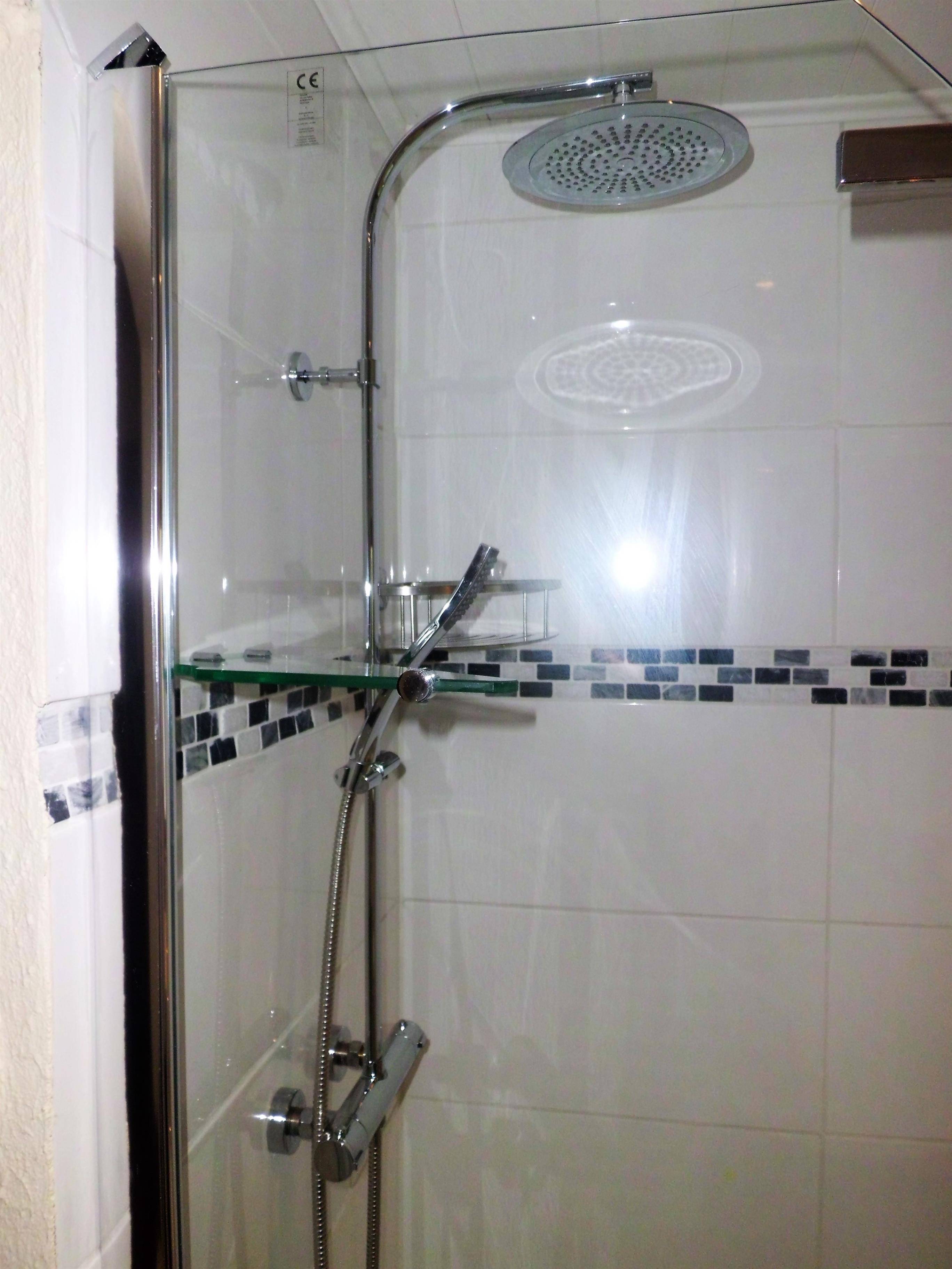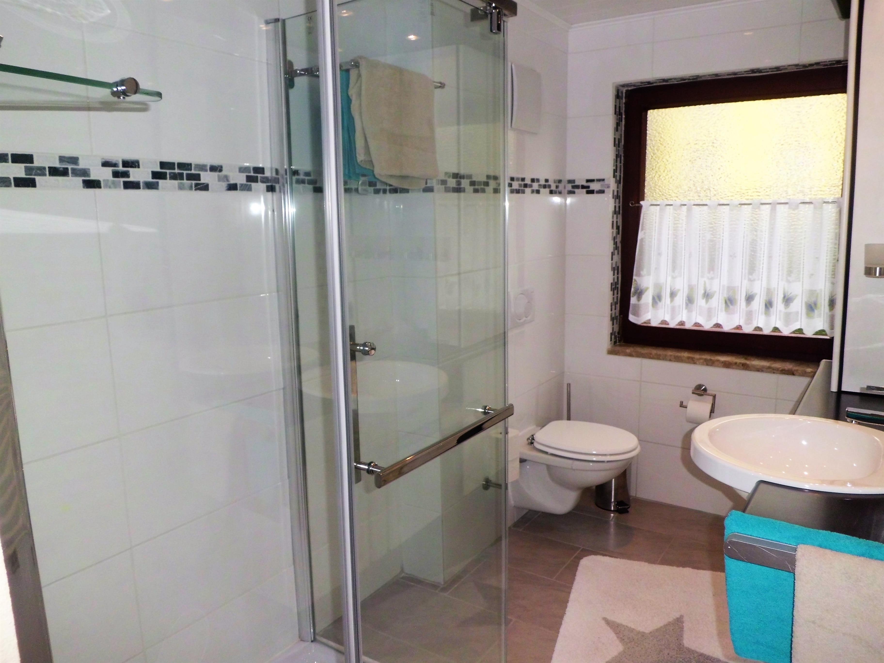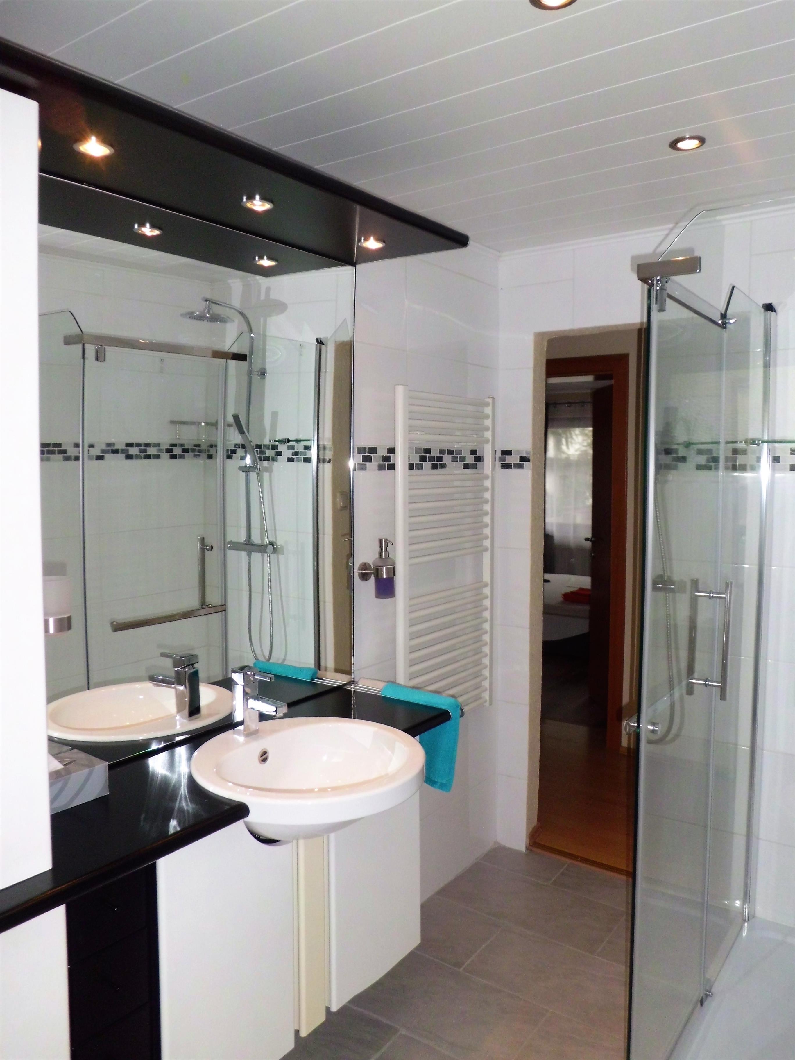 Das Bad ist sehr modern gehalten und hat eine grosse Dusche, sowie eine schöne Waschtischgarnitur und WC.