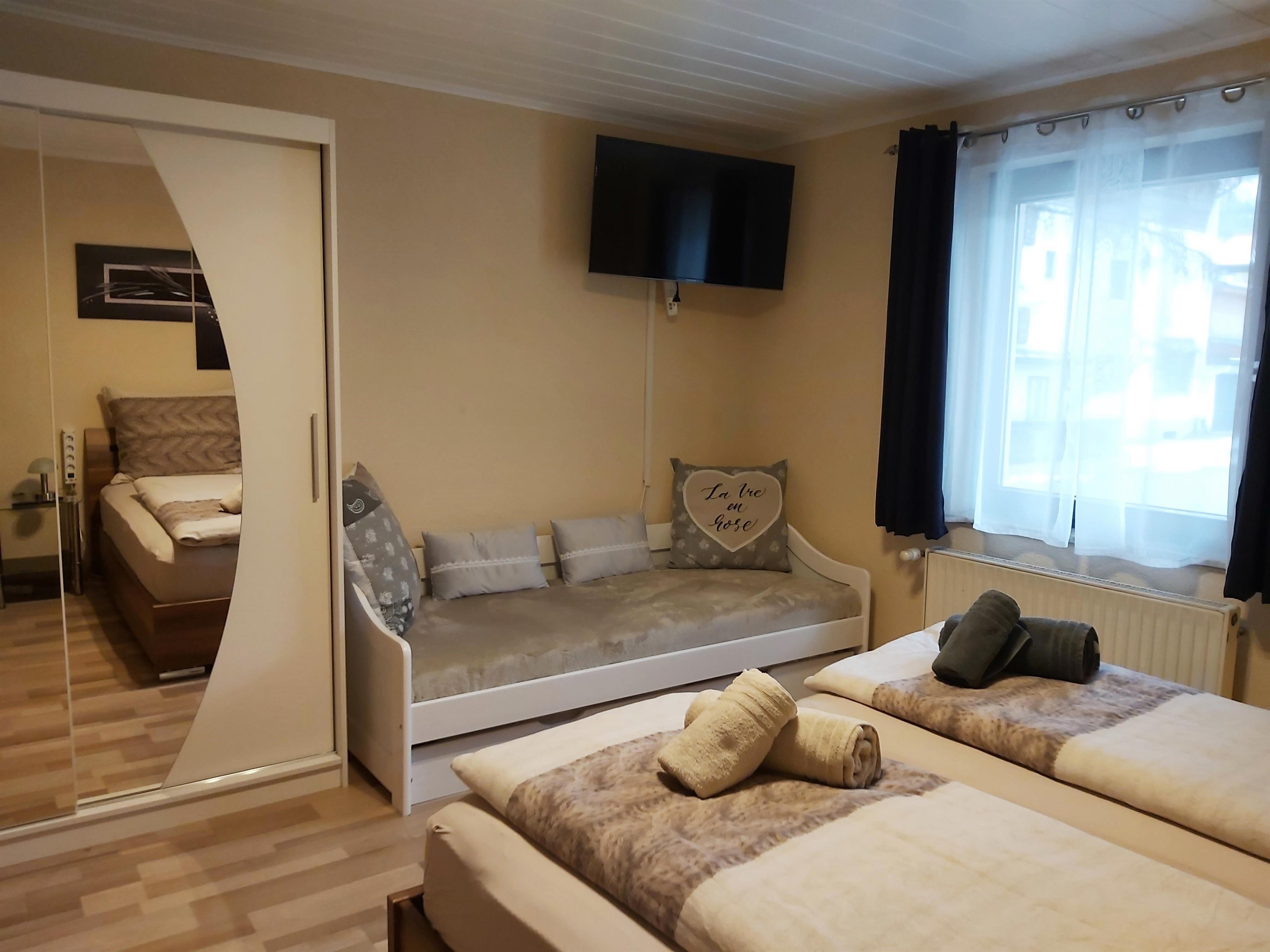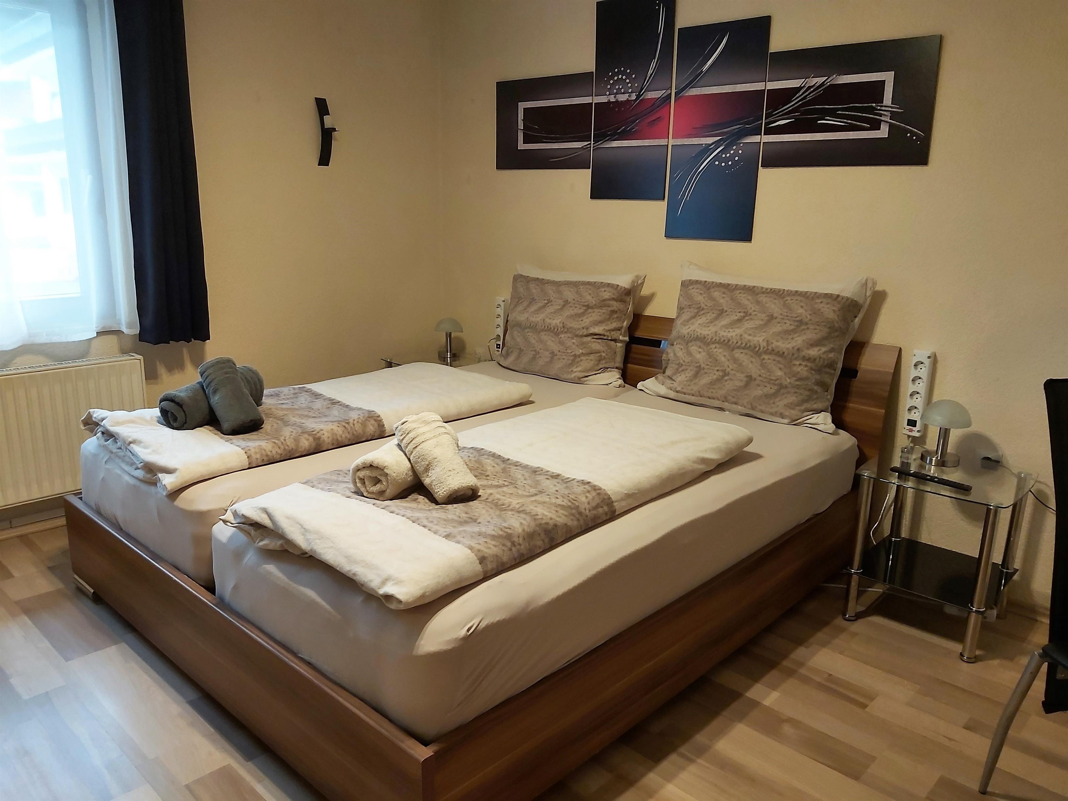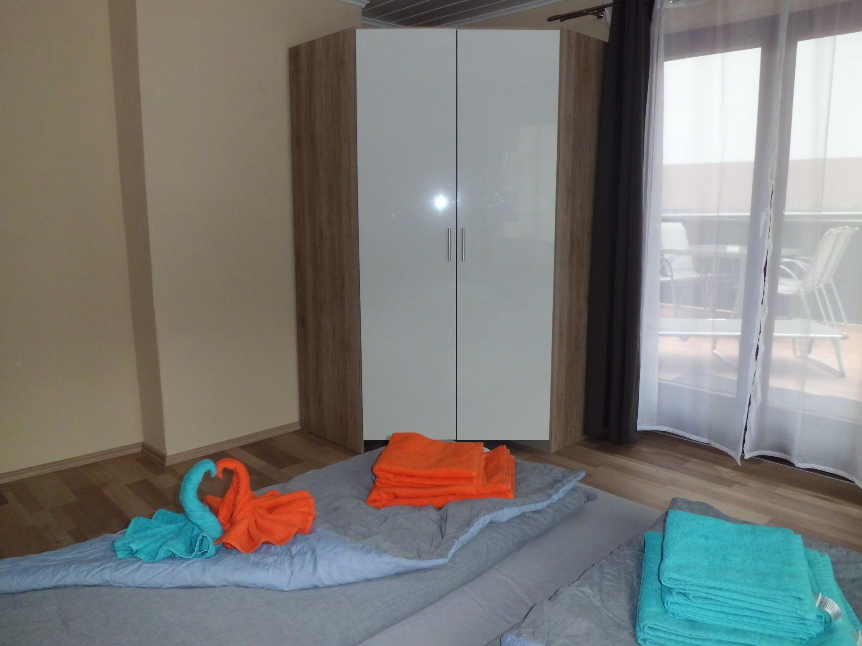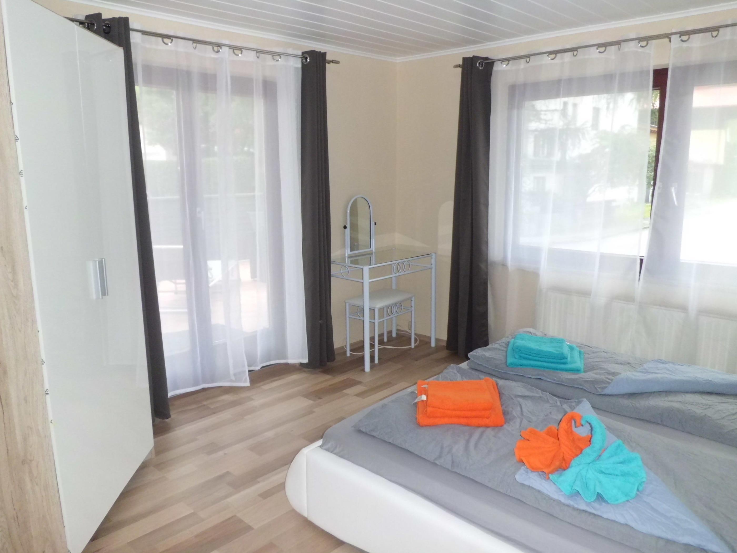 Die 2 Schlafzimmer sind mit Doppelbetten, Kleiderschrank, Herrendiener und Fernseher ausgestattet. Ein Schlafzimmer verfügt zudem über einen Schreibtisch, das andere über einen Schminktisch.