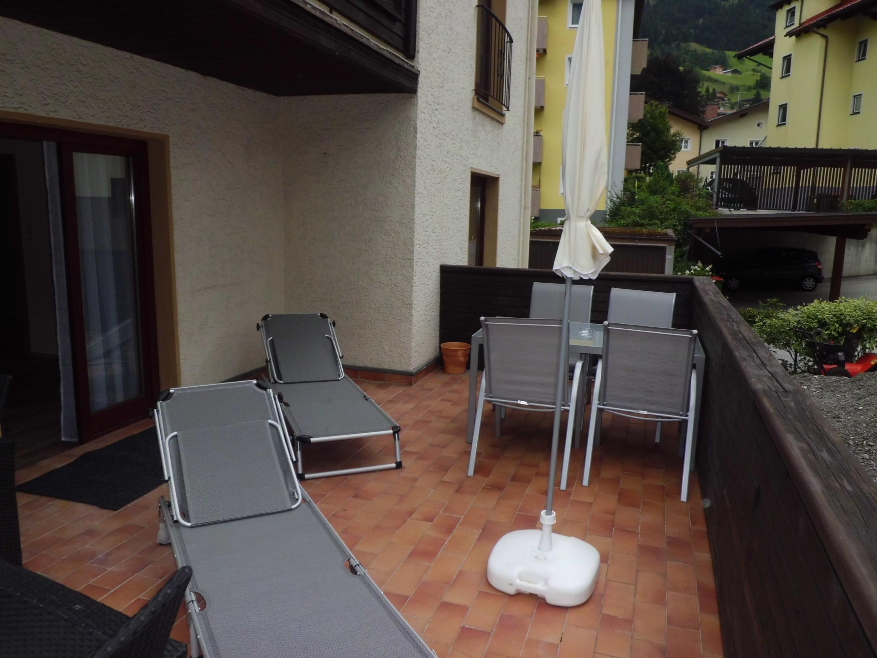 Die 20 qm große Terasse verfügt über eine Sitzgarnitur, Sonnenliegen und Sonnenschirm.