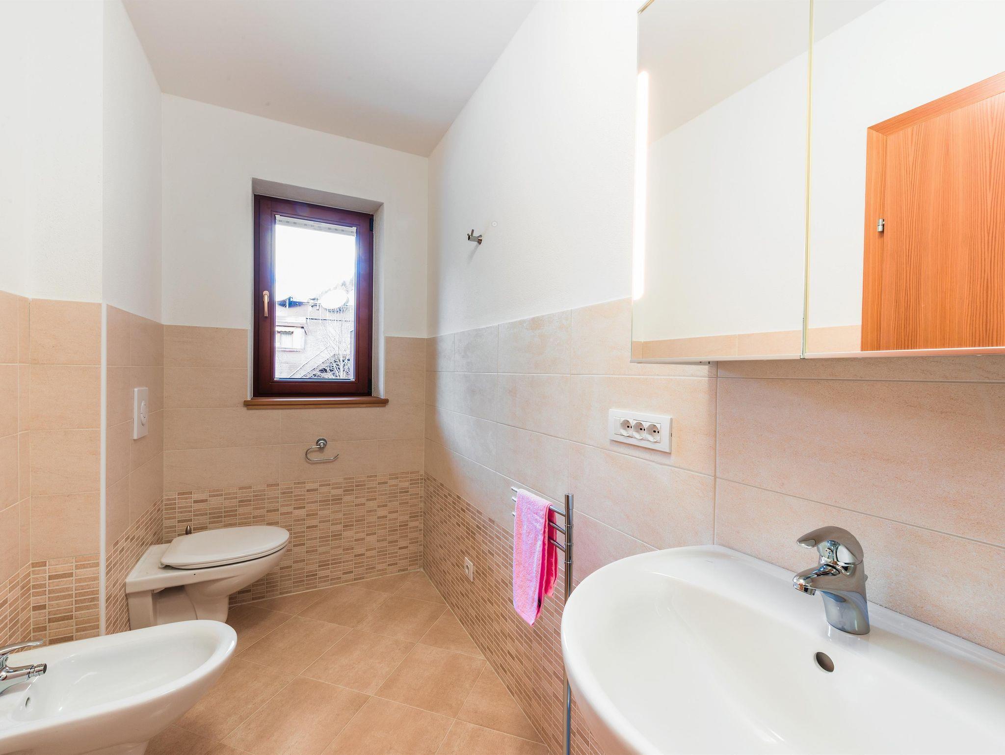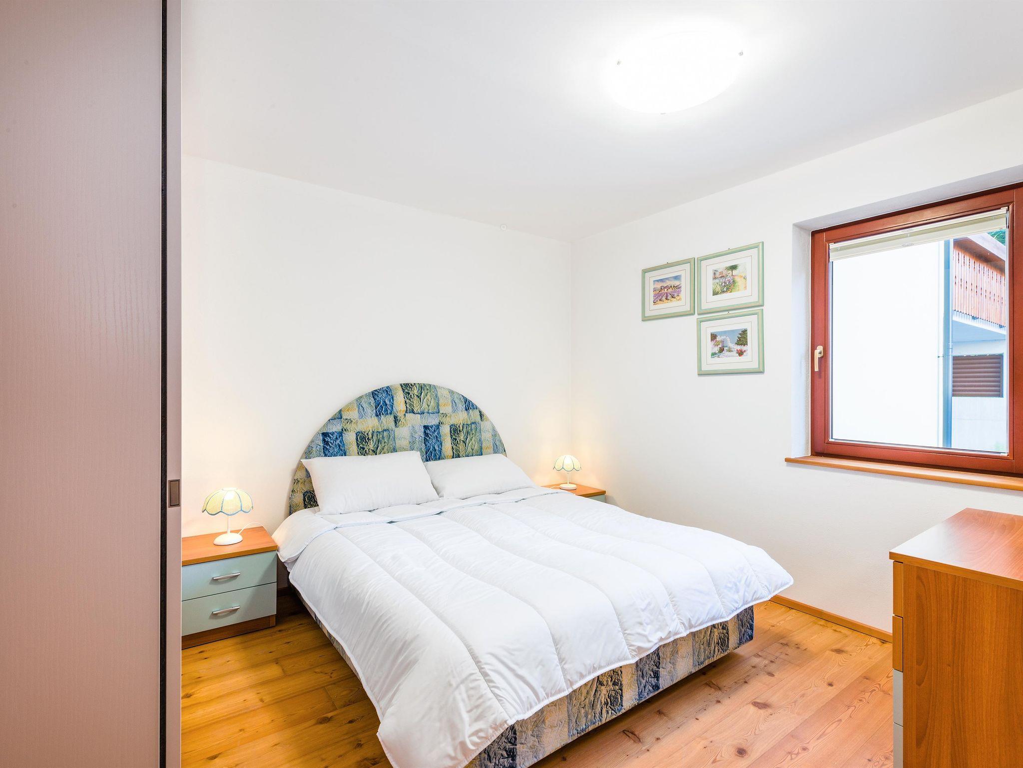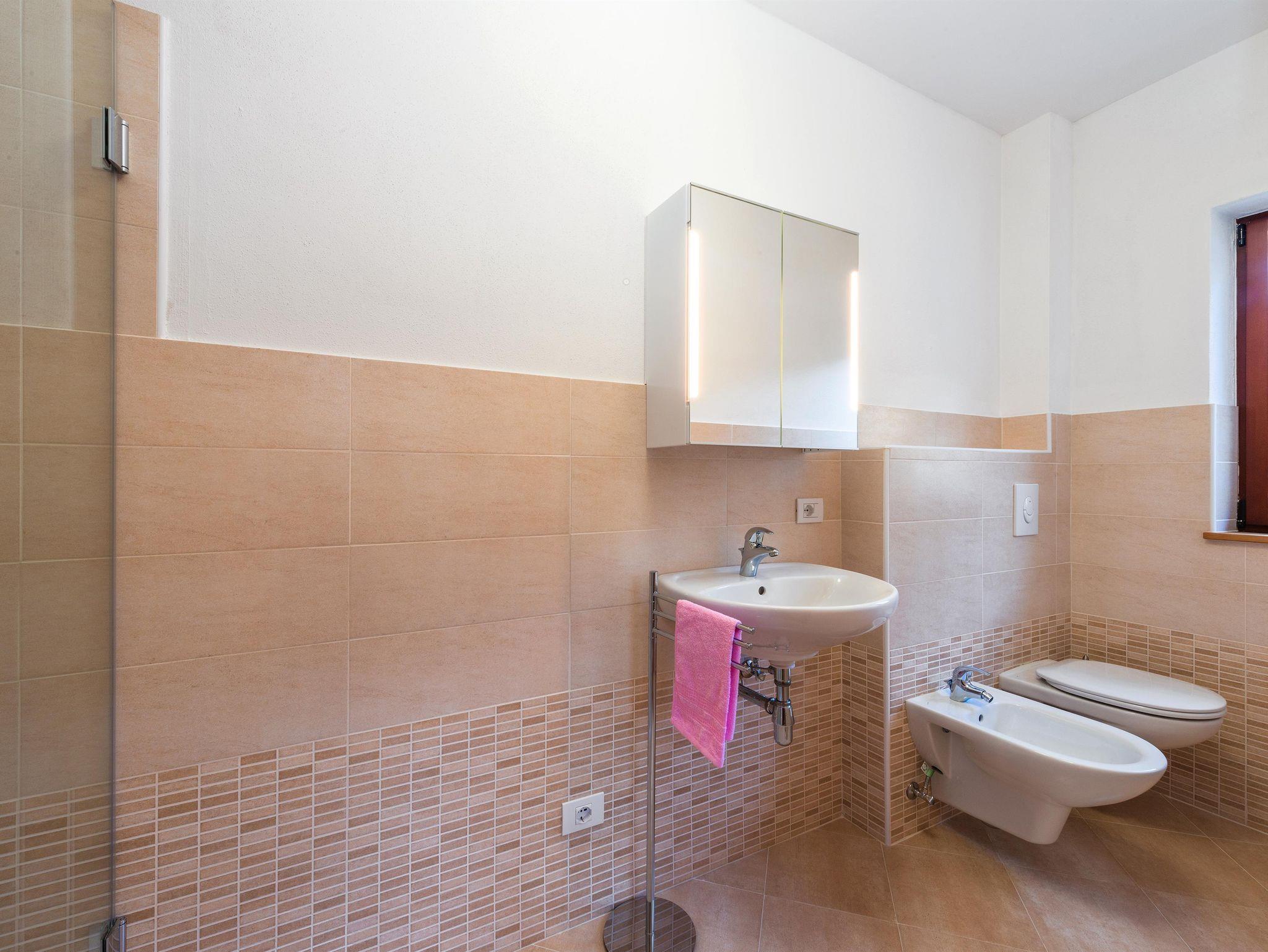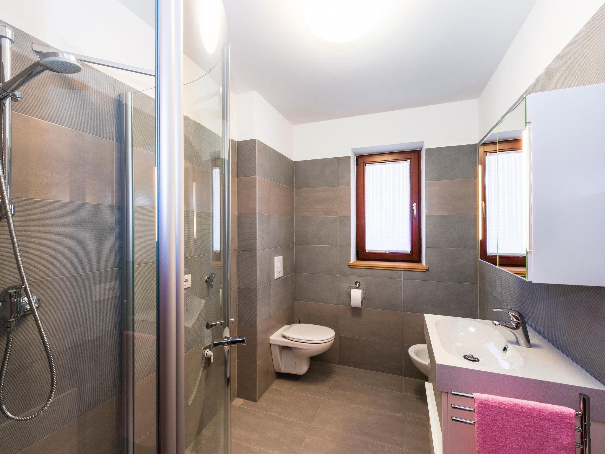 Badezimmer (Dusche/WC/Bidet), ein Schlafzimmer mit Doppelbett und Badezimmer (Dusche/WC/Bidet) im Zimmer und Balkon. Zwei überdachte Autoabstellplätze und einen Schistall.