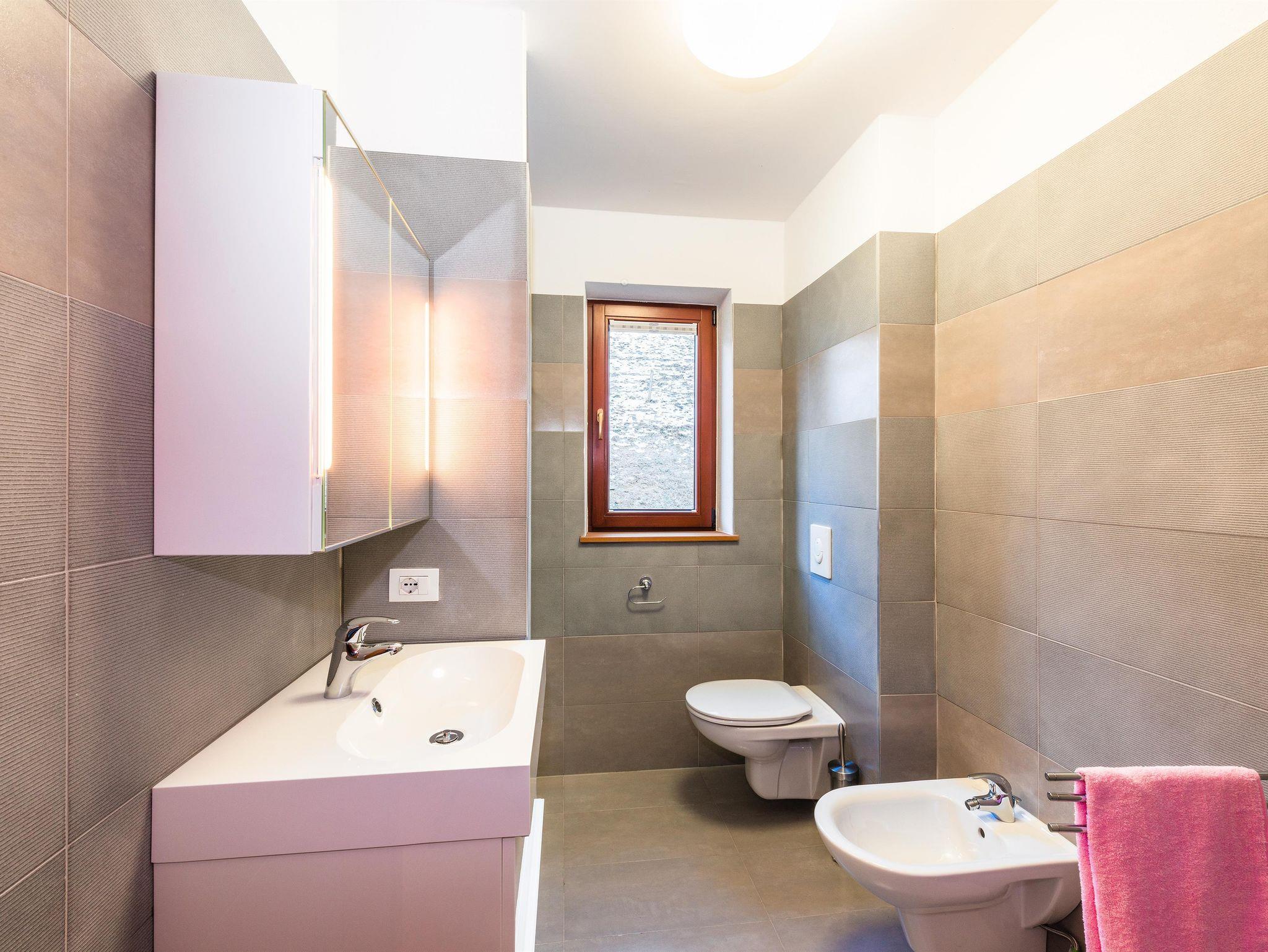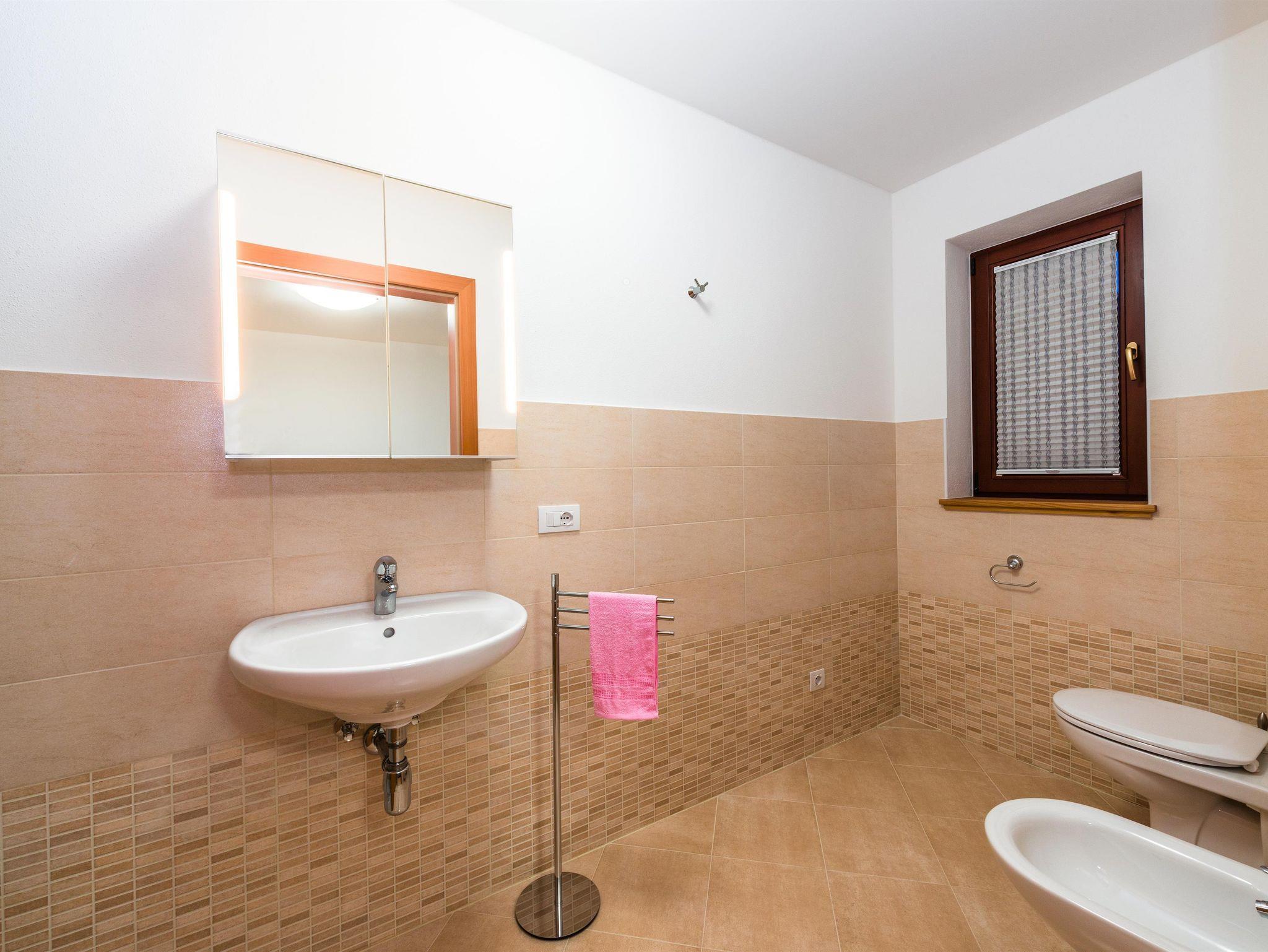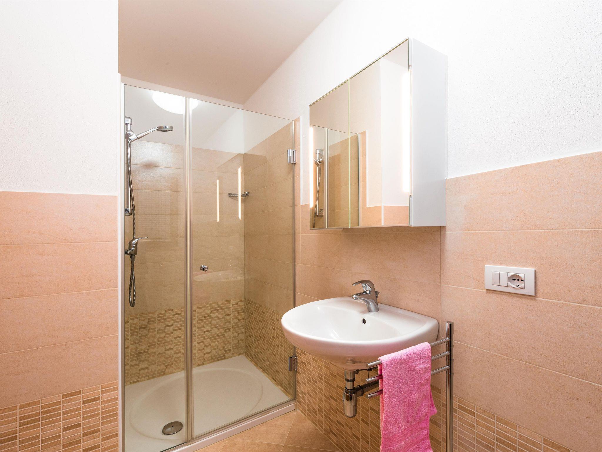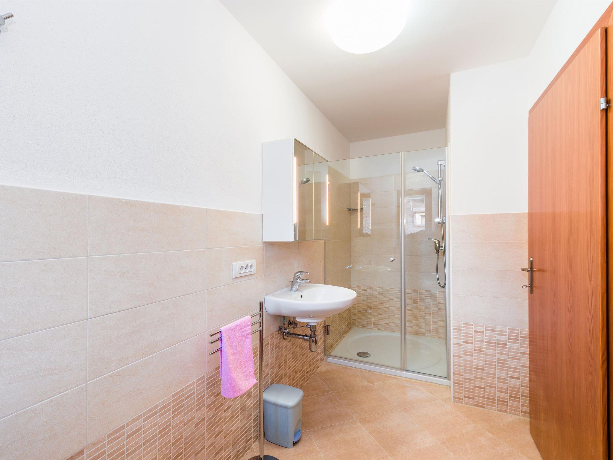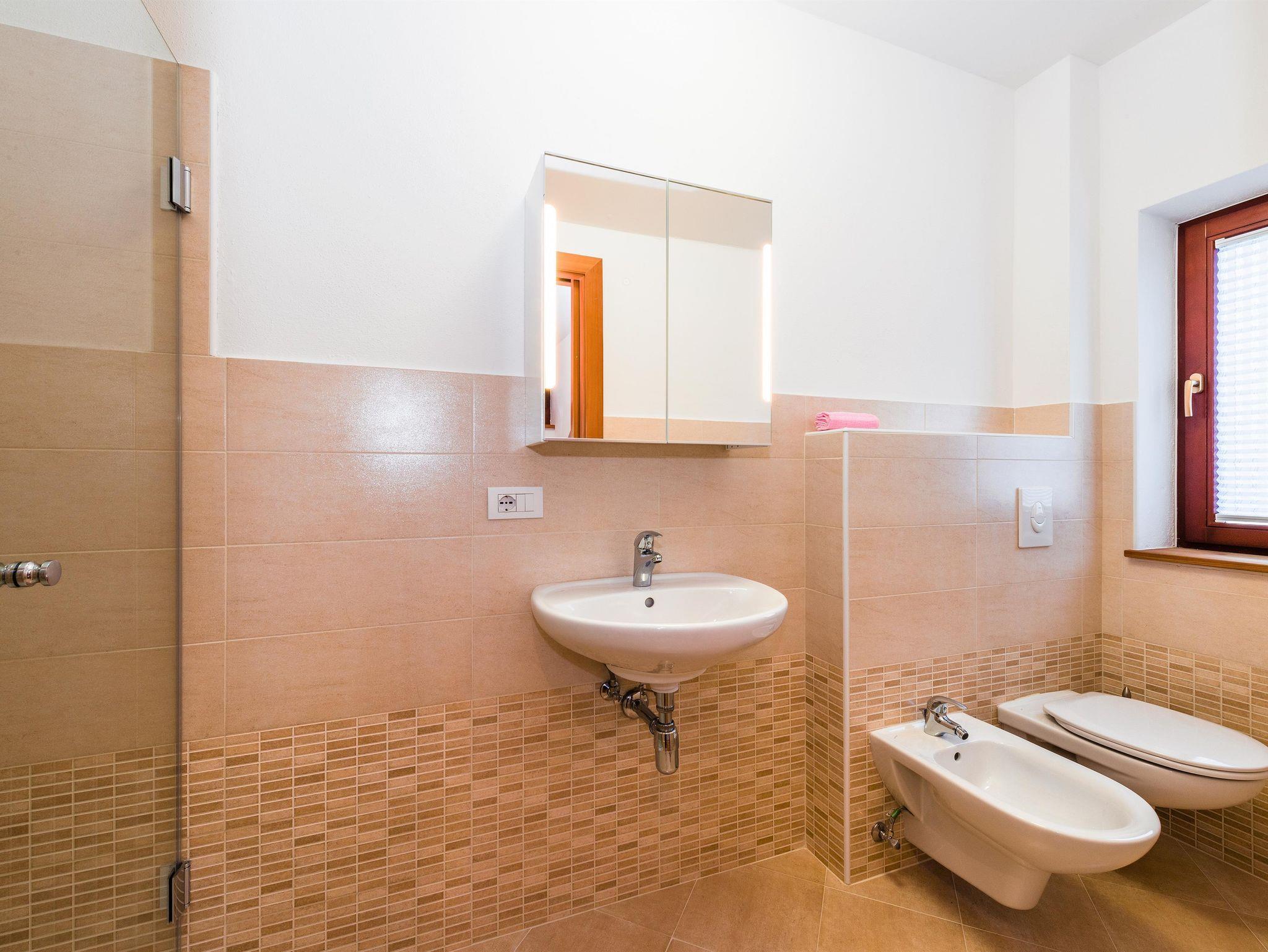 Badezimmer (Dusche/WC/Bidet), ein Schlafzimmer mit Doppelbett und Badezimmer (Dusche/WC/Bidet) im Zimmer und Balkon. Zwei überdachte Autoabstellplätze und einen Schistall.