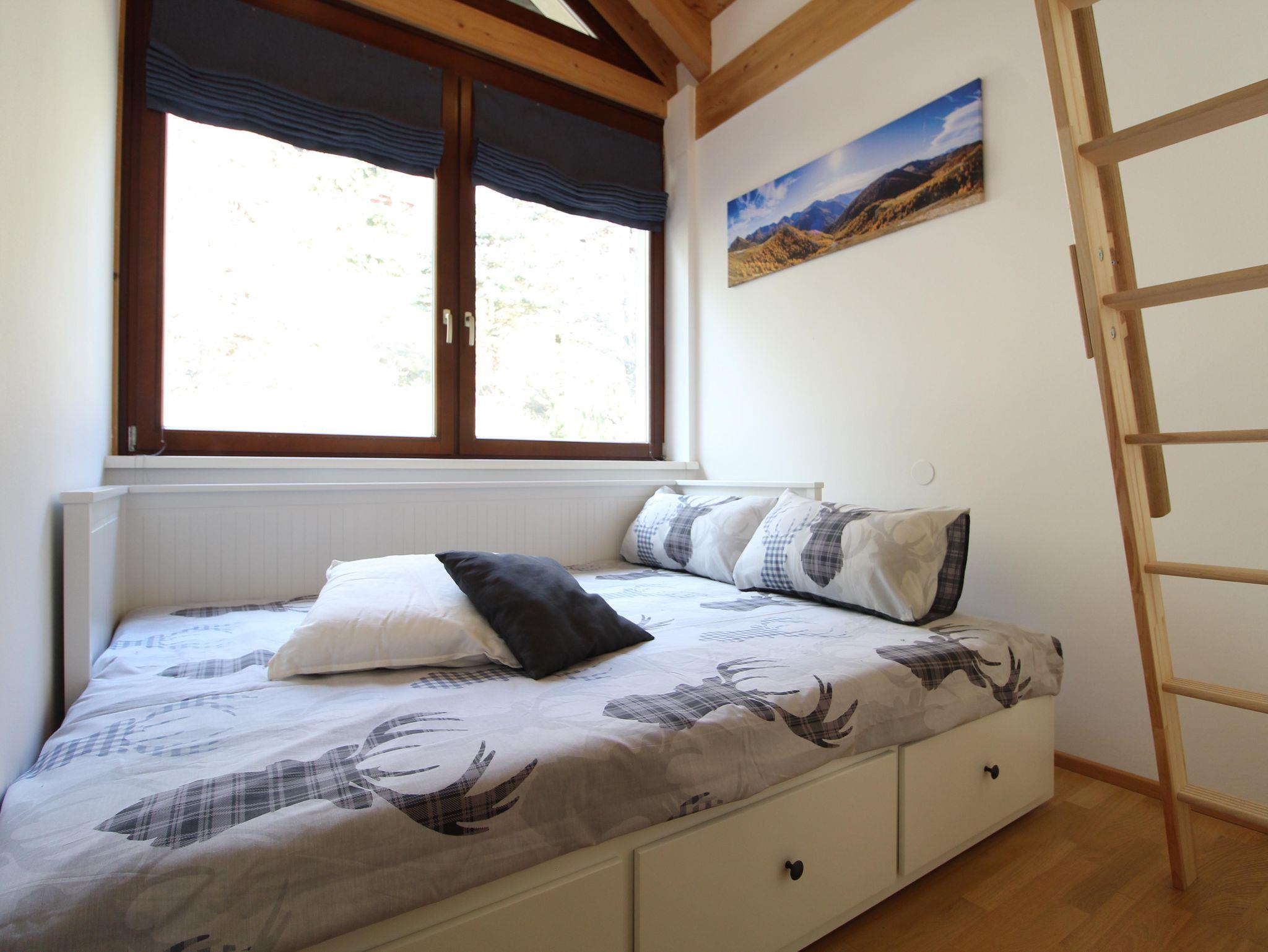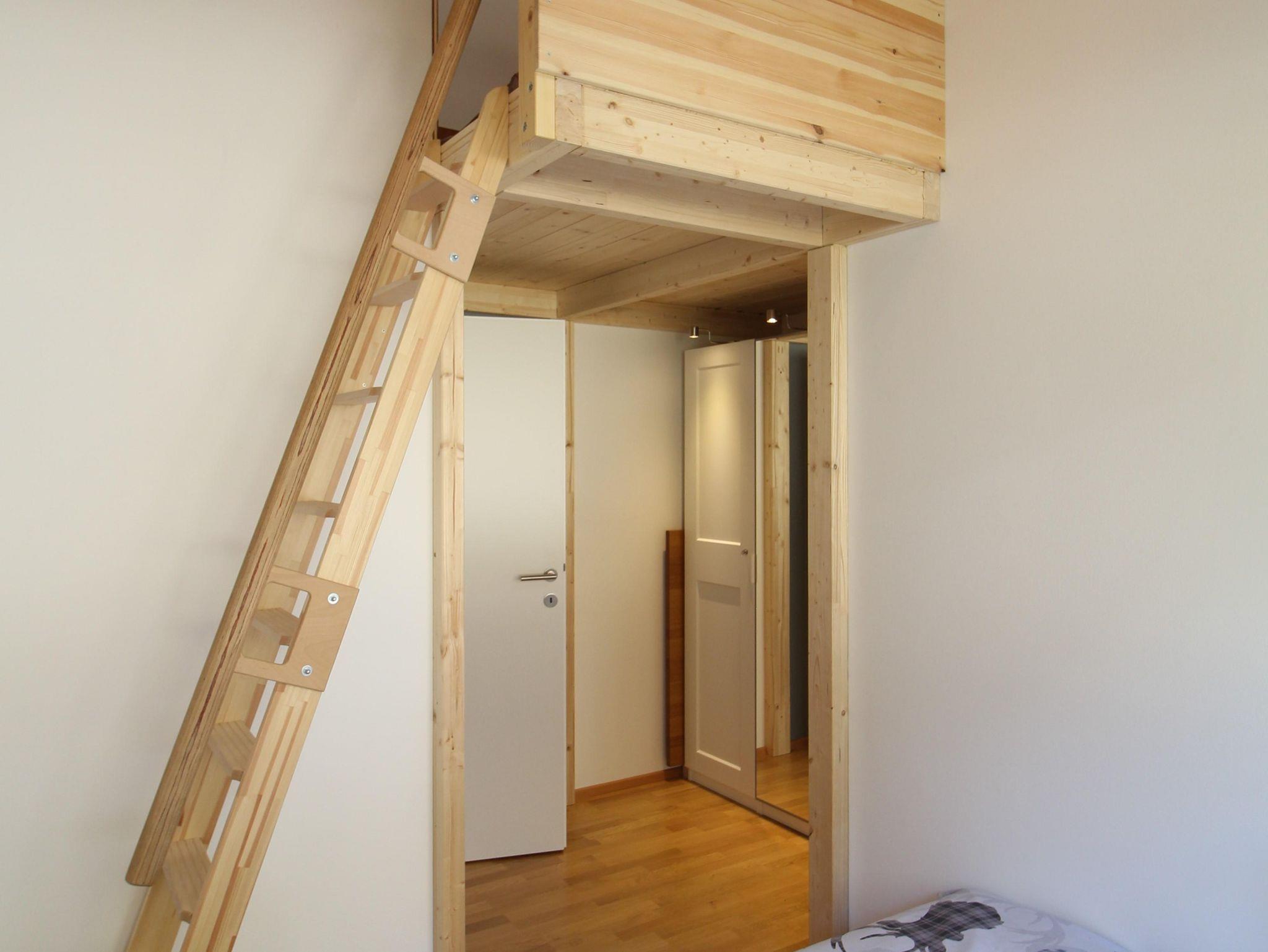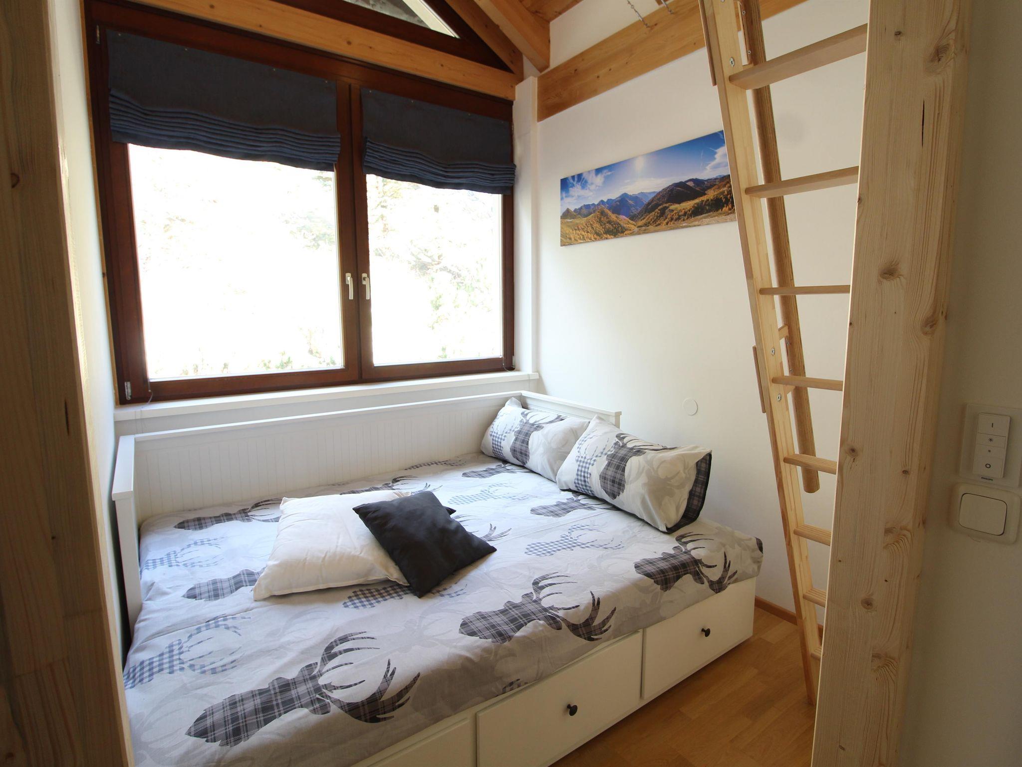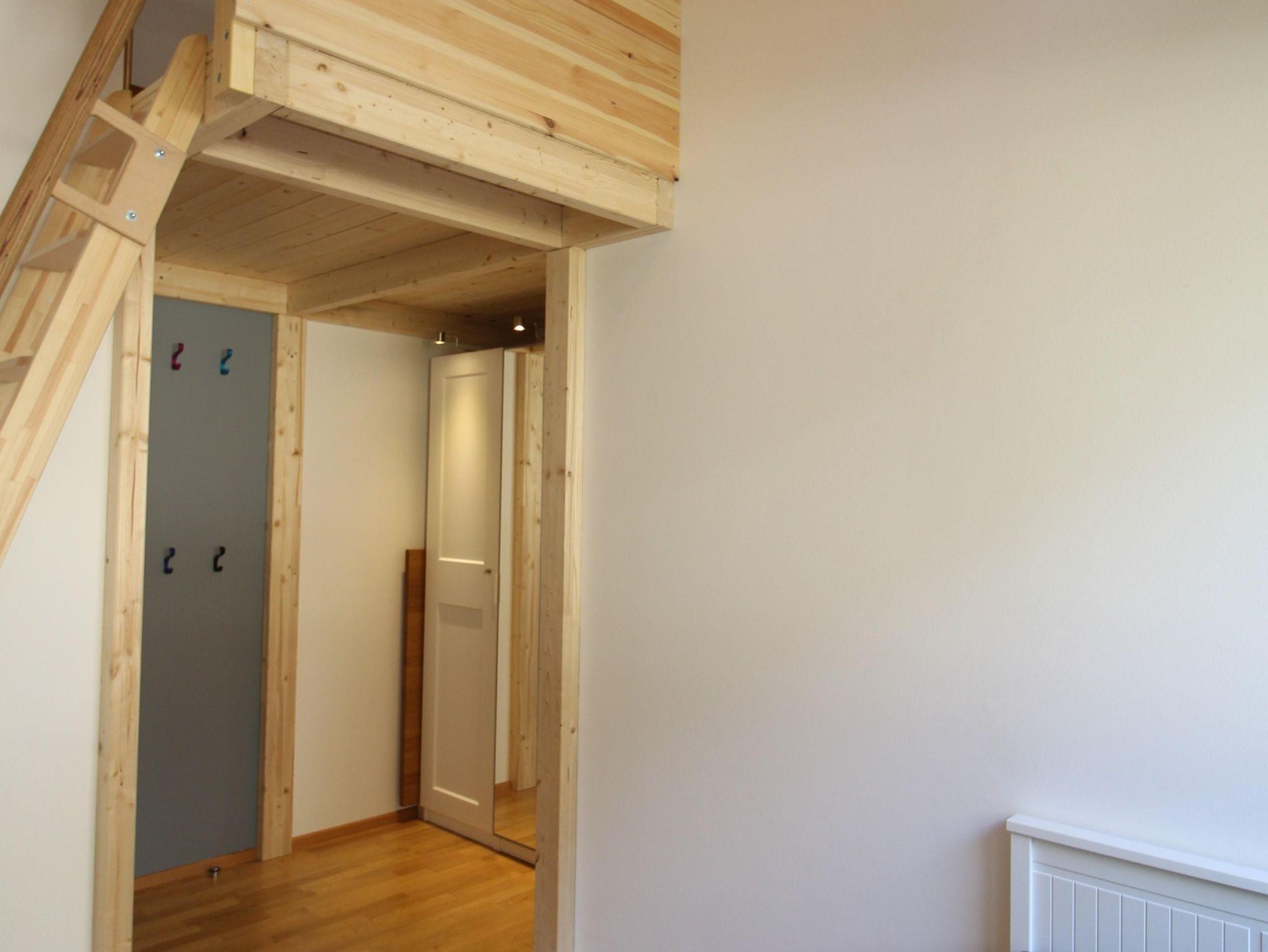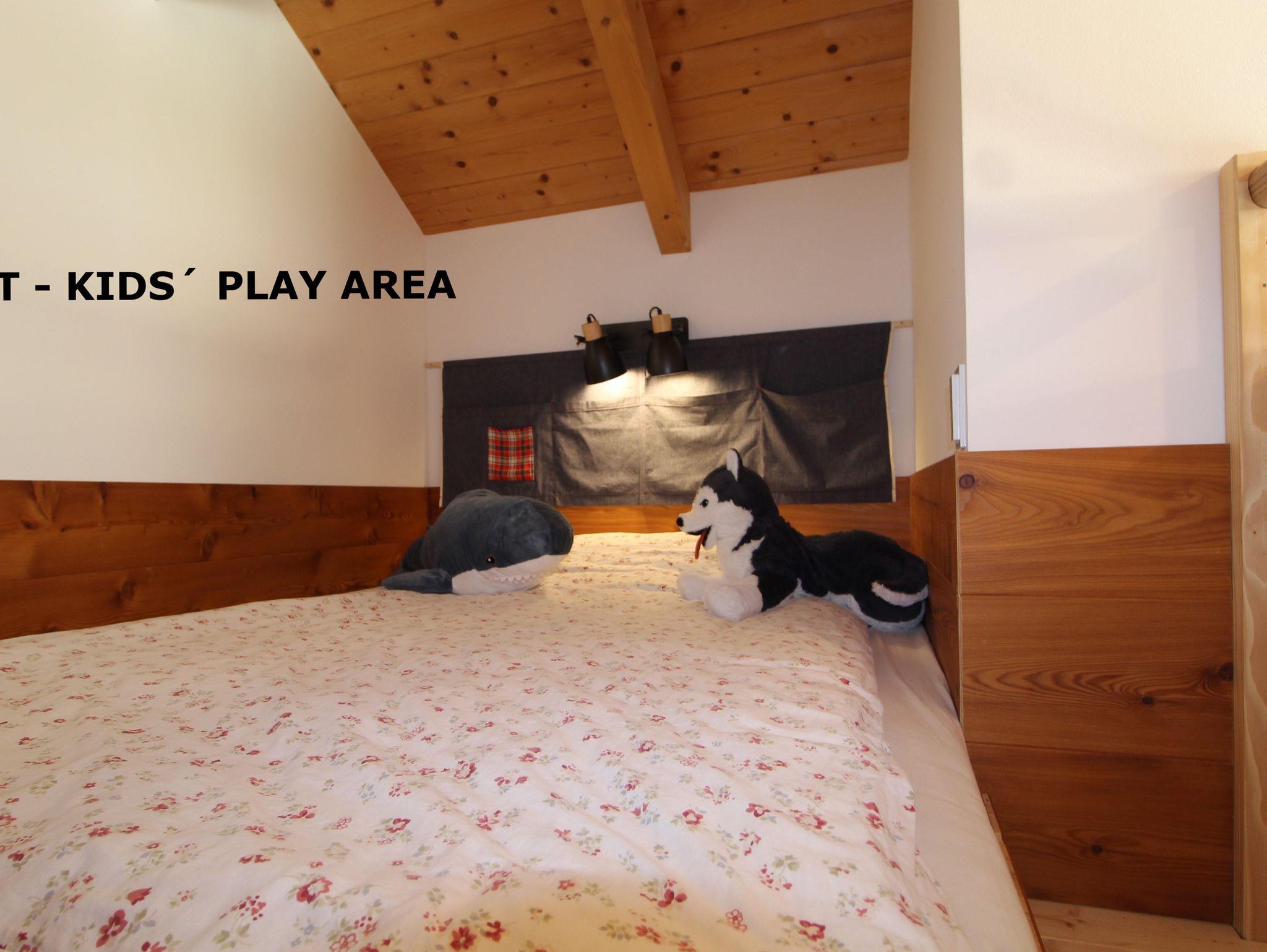 Hervorragende komfortable Wohnung auf zwei Ebenen. Am Eingang eine Garderobe mit Skiraumecke und Schuhwärmer sowie ein WC, ein Doppelzimmer mit Balkon und en-suite Bad mit Dusche. Eine Treppe führt in die obere Ebene, wo in einem großen offenen Raum die völlig ausgestattete Küche, der Esstisch und der Ruhebereich mit Sofa und TV Platz finden. Im Schlafbereich ein Schlafzimmer mit Doppelbett, ein Badezimmer mit Jacuzzi, Dusche und Waschmaschine, eine separate Toilette und das Kinderzimmer, mit einem Einzelbett, das zum Doppelbett wird, und einem wunderschönen Zwischengeschoss zum Spielen. Drei Außenparkplätze.