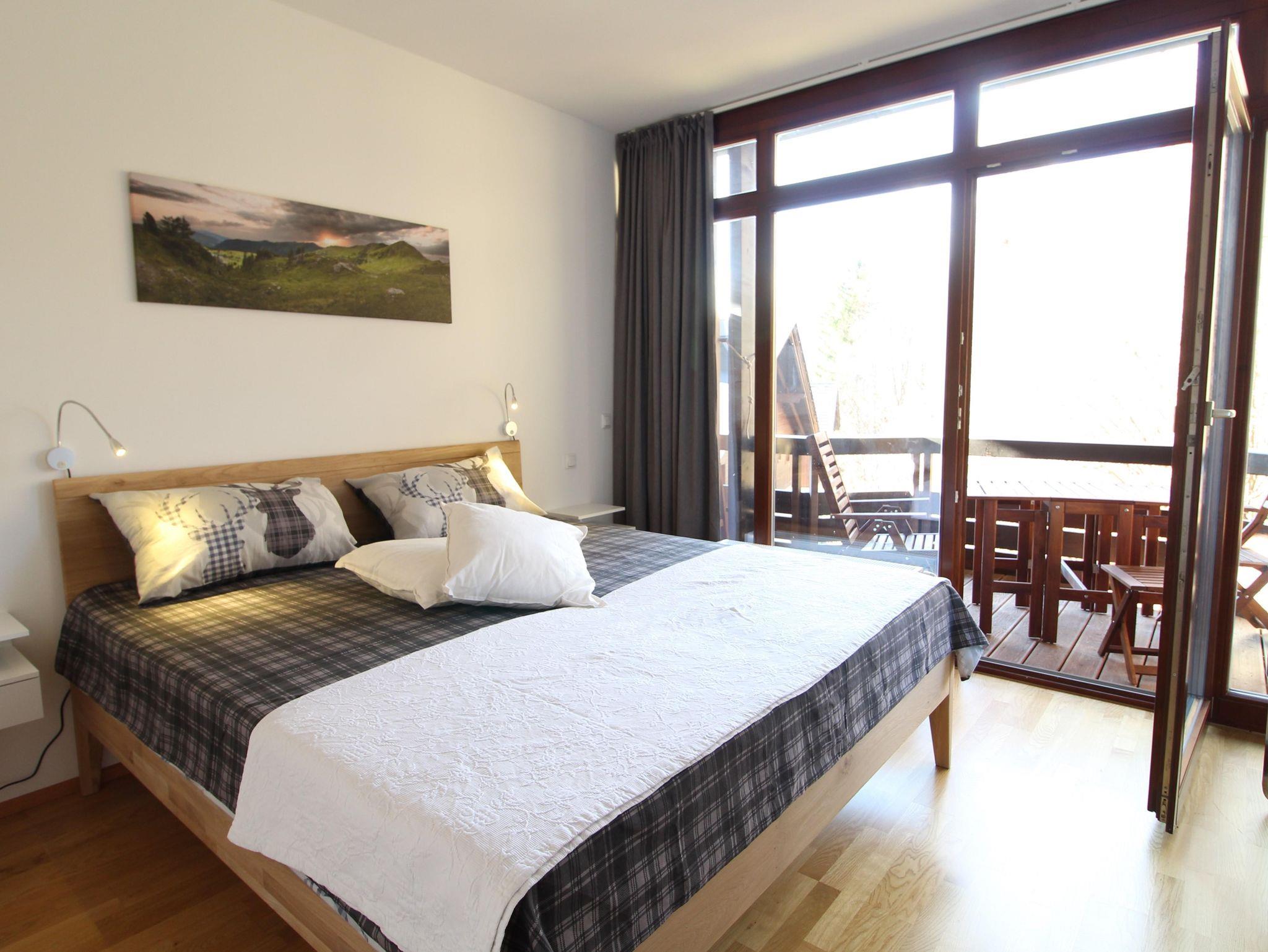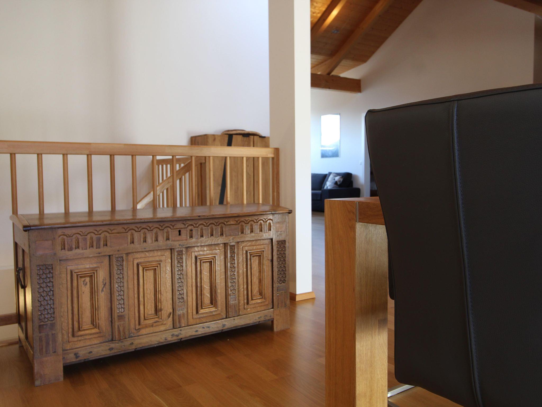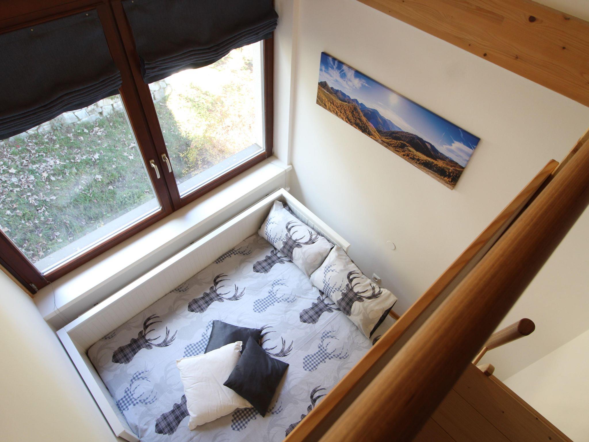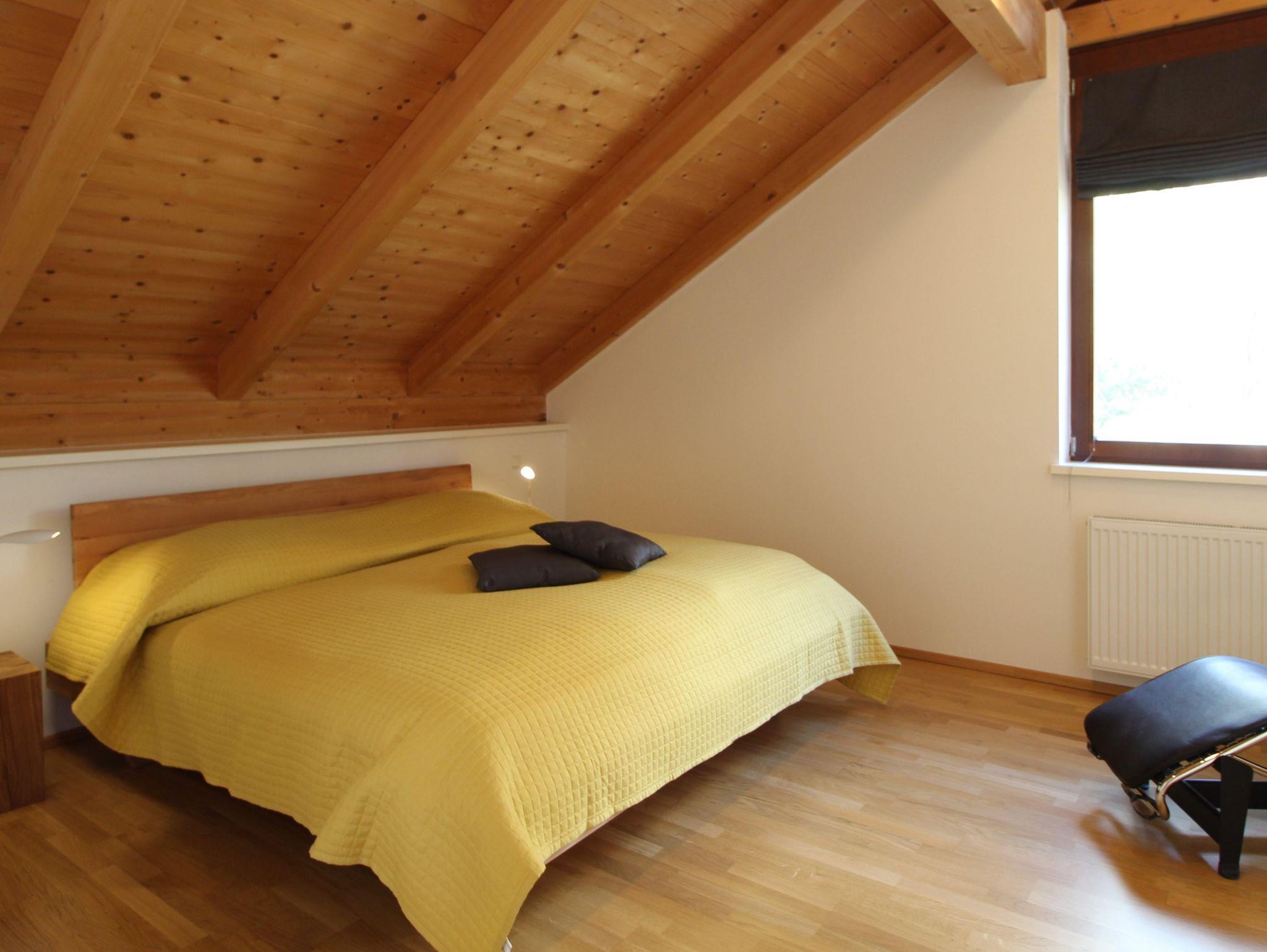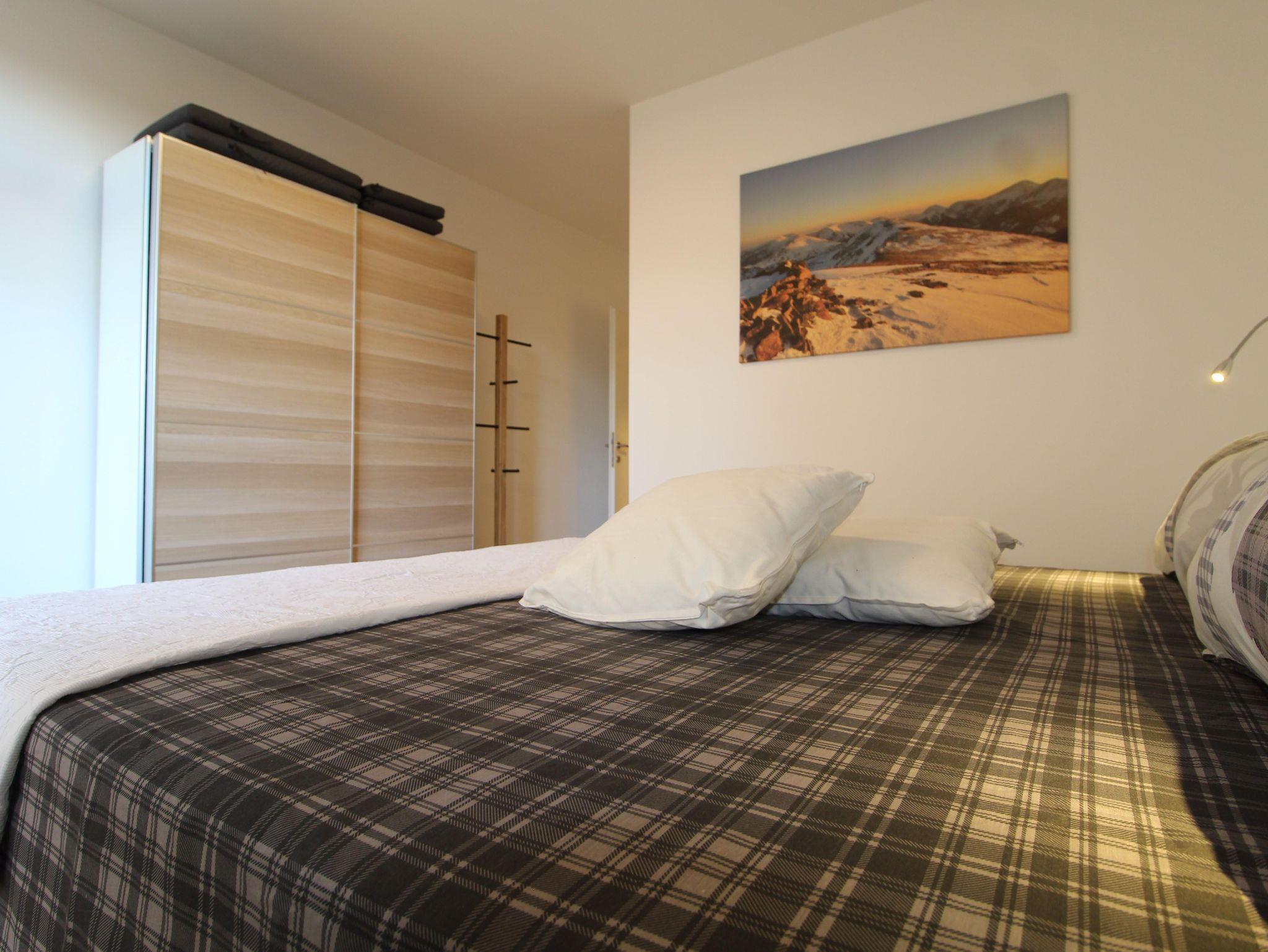 Hervorragende komfortable Wohnung auf zwei Ebenen. Am Eingang eine Garderobe mit Skiraumecke und Schuhwärmer sowie ein WC, ein Doppelzimmer mit Balkon und en-suite Bad mit Dusche. Eine Treppe führt in die obere Ebene, wo in einem großen offenen Raum die völlig ausgestattete Küche, der Esstisch und der Ruhebereich mit Sofa und TV Platz finden. Im Schlafbereich ein Schlafzimmer mit Doppelbett, ein Badezimmer mit Jacuzzi, Dusche und Waschmaschine, eine separate Toilette und das Kinderzimmer, mit einem Einzelbett, das zum Doppelbett wird, und einem wunderschönen Zwischengeschoss zum Spielen. Drei Außenparkplätze.