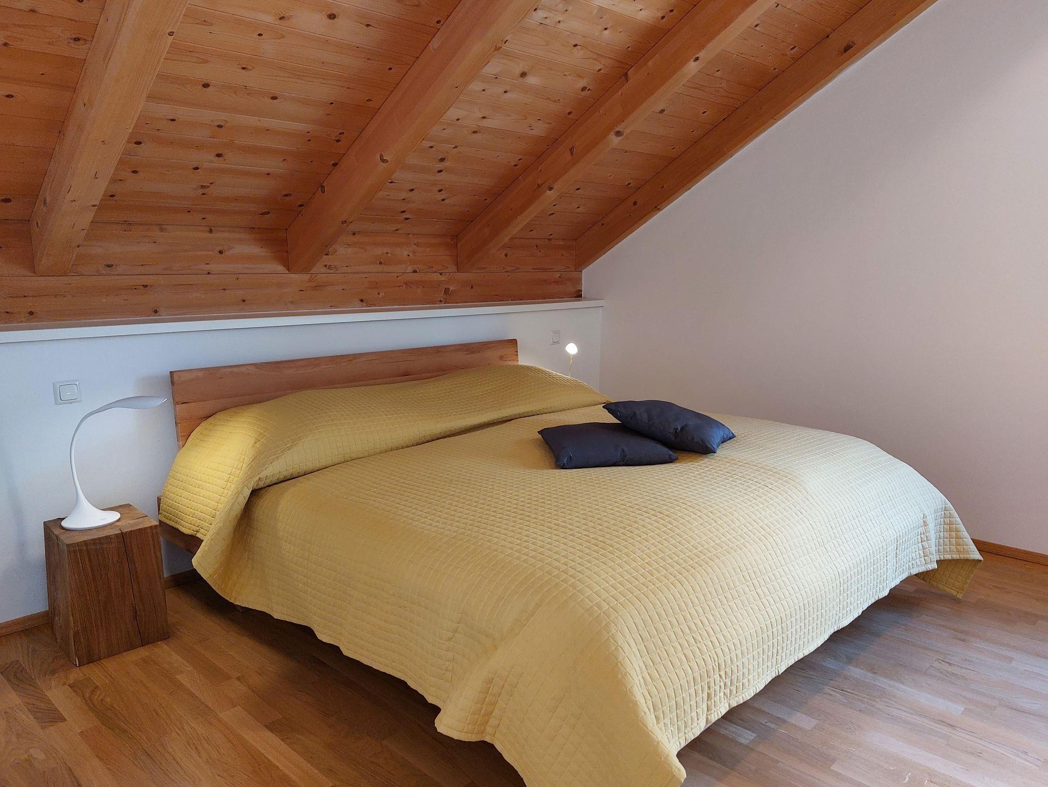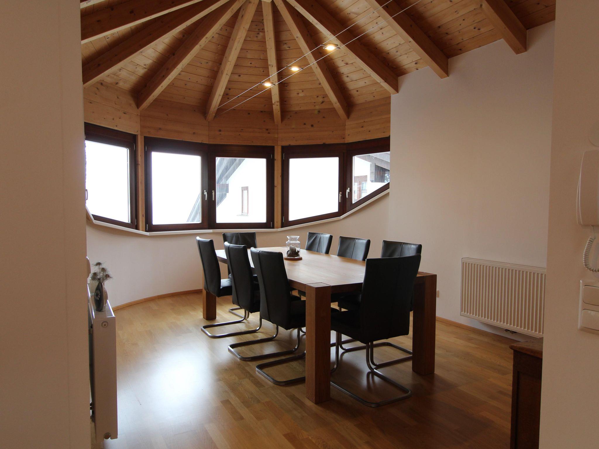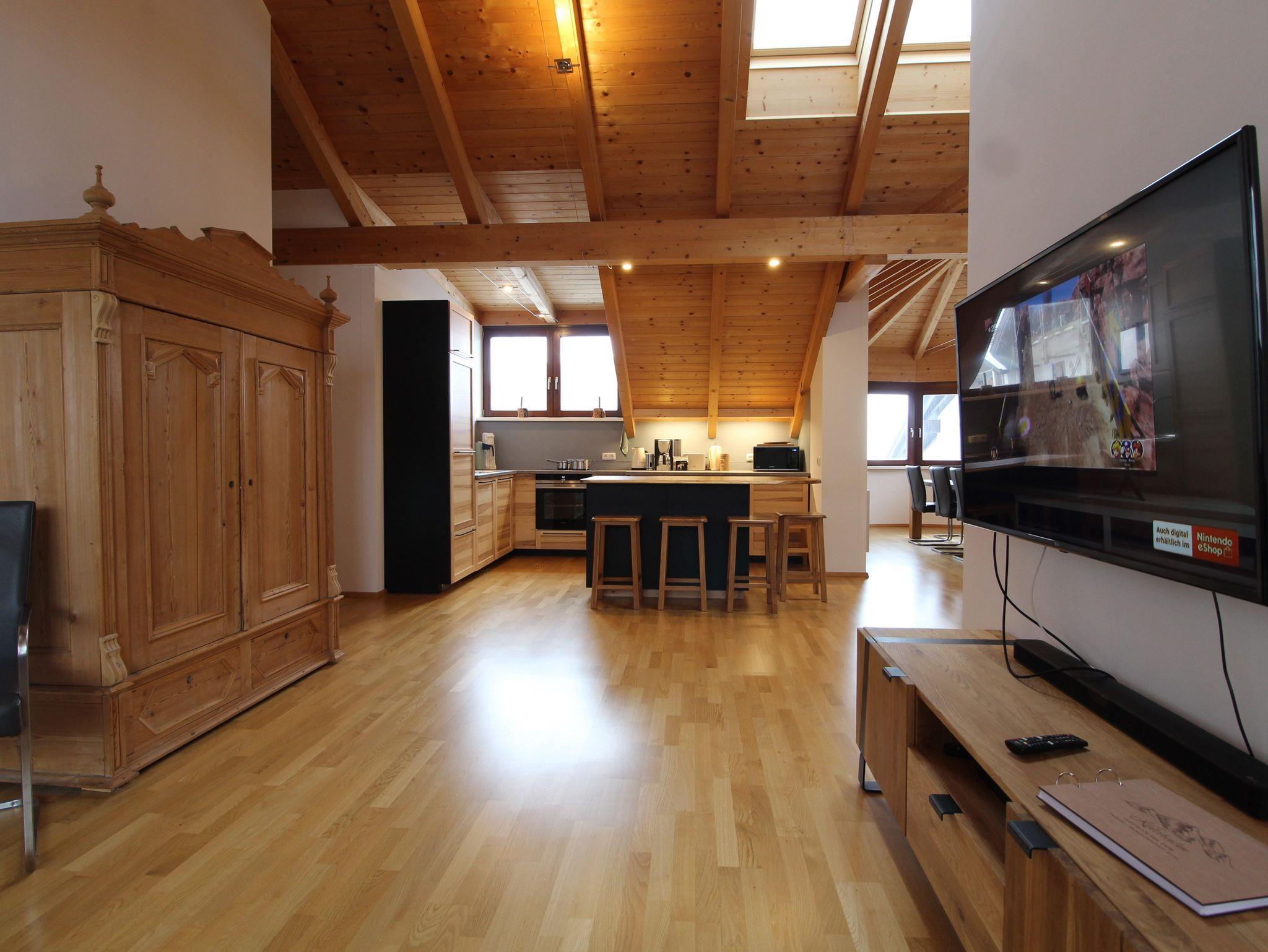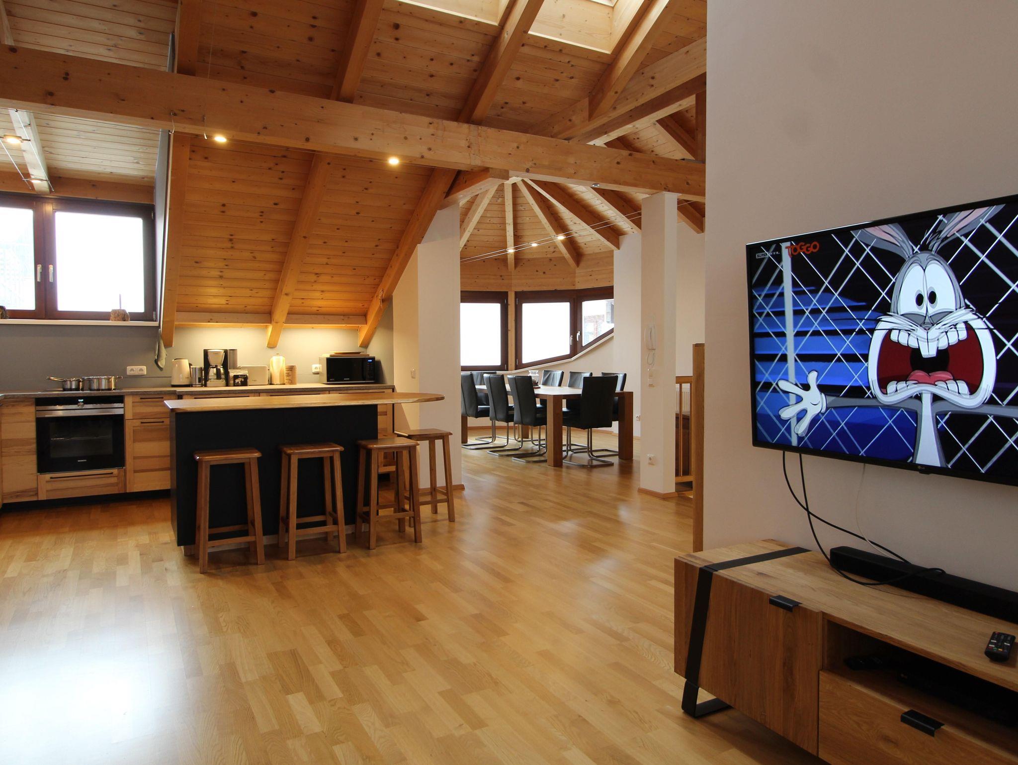 Hervorragende komfortable Wohnung auf zwei Ebenen. Am Eingang eine Garderobe mit Skiraumecke und Schuhwärmer sowie ein WC, ein Doppelzimmer mit Balkon und en-suite Bad mit Dusche. Eine Treppe führt in die obere Ebene, wo in einem großen offenen Raum die völlig ausgestattete Küche, der Esstisch und der Ruhebereich mit Sofa und TV Platz finden. Im Schlafbereich ein Schlafzimmer mit Doppelbett, ein Badezimmer mit Jacuzzi, Dusche und Waschmaschine, eine separate Toilette und das Kinderzimmer, mit einem Einzelbett, das zum Doppelbett wird, und einem wunderschönen Zwischengeschoss zum Spielen. Drei Außenparkplätze.