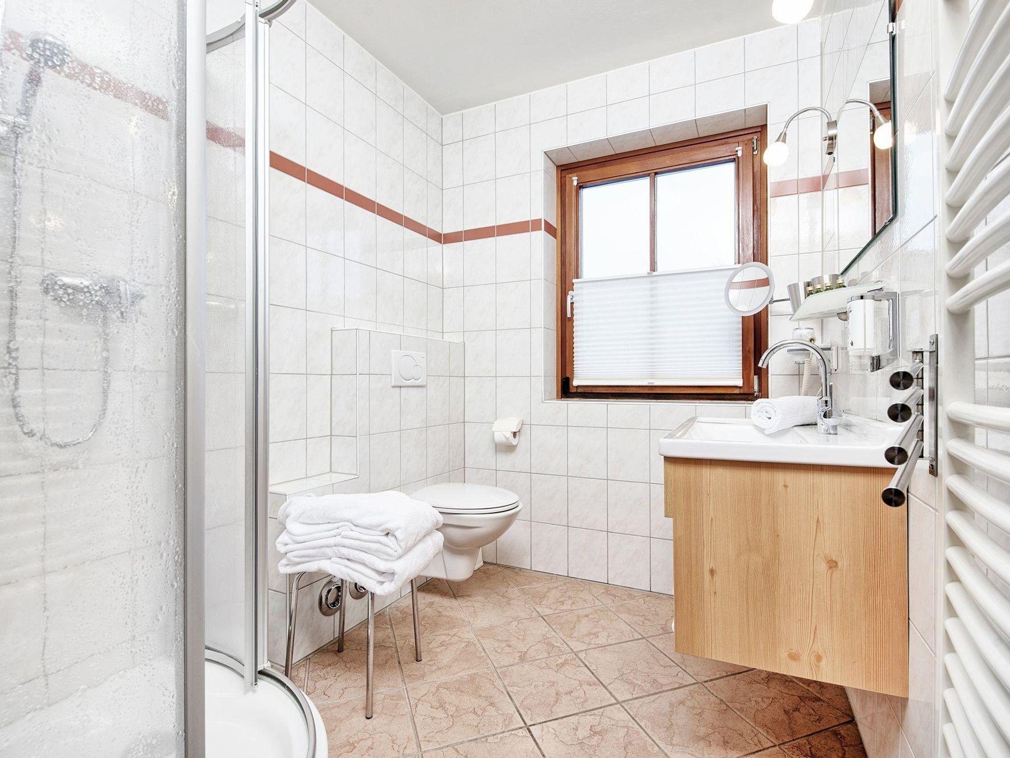 • Badezimmer mit Dusche, WC, Föhn und Kosmetikspiegel