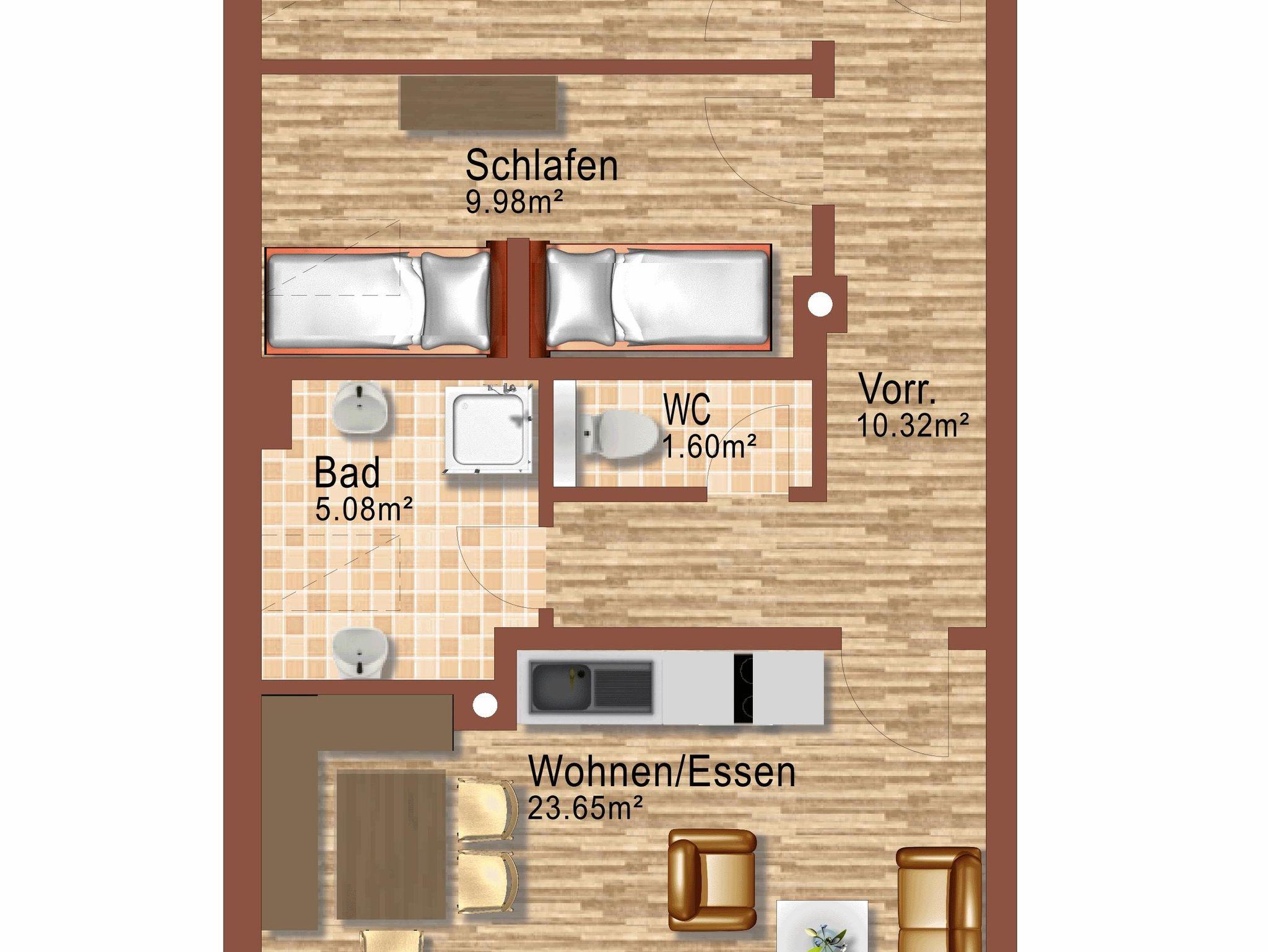 Die Wohnung ist 70 m2 gross und besteht aus 2 Schlafzimmer, 1 gemütliches Wohnzimmer mit Essecke und Sitzgarnitur,Südbalkon, 1 kleine Küche mit 2 Plattenherd und Kühlschrank, Geschirrspüler und Wasserkocher, Nespressomaschine, 1 Badezimmer mit Badewanne und Doppelwaschbecken , WC extra, Vorraum mit Garderobe. WLAN ist im Appartement verfügbar und gratis. Parkplätze sind verfügbar und gratis.