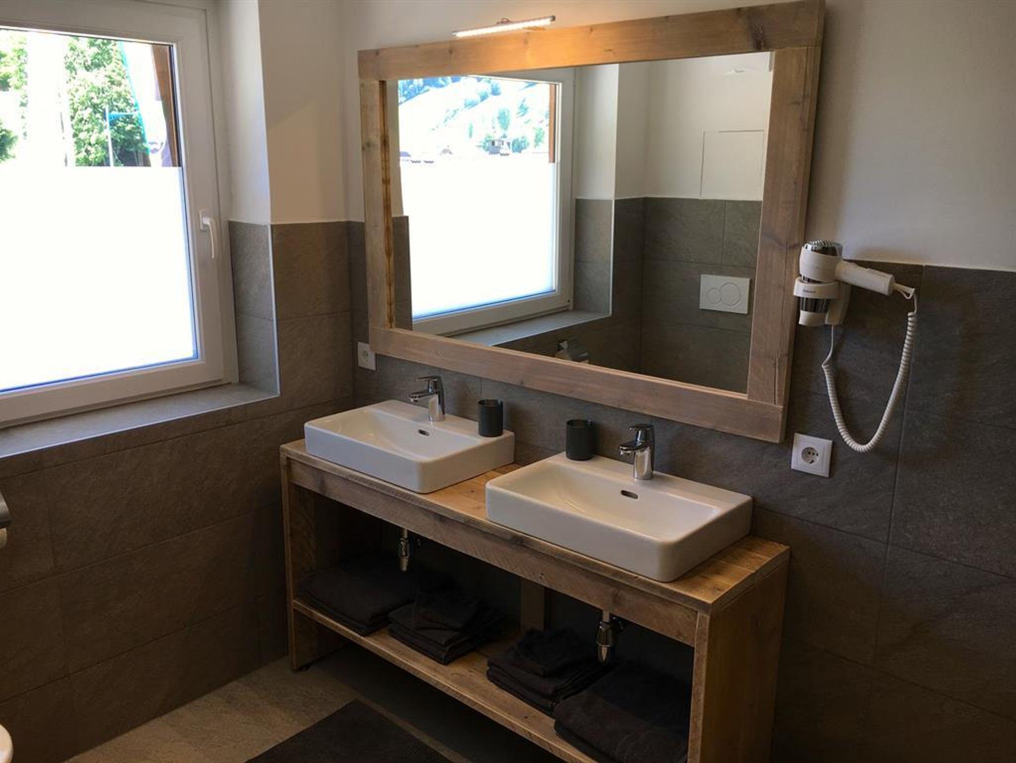 • Badezimmer mit bodenflacher Dusche, Bidet, Toilette, doppelter Waschtisch und Föhn