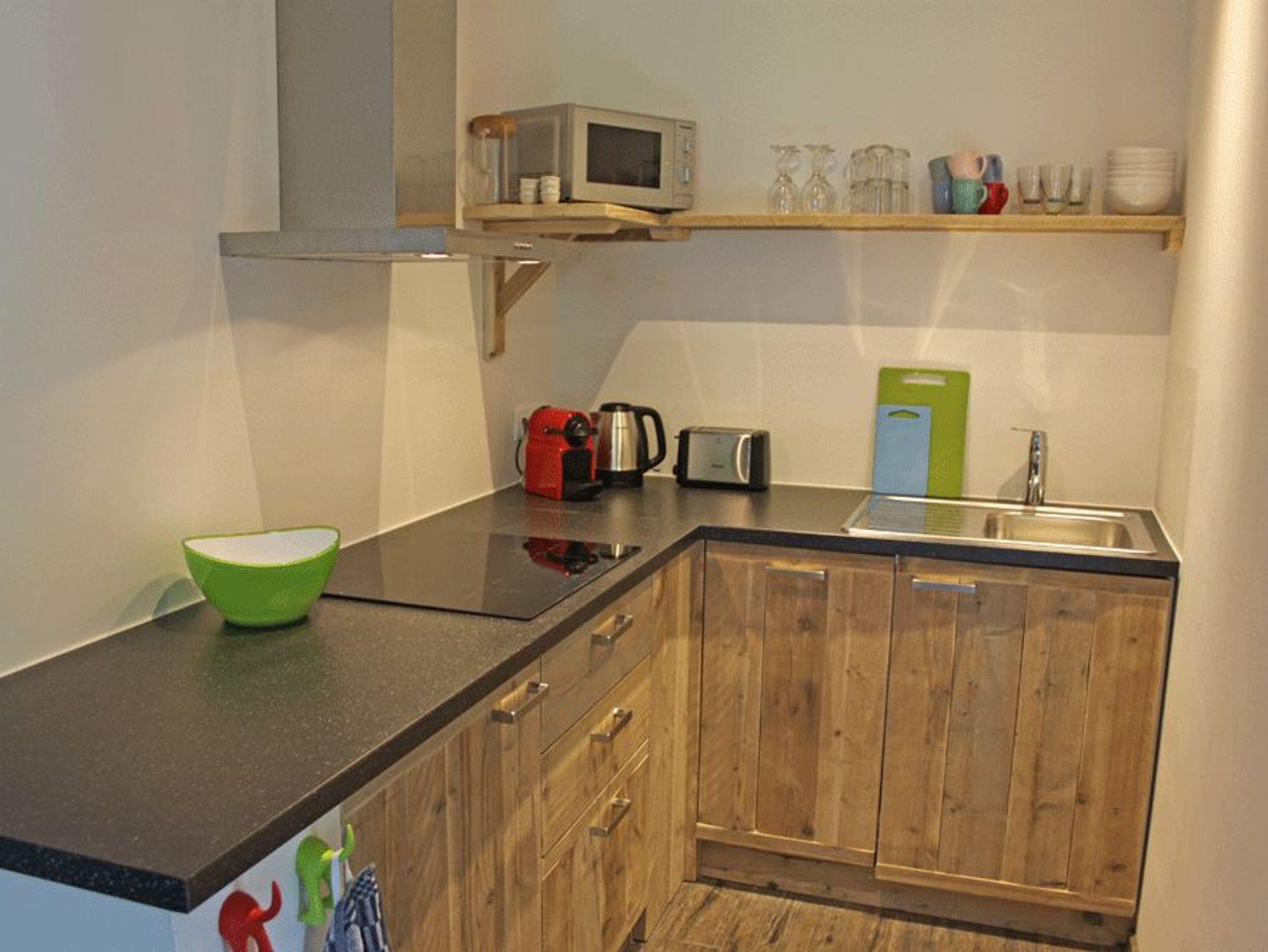 • Komplett eingerichtete Küche mit Geschirrspülmaschine, Kühlschrank, Induktionsherd, Dunstabzugshaube, Toaster, Wasserkocher, Mikrowelle und Nespresso Kaffeemaschine