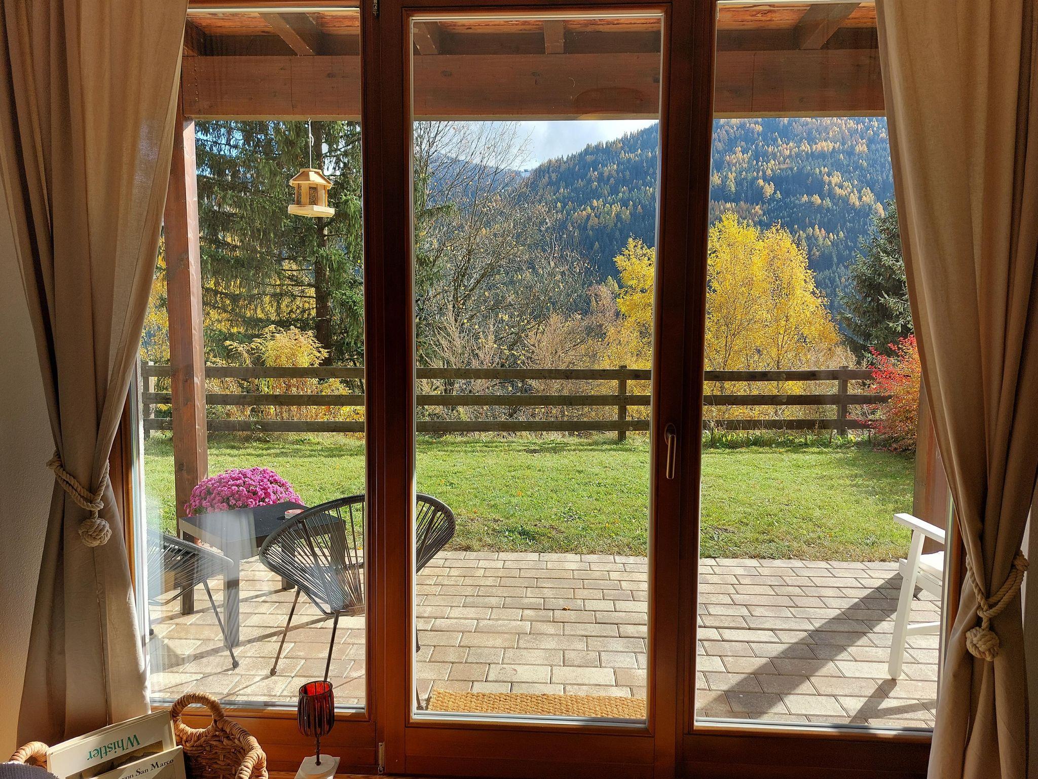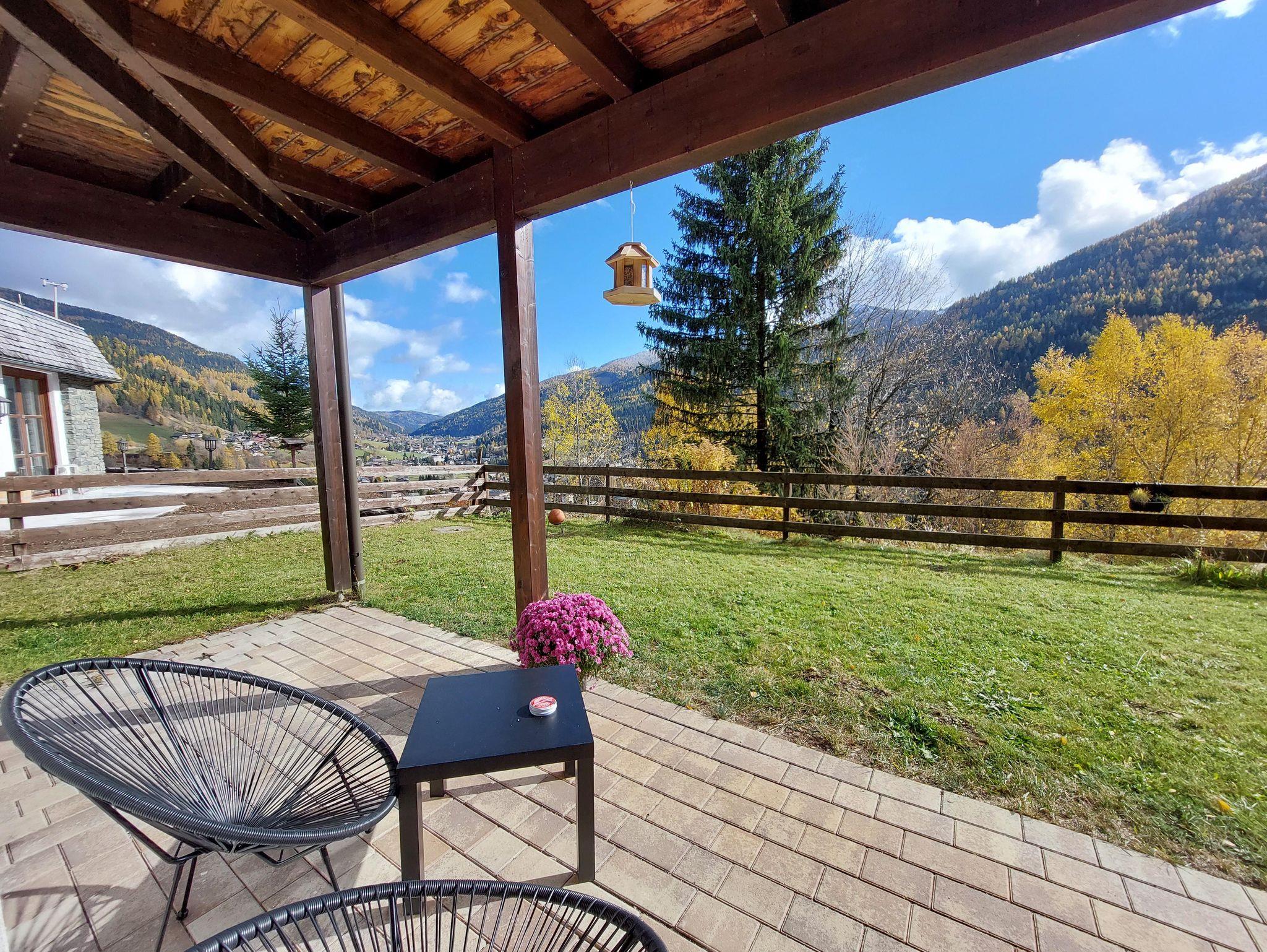 Wunderschöner Garten mit Tisch und Stühlen unter der Veranda mit Blick auf die Berge und das Tal.