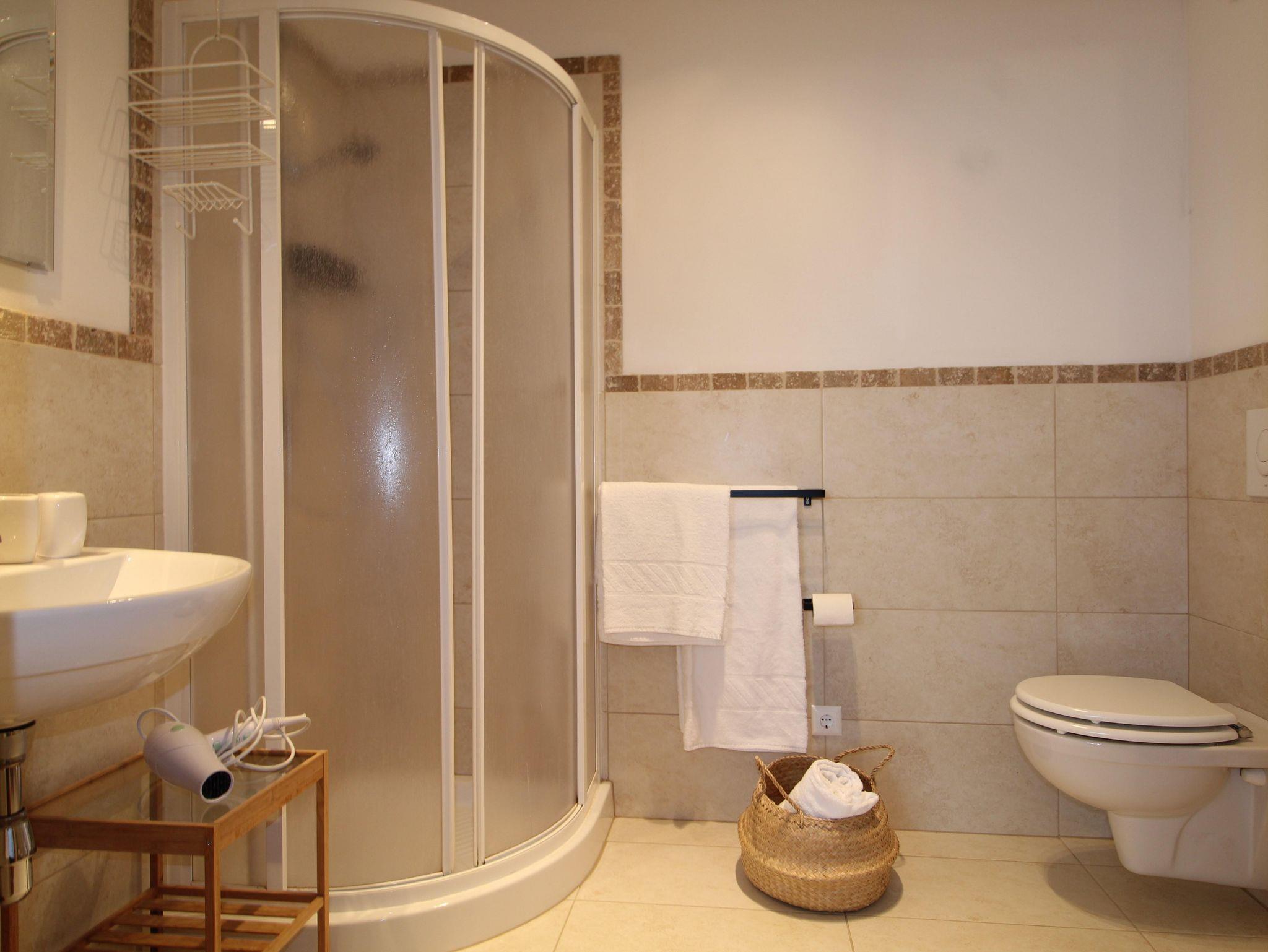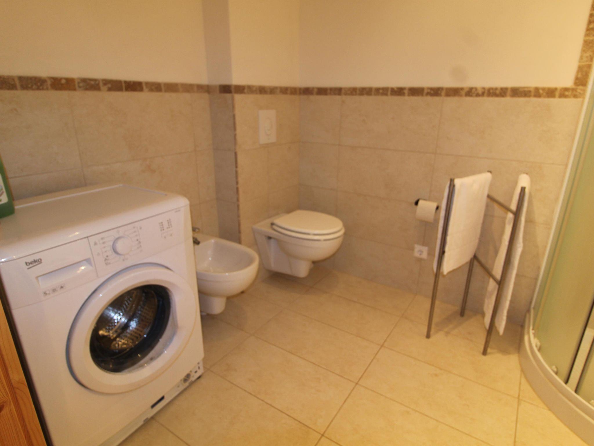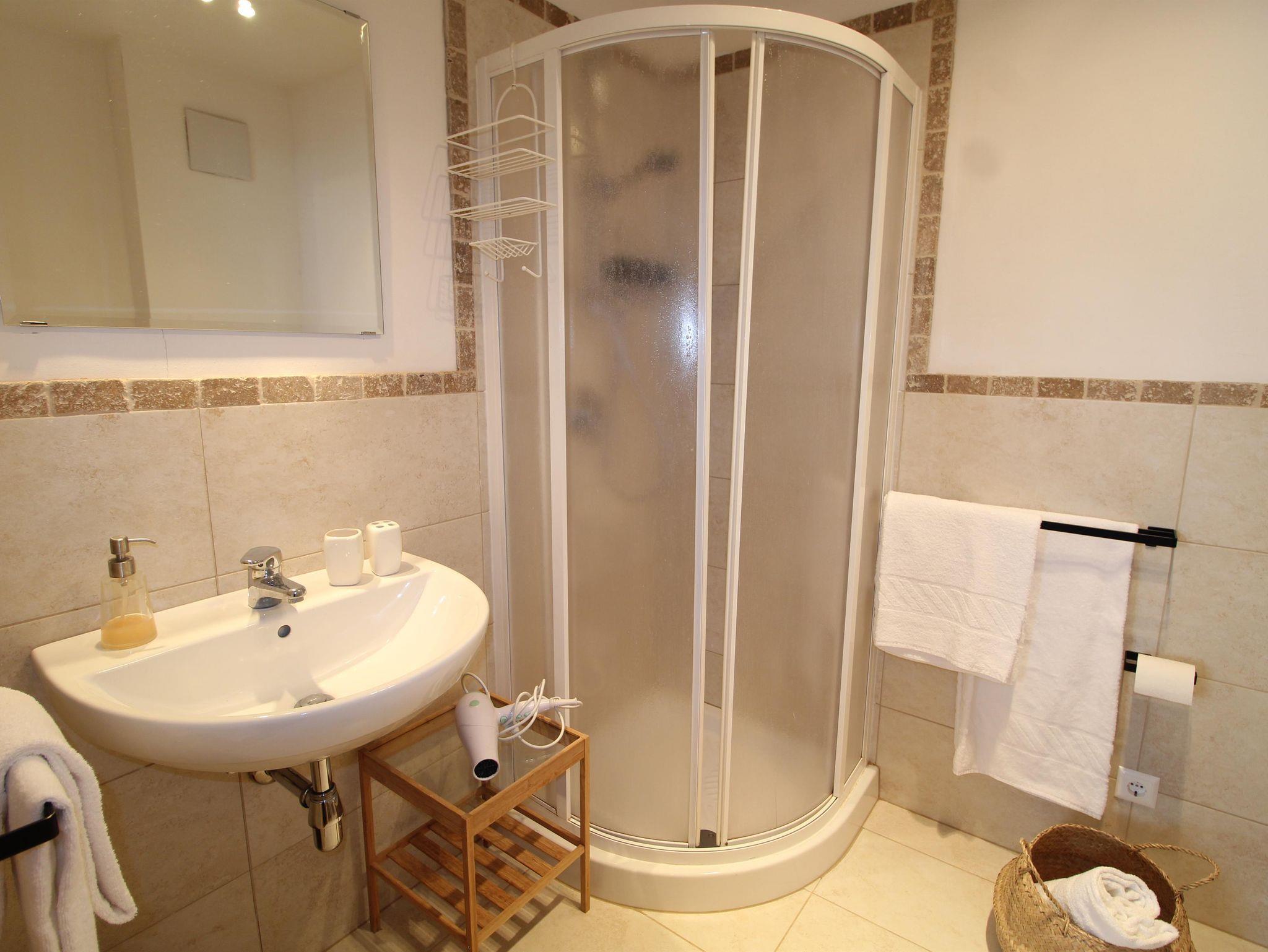 Wohnzimmer mit Küchenzeile mit Geschirrspüler, Couch und großem Fenster zum Garten. Ein doppeltes Schlafzimmer mit en-suite Bad, ein zweites doppeltes Schlafzimmer, ein Sofabett für einen fünften Gast, ein zweites Bad mit Waschmaschine, ein Abstellraum im Keller für Sportausrüstungen und ein Parkplatz im Freien.
