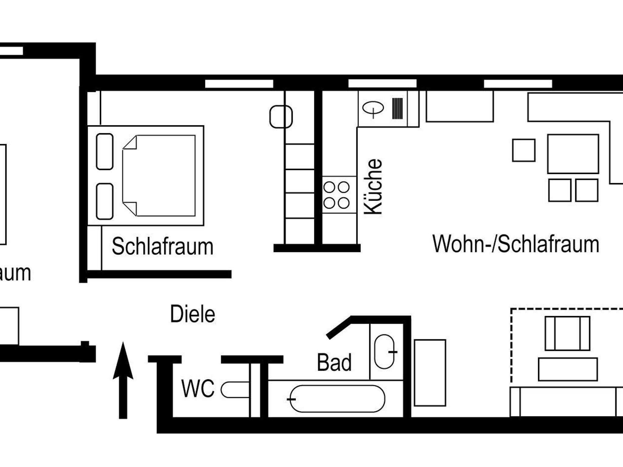 4 bis 6 Personen Appartement mit 2 getrennten Schlafräumen, Wohnraum mit ausziehbarer Couch, Küche mit Geschirrspüler, Bad mit getrenntem WC, SAT-TV, Telefon und Balkon.