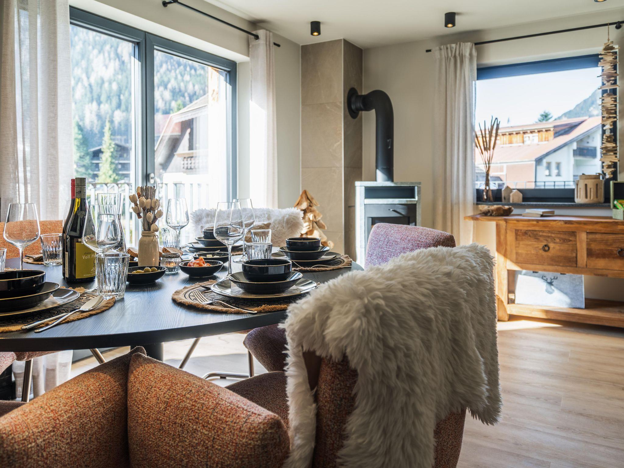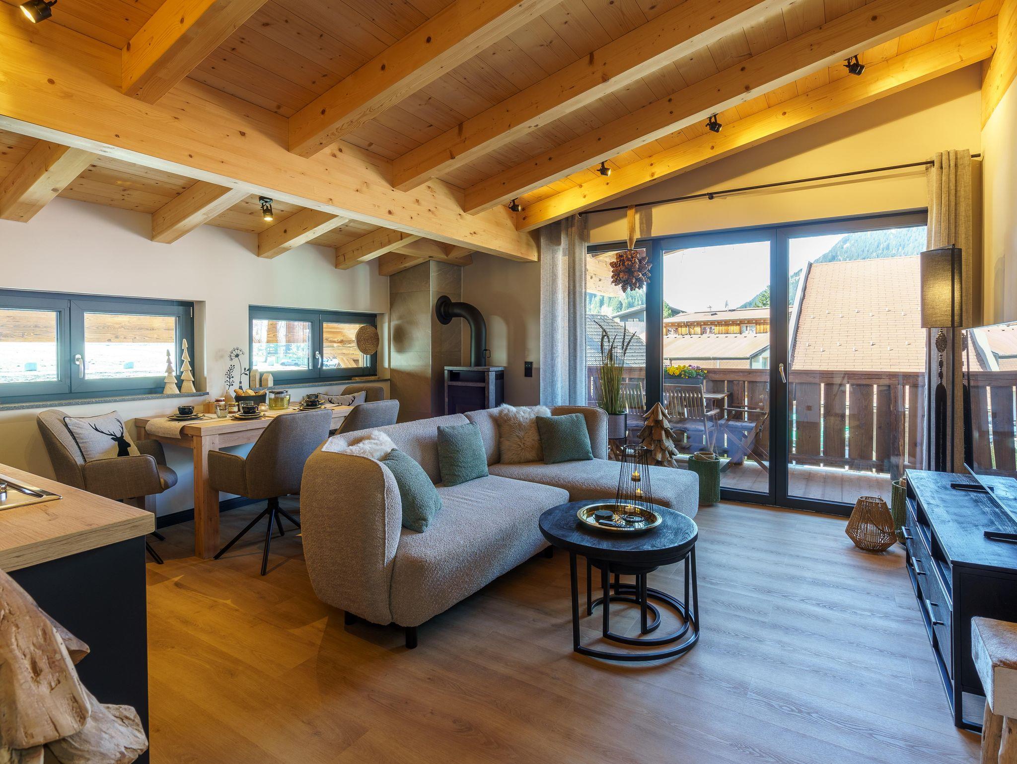 Offener Wohnbereich mit Kamin, stilvoller Küche und Balkonzugang. Zwei Schlafzimmer (1x Doppelbett, 1x zwei Einzelbetten), luxuriöses Bad mit Wanne & Dusche, separates Gäste-WC.