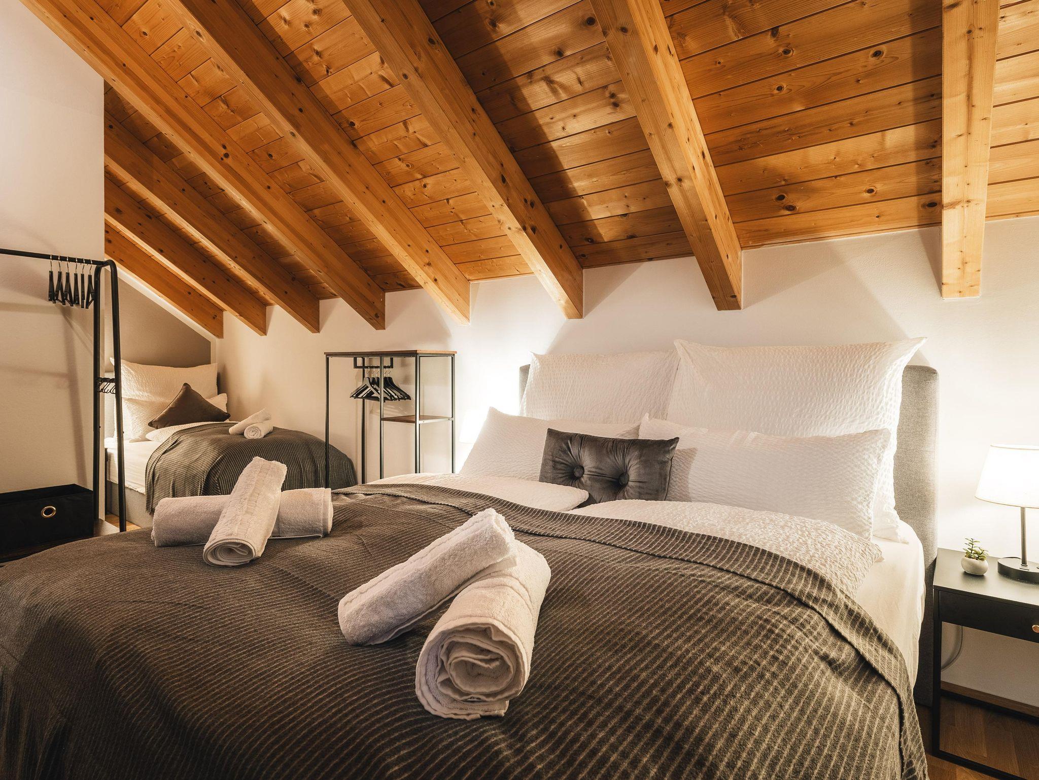 Es besitzt 3 separate Schlafzimmer im Obergeschoß und bietet somit genug Platz für bis zu 6 Personen. Des weiteren gibt es zwei Badezimmer mit Dusche, ein separates WC sowie einen herrlichen großen Südbalkon, an dem ihr den ganzen Nachmittag die letzten Sonnenstrahlen genießen könnt. Hier könnt ihr euren ereignisreichen Tag am Berg perfekt ausklingen lassen.