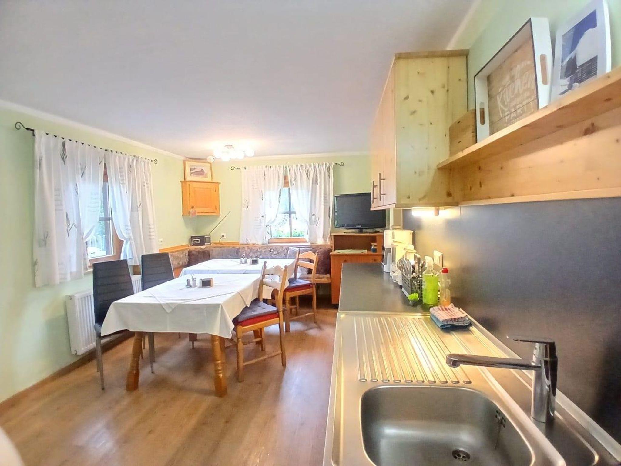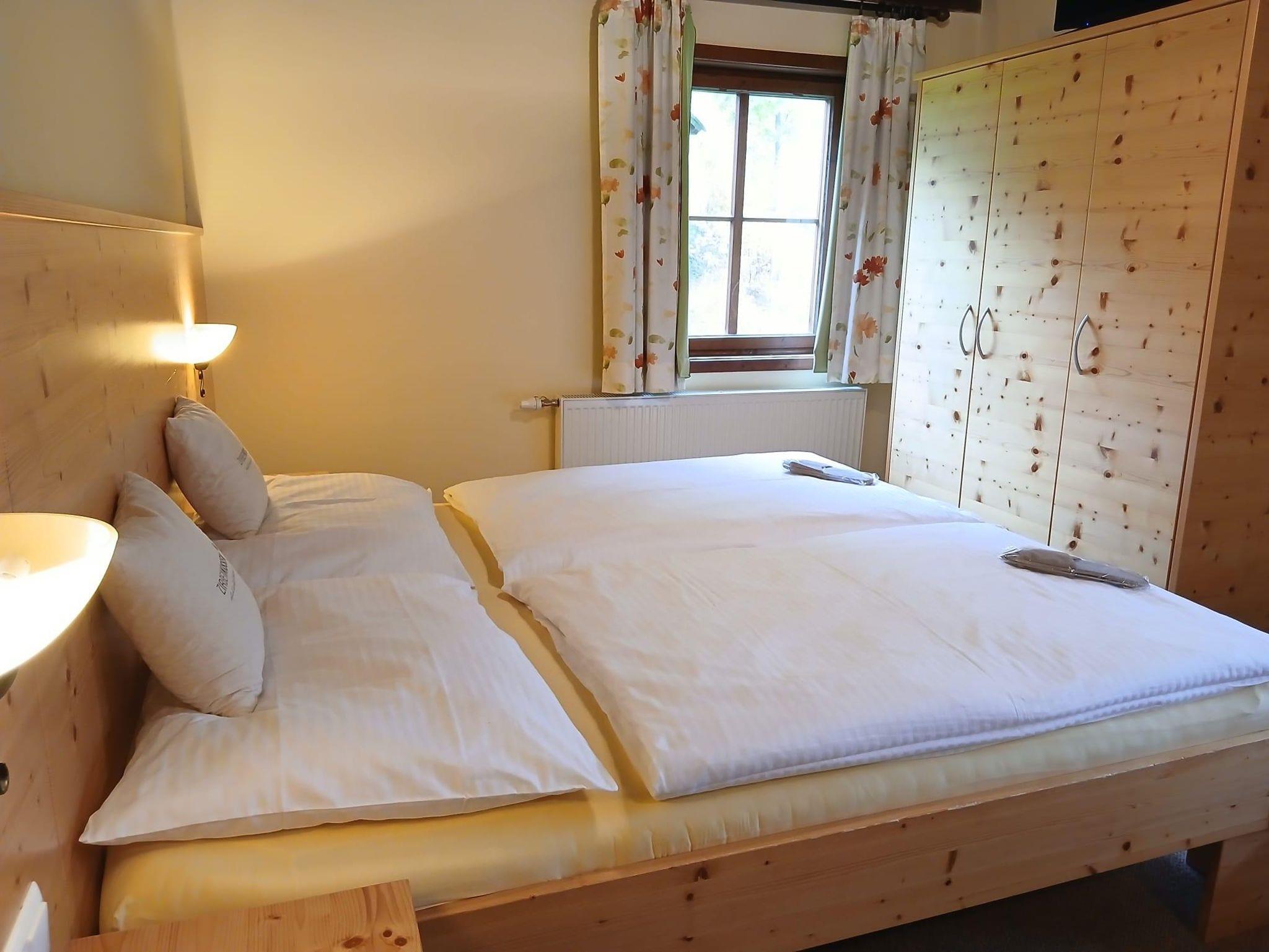 Appartement Lehrerzimmer 40 m² im 1. Stock mit einem Schlafraum mit einem Doppelbett und einem Einzelbett, Fichtenholzmöbel, Sat-TV und Radio, Waschbecken; Vorraum; Badezimmer mit Dusche-Balkon; WC; komplett ausgestattete Küche mit Sat-TV und Radio + Doppelausziehcouch, Eckbank, WLAN, Kosmetikprodukte, Bademäntel
