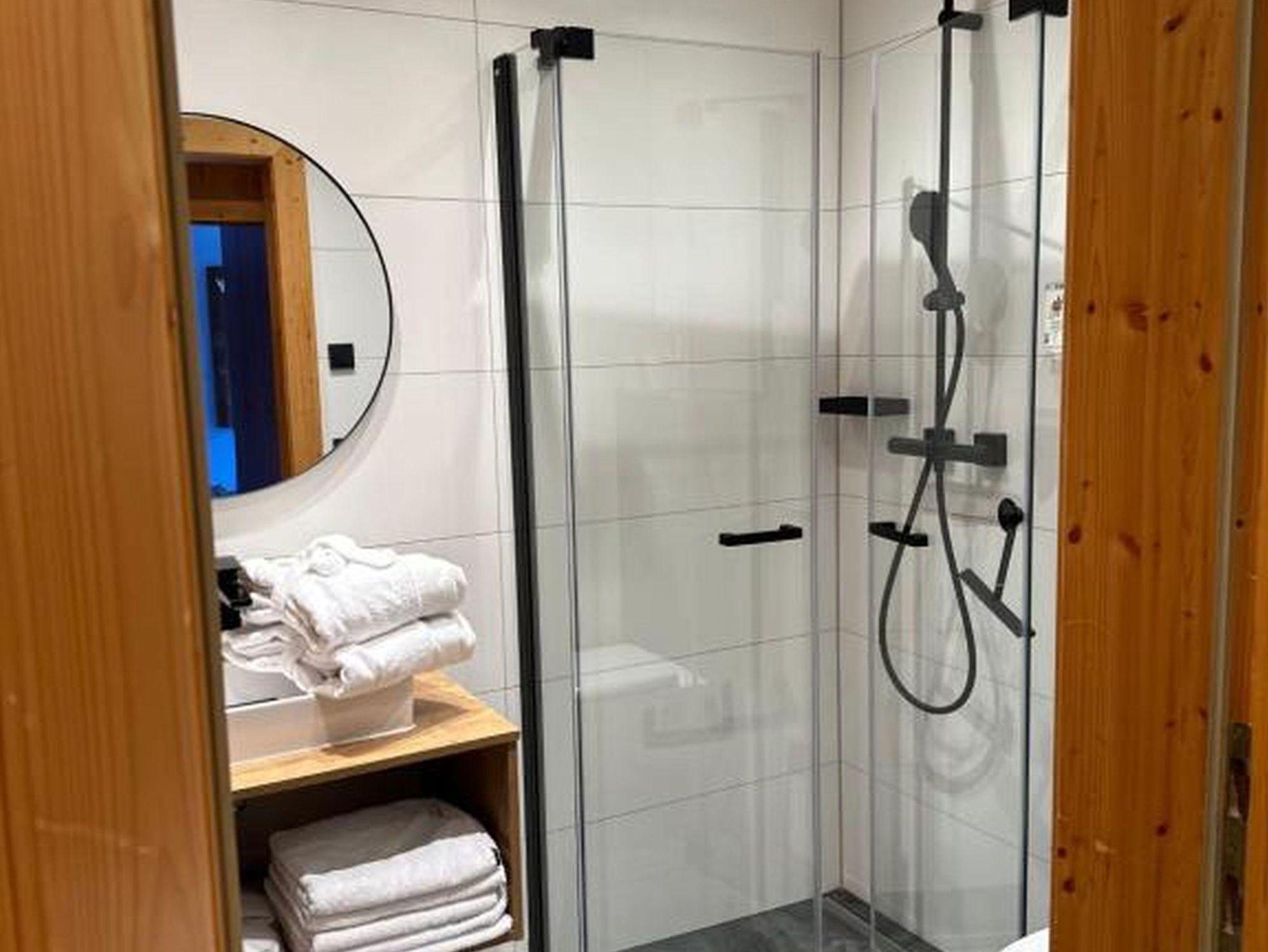 • Badezimmer mit Dusche, WC, Föhn und Kosmetikspiegel