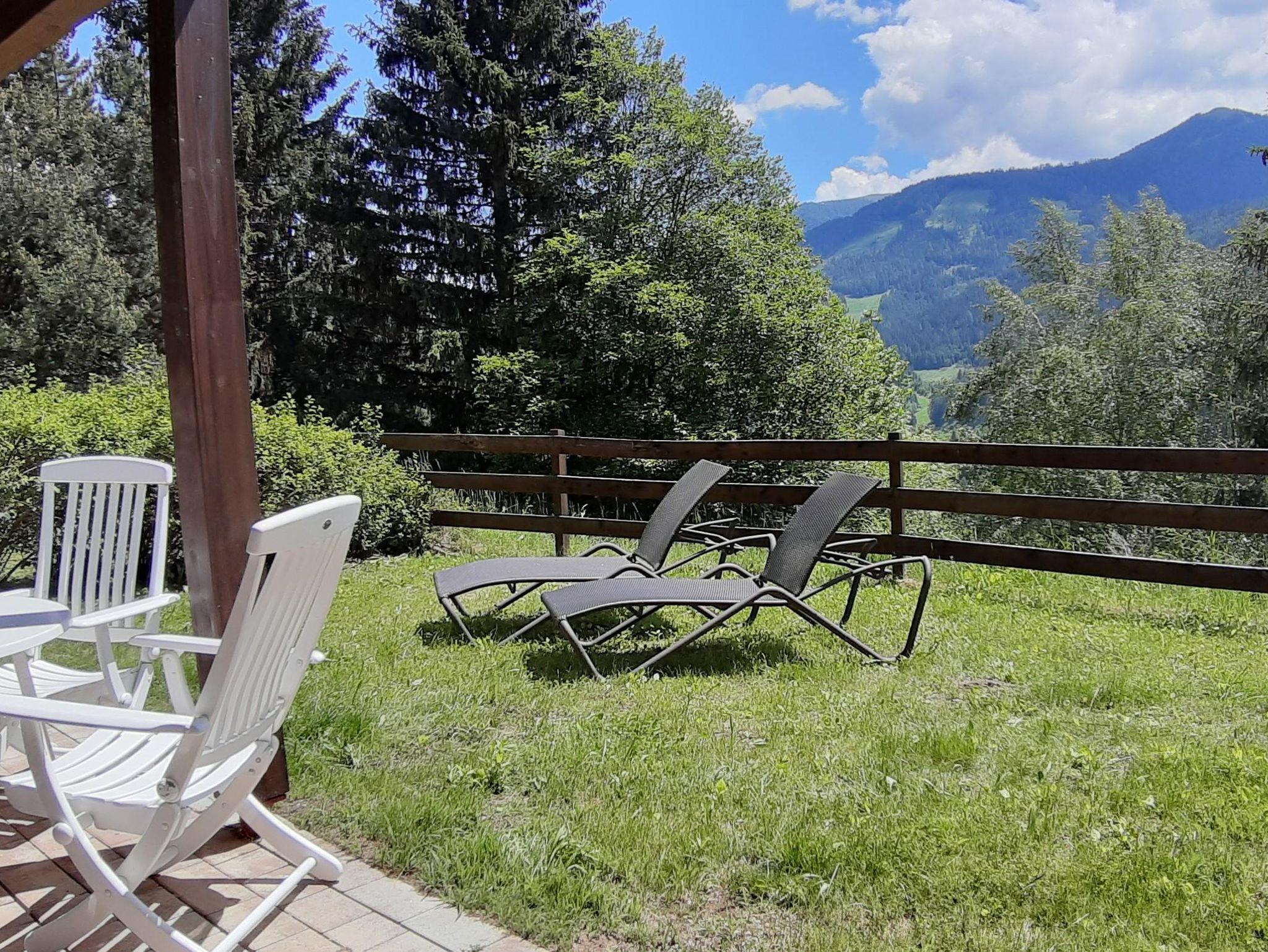 Wunderschöner Garten mit Sonnenliegen und Tisch und Stühlen unter der Veranda mit Blick auf die Berge und das Tal.