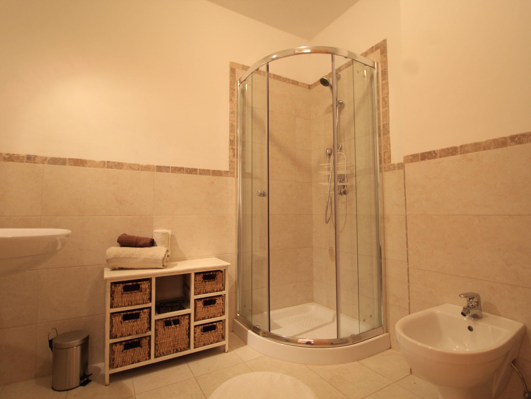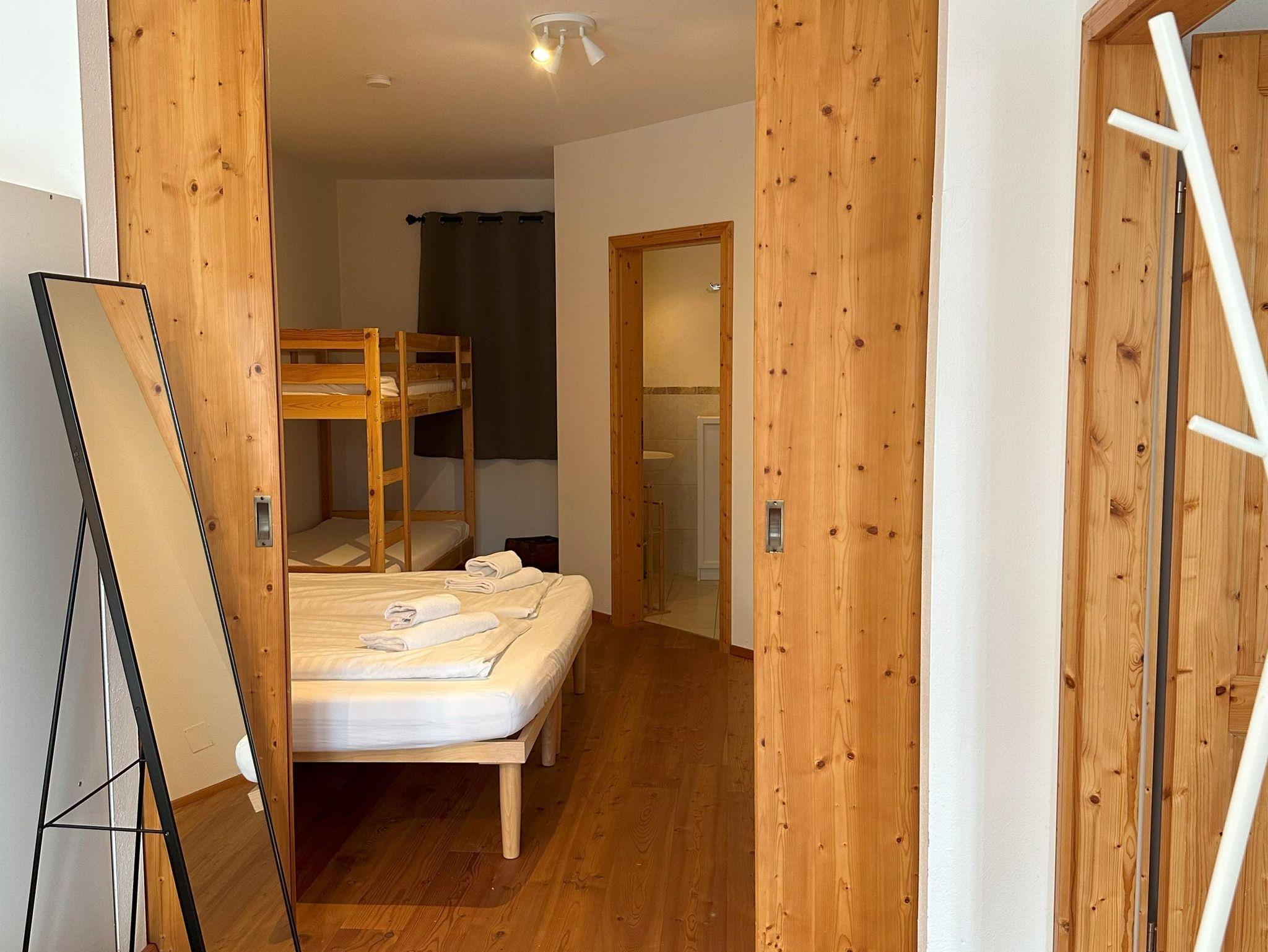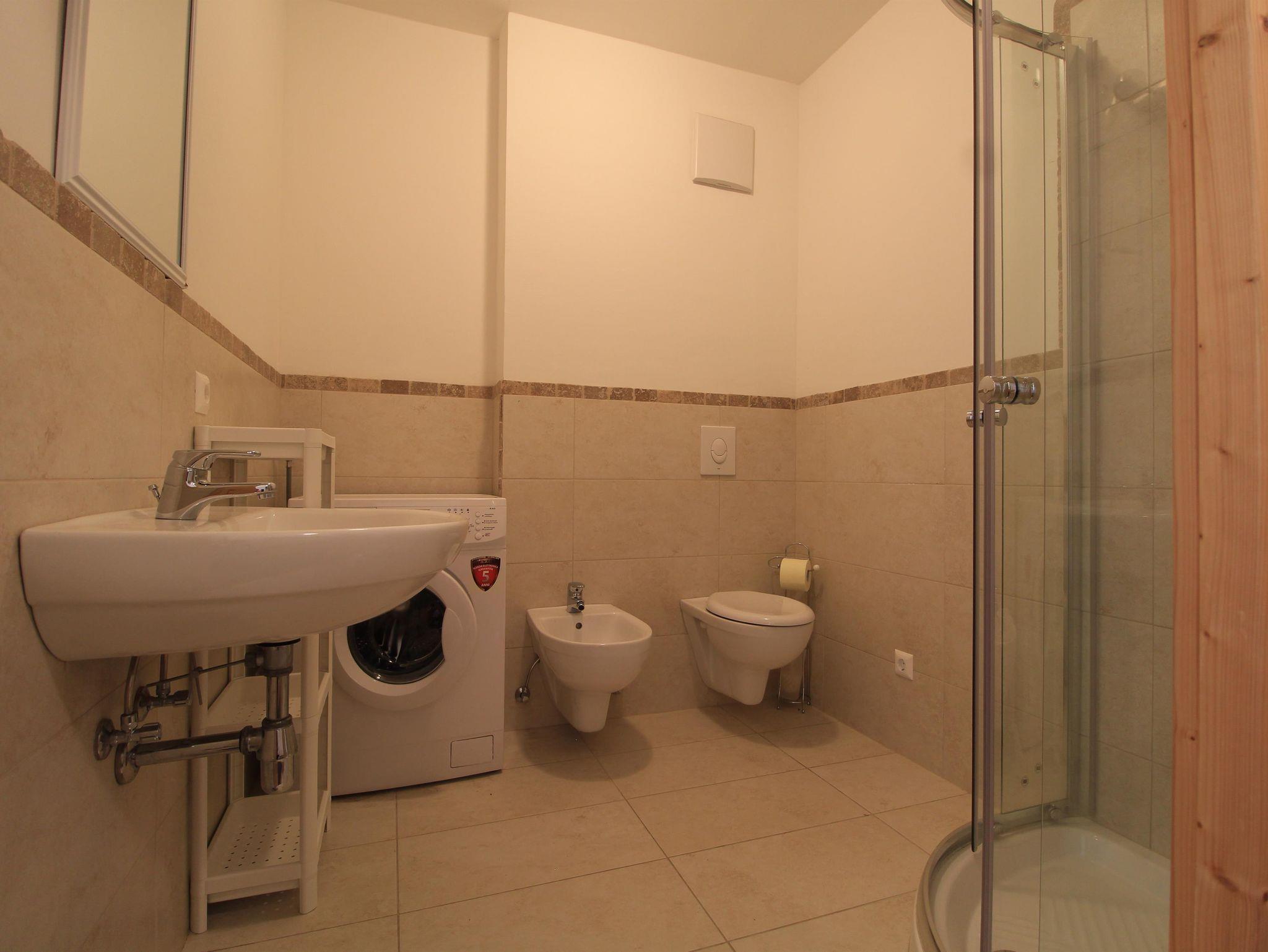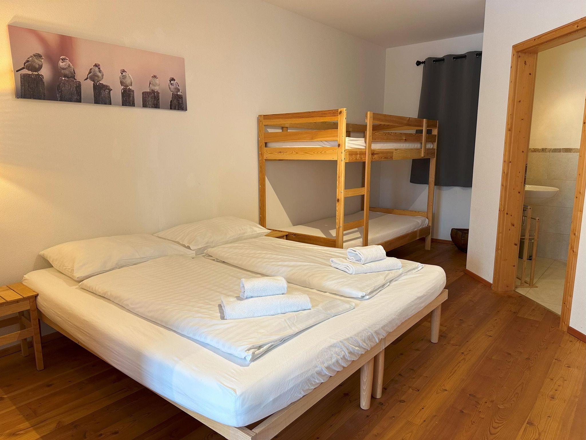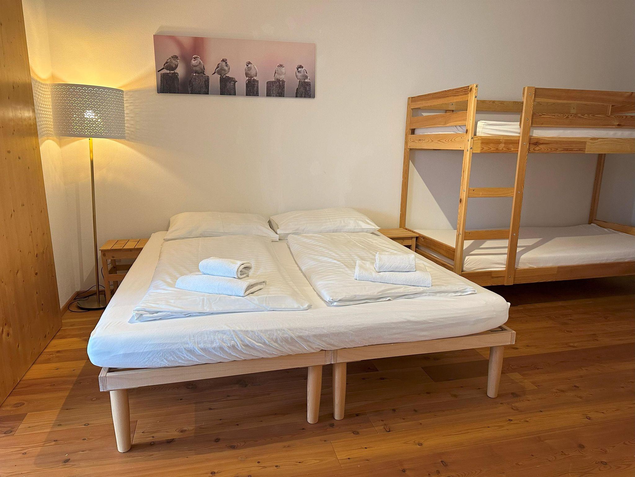 Wohnzimmer mit Küchenzeile mit Backofen und Geschirrspüler, Schlafsofa, Couch und großem Fenster zum Garten. Zwei große, mit einer Schiebetür kommunizierende Schlafzimmer bieten Platz für bis zu 6 Betten, aufgeteilt in zwei Doppelbetten und ein Etagenbett. Zwei Badezimmer (eines davon mit Waschmaschine) mit Waschbecken, Bidet, Dusche und WC. Ein Abstellraum in der Wohnung, ein Abstellraum im Keller für Sportausrüstungen und zwei Parkplätze.
