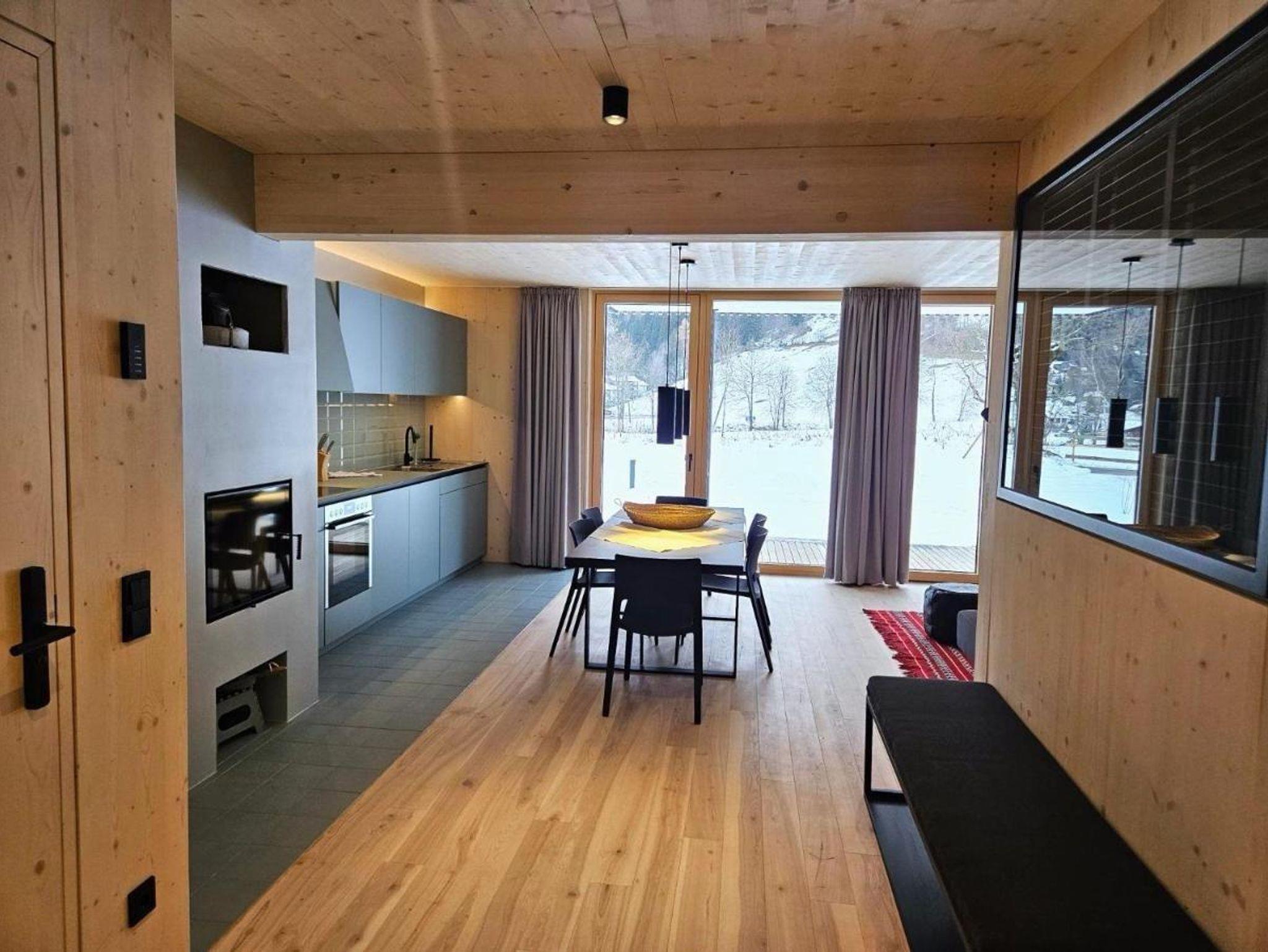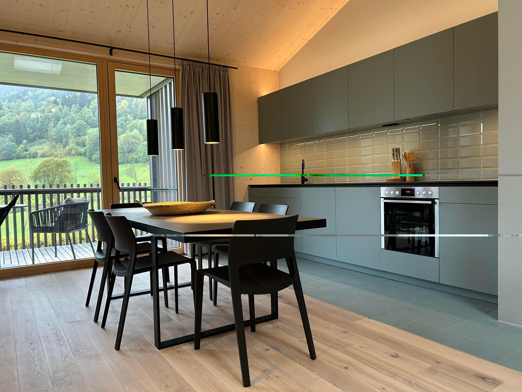 Das Interior-Design der Wohnbereiche ist in warmen Erdtönen gehalten und mit natürlichen Materialien gestaltet. Boden, Decke und Fenster sind in Echtholz ausgeführt. Die Küchennische ist in frischem Quellwassergrün gehalten und öffnet sich einladend zum Wohnbereich. Ein Kaminofen sorgt bei kühlen Temperaturen für behagliches Knistern.