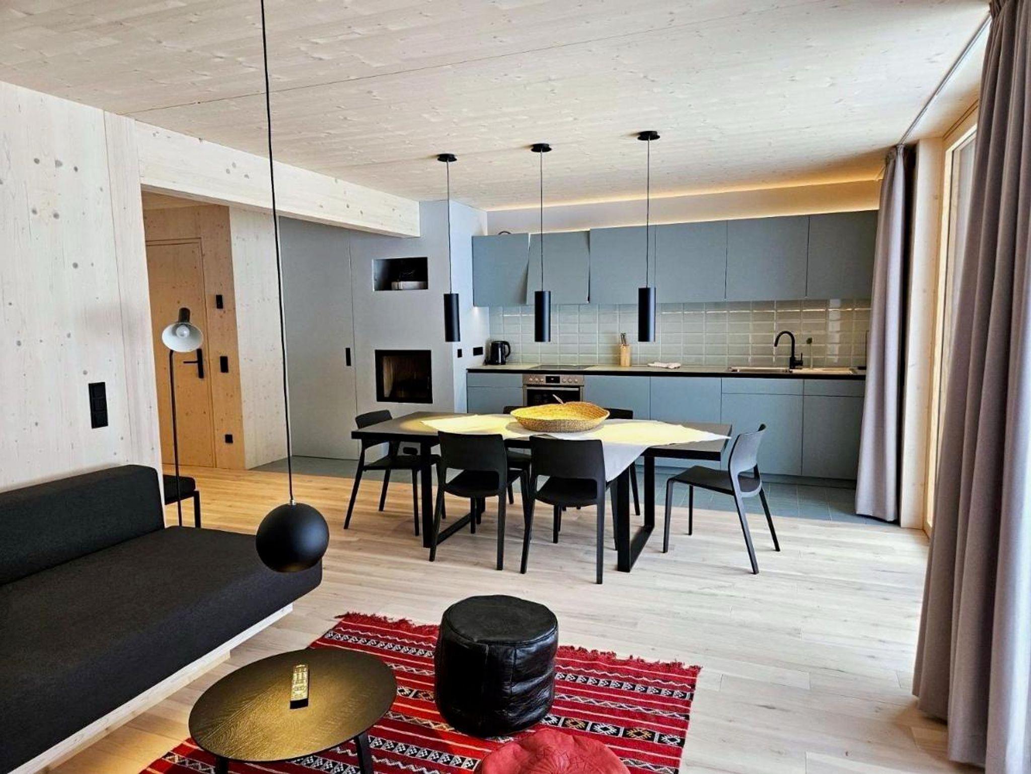 Helle Räume, große Fensteröffnungen und Balkone verbinden die Wohnungen mit der Landschaft. Natürliche Materialien, schöne Details, heimisches Holz, flauschige Stoffe und atmosphärische Beleuchtung sorgen für ein behagliches Ambiente.