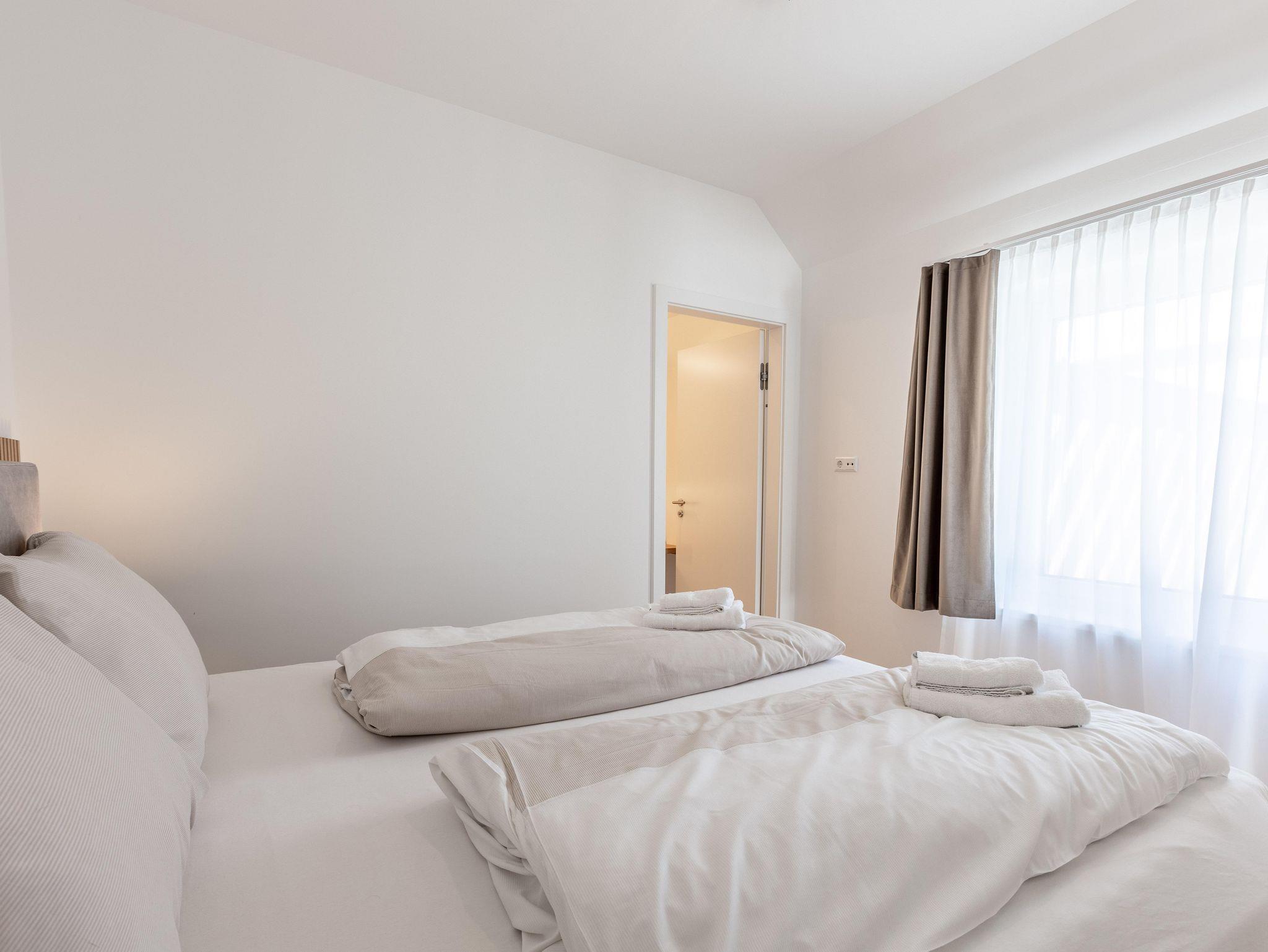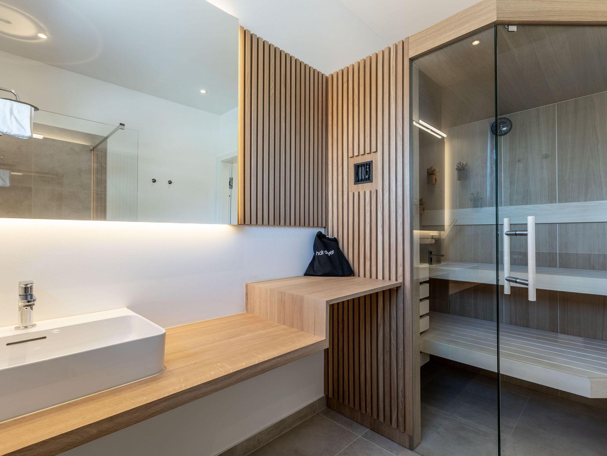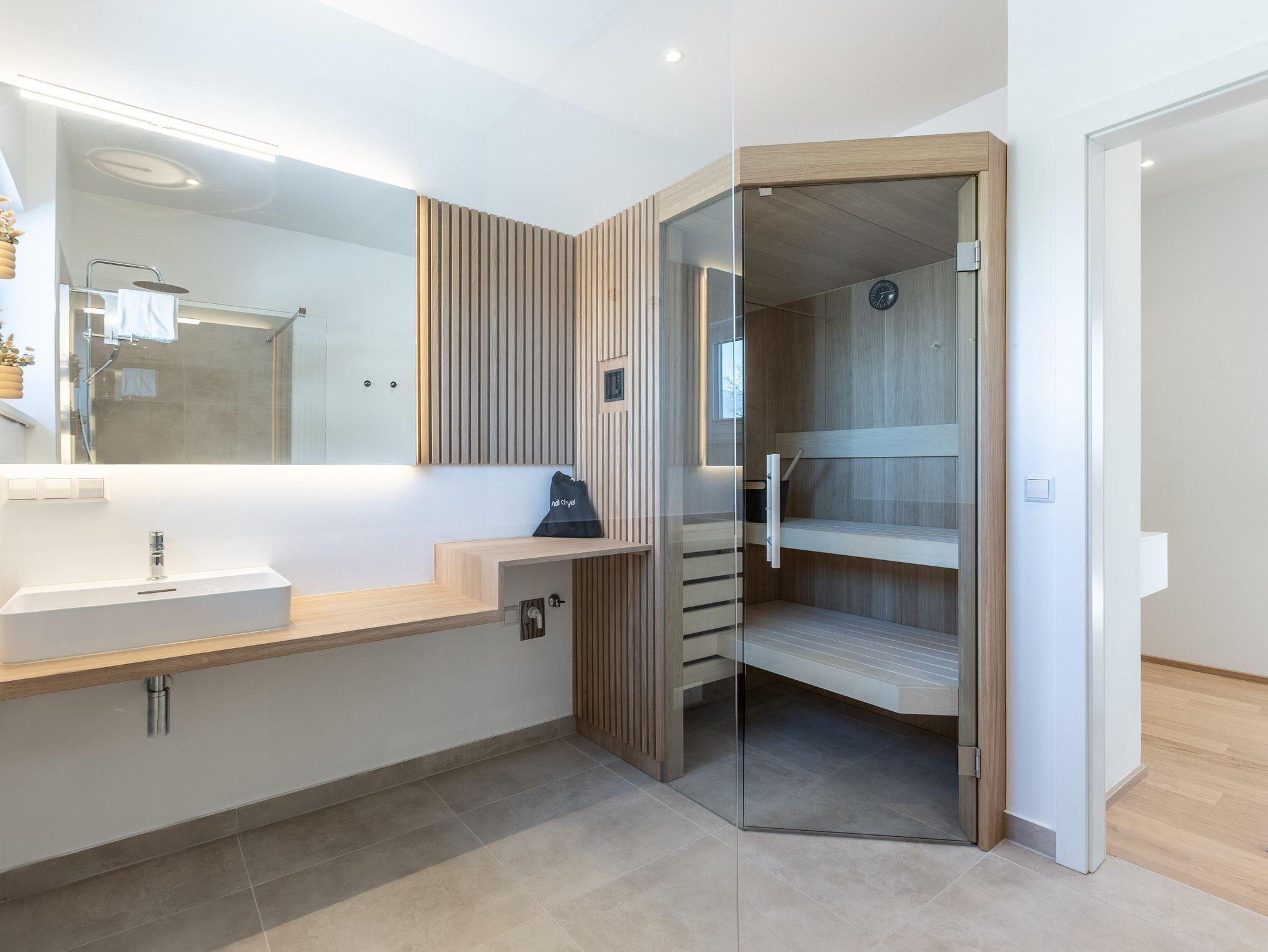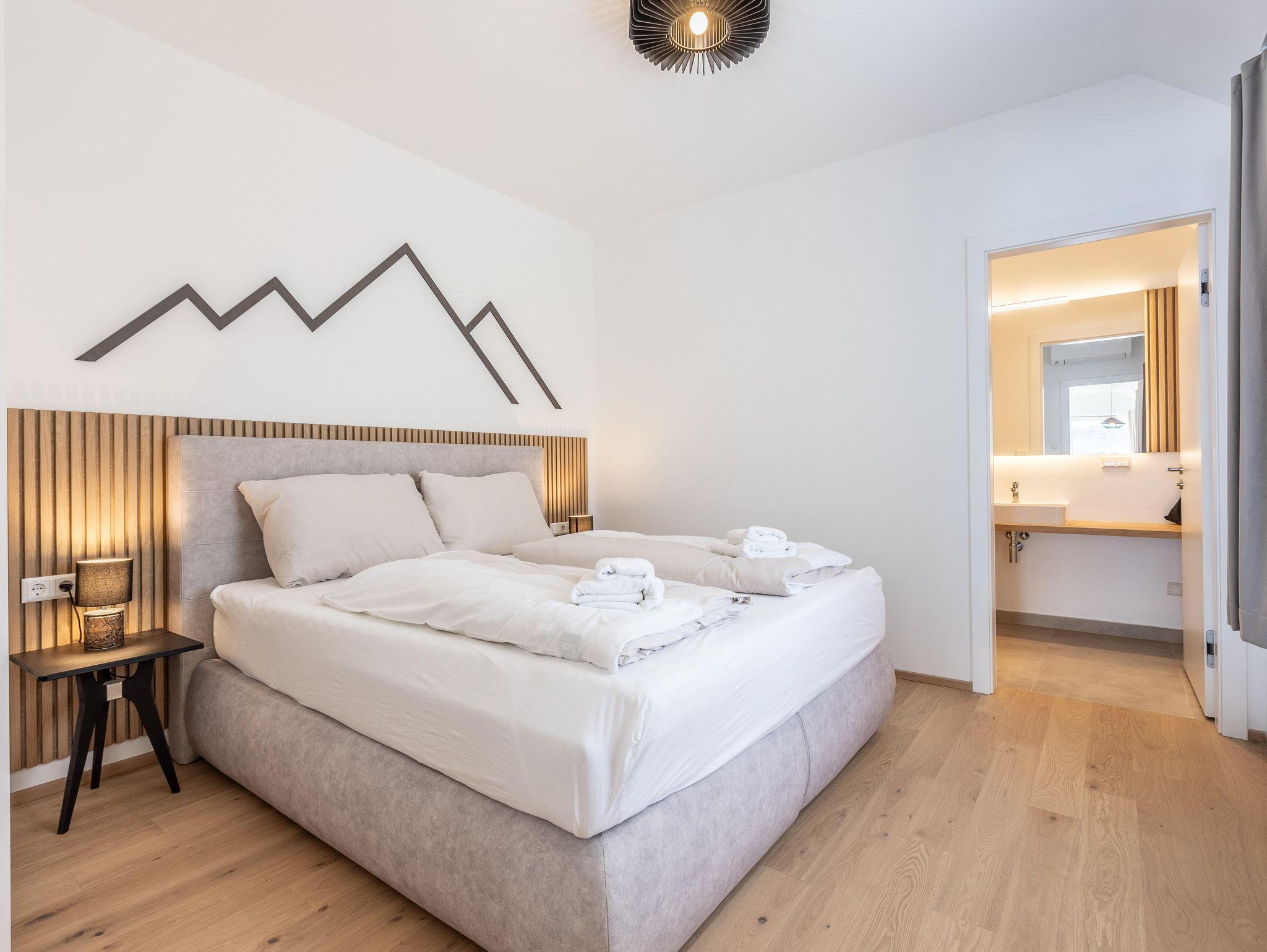 Suite Delight ist die größte Wohnung im Alpine Suite Spot mit eigener Terrasse und Sauna. Es gibt drei Schlafzimmer mit Doppelbett, sowie eine Schlafcouch im Wohnzimmer. Die Küche ist vollausgestattet. Es gibt zwei Badezimmer.