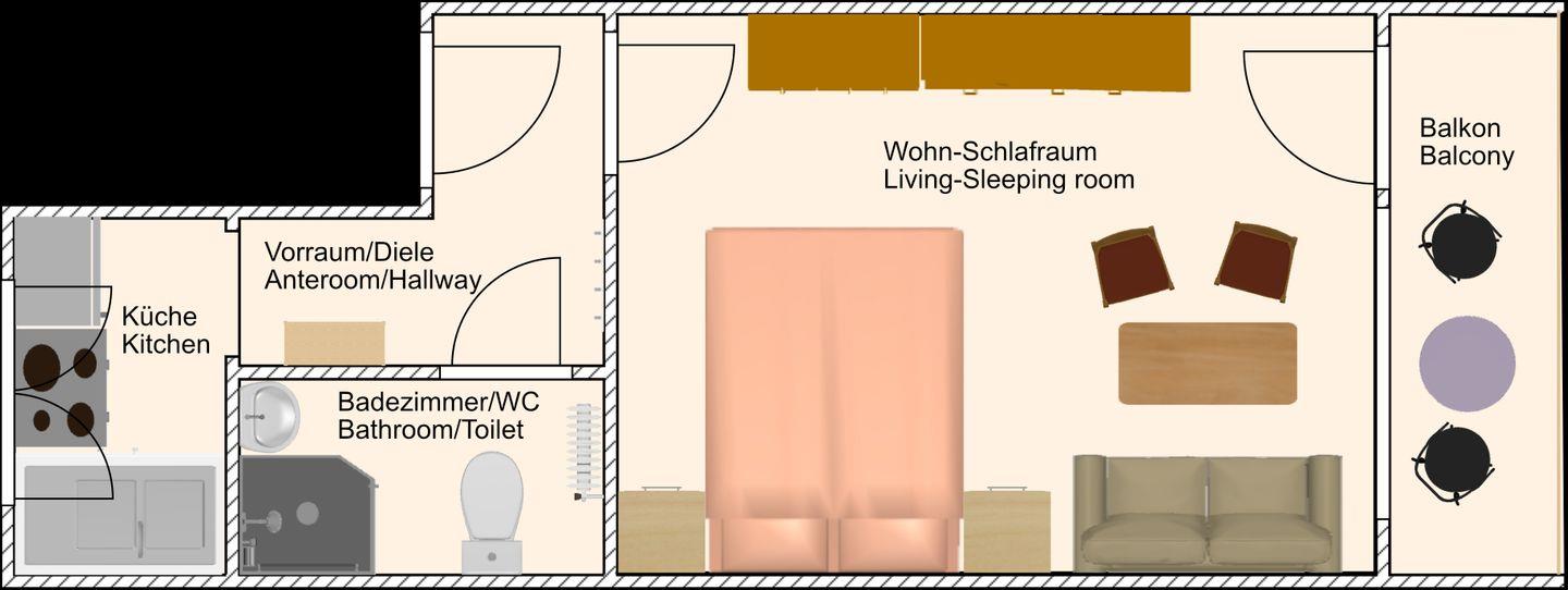 Mit einer Gesamtfläche von 35 m² ist das Apartment ideal für bis zu drei Personen und bietet eine gemütliche Atmosphäre, die durch die sorgfältige Einrichtung und moderne Annehmlichkeiten geprägt ist. Der Wohnbereich mit Laminatboden lädt zum Entspannen ein und verfügt über ein komfortables Sofa sowie einen Fernseher mit internationalen Kanälen, sodass Sie Ihr Lieblingsprogramm genießen können.