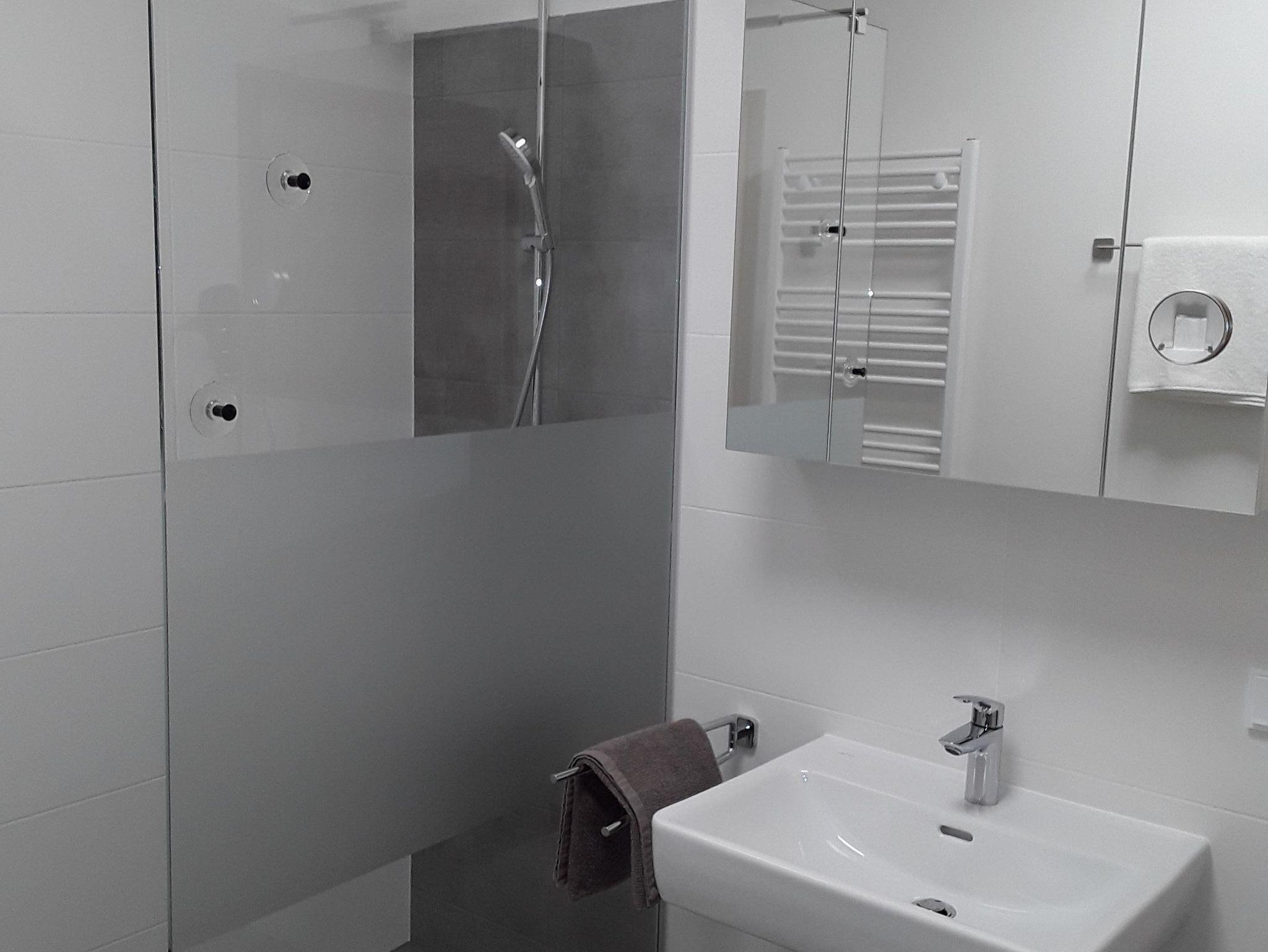 Vom Wohnraum aus gelangt man in das sehr geräumige Badezimmer, welches mit einer Dusche, Waschtisch, Handtuchtrockner ausgestattet ist. Man gelangt über eine Verbindungstüre in das Schlafzimmer.