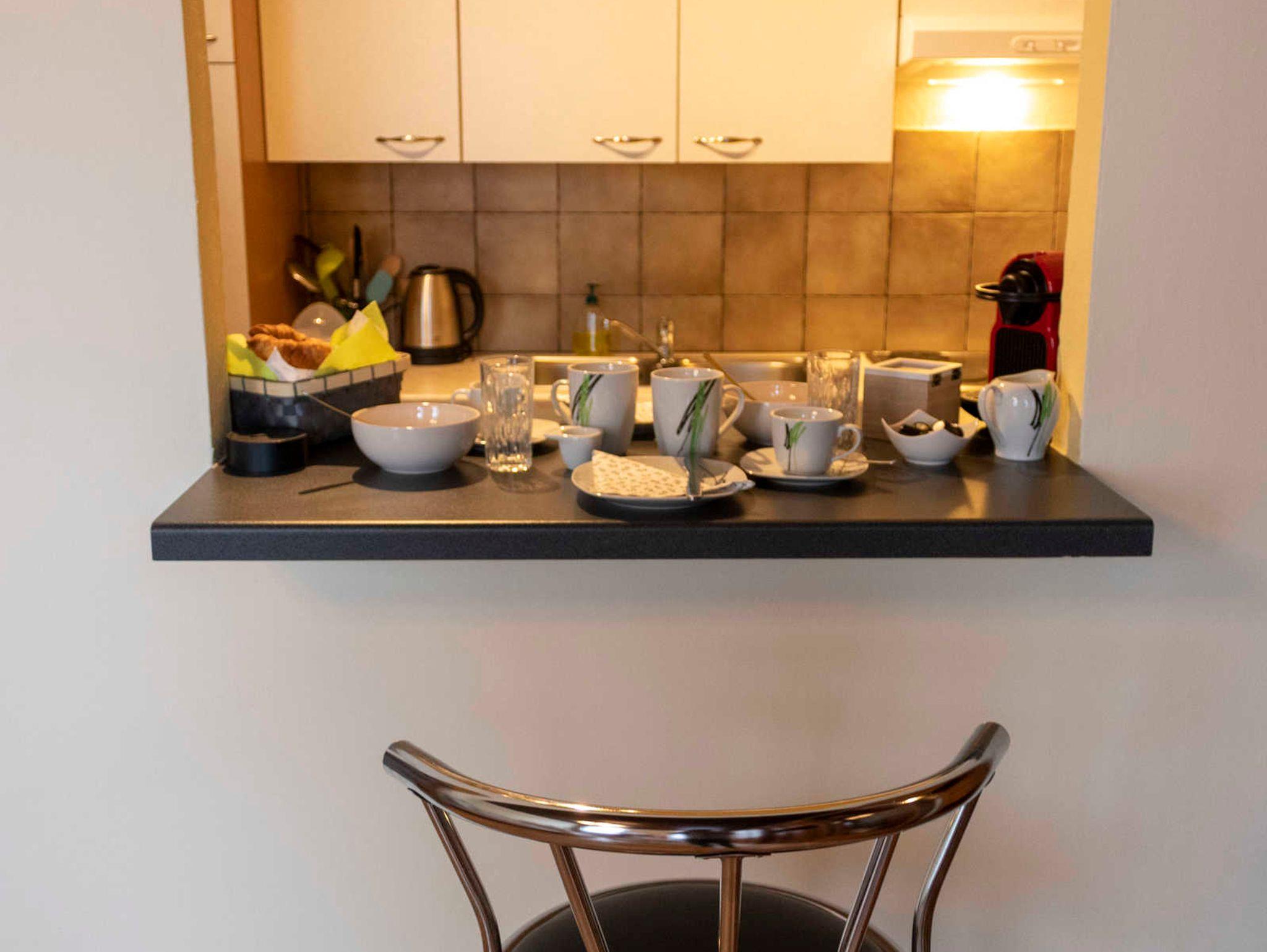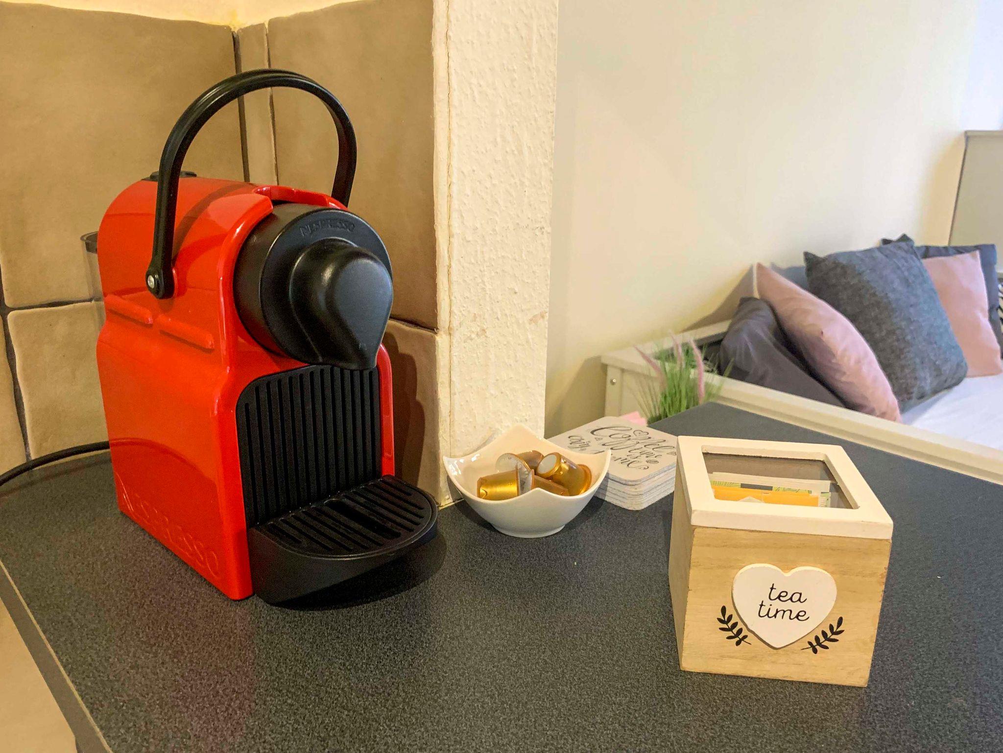 Die Küche ist komplett ausgestattet mit Herd, Backofen, Kühlschrank, Mikrowelle, Nespresso-Kaffeemaschine, Wasserkocher, Eierkocher und natürlich sämtlichem Geschirr, Weingläsern, Töpfen und Pfannen.