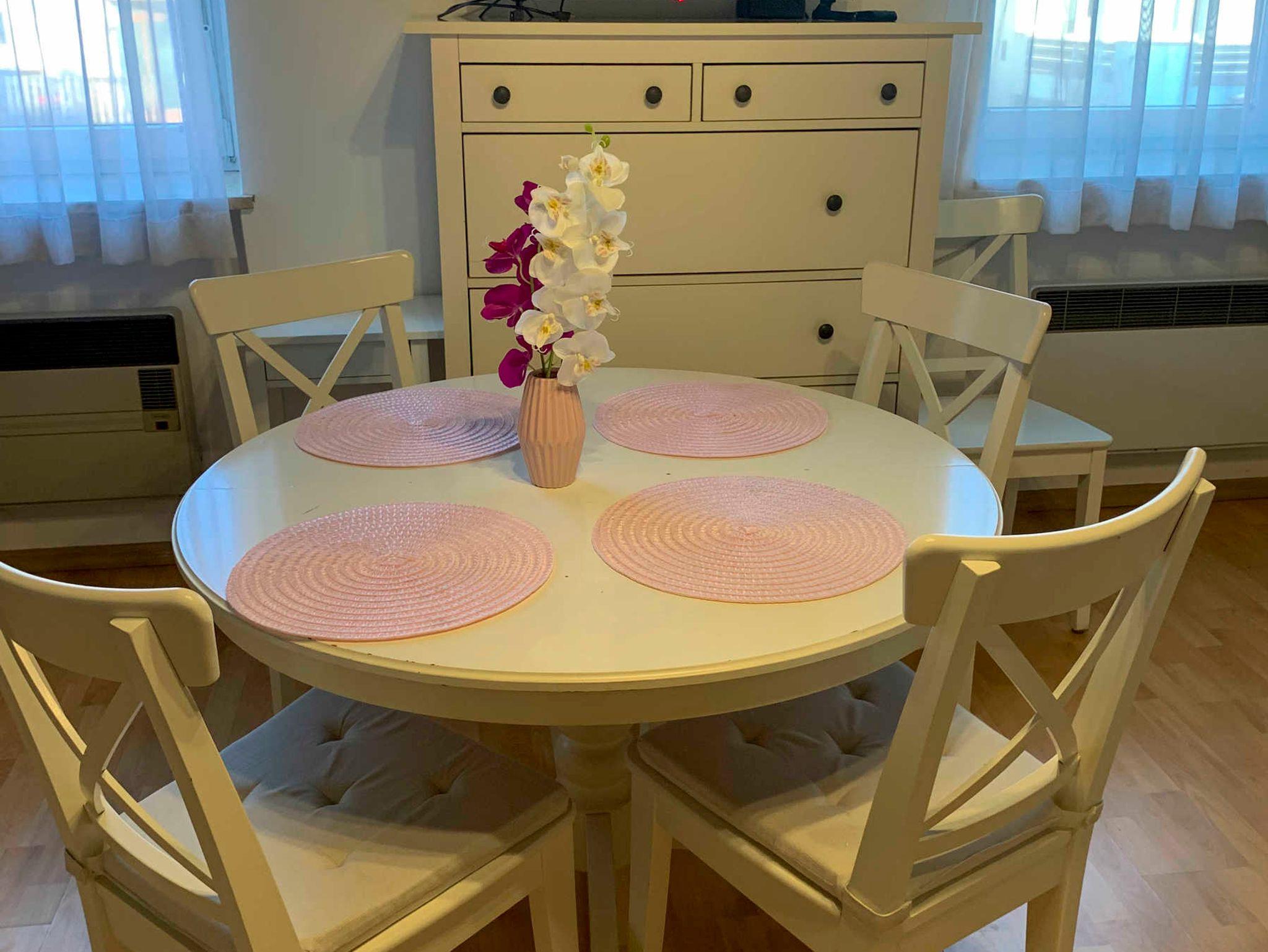 Der Essbereich bietet Platz für bis zu 6 Personen. Der Fernseher verfügt über Satelliten TV.