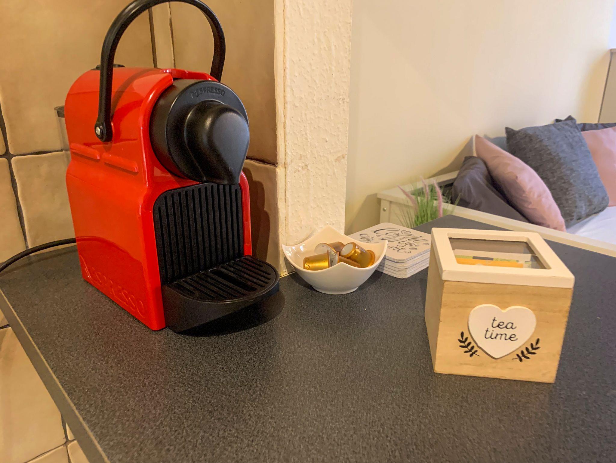 Die Küche ist komplett ausgestattet mit Herd, Backofen, Kühlschrank, Mikrowelle, Nespresso-Kaffeemaschine, Wasserkocher, Eierkocher und natürlich sämtlichem Geschirr, Weingläsern, Töpfen und Pfannen.