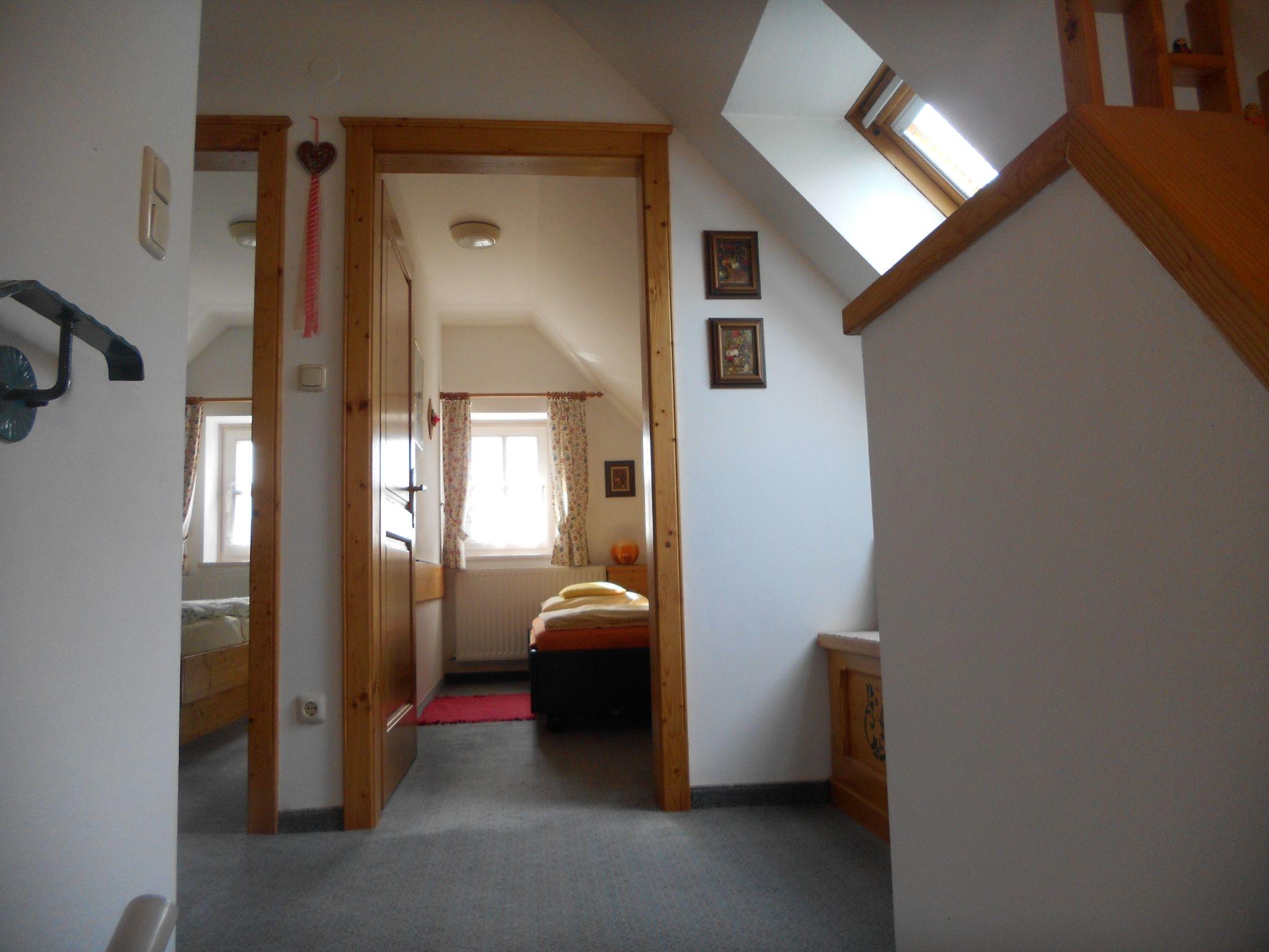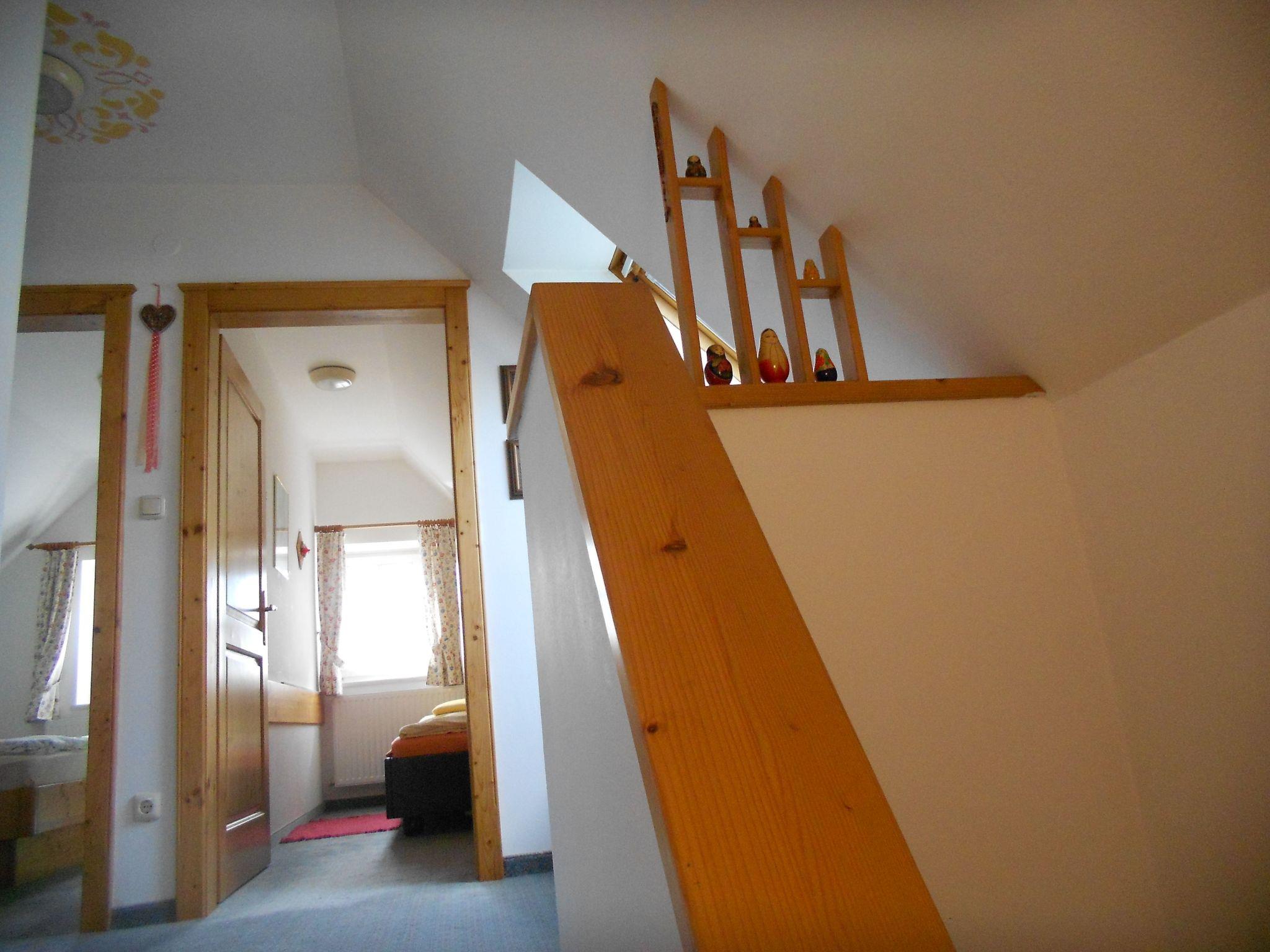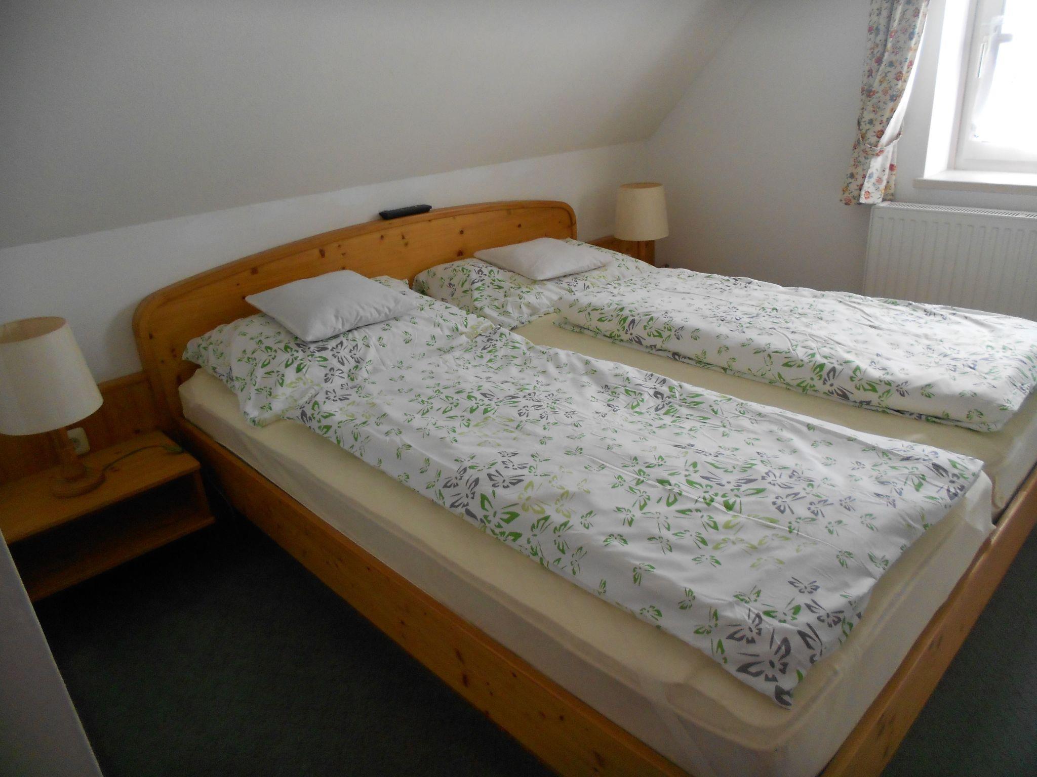 The family-friendly, sunny holiday house of around 62m² is suitable for four to five people in summer or in winter. You can experience a wonderful oasis of well-being here all year round. The lower floor has underfloor heating, whilst the upper floor has radiators. The combined living and dining room includes the new kitchen, equipped with all the necessary utensils, a dishwasher, microwave, fridge with freezer compartment, coffee machine and kettle. The visually separate living and dining room invites you to relax. You can dine together at the dining table after cooking. Satellite TV, a radio, a box of games and books are available. Stairs lead to the upper floor. There is a stairlift for the disabled. There are two bedrooms on the first floor, one with a double bed and one with a queensize bed (140cm wide). The master bedroom has a further satellite TV. Towels, tea towels and bed linen are provided. There is plenty of cupboard space. All the windows are fitted with fly screens. There is a storage room with a washing machine and dryer, broom, dustpan, two fridges with a freezer compartment and other useful items. There is a washing space next to it with a WC and washing machine. A little entrance area leads into the bathroom with a shower and WC. Note that the WCs in the house are higher than normal toilets.