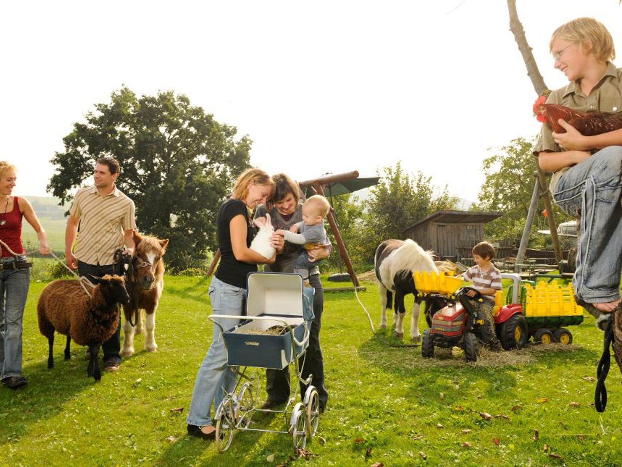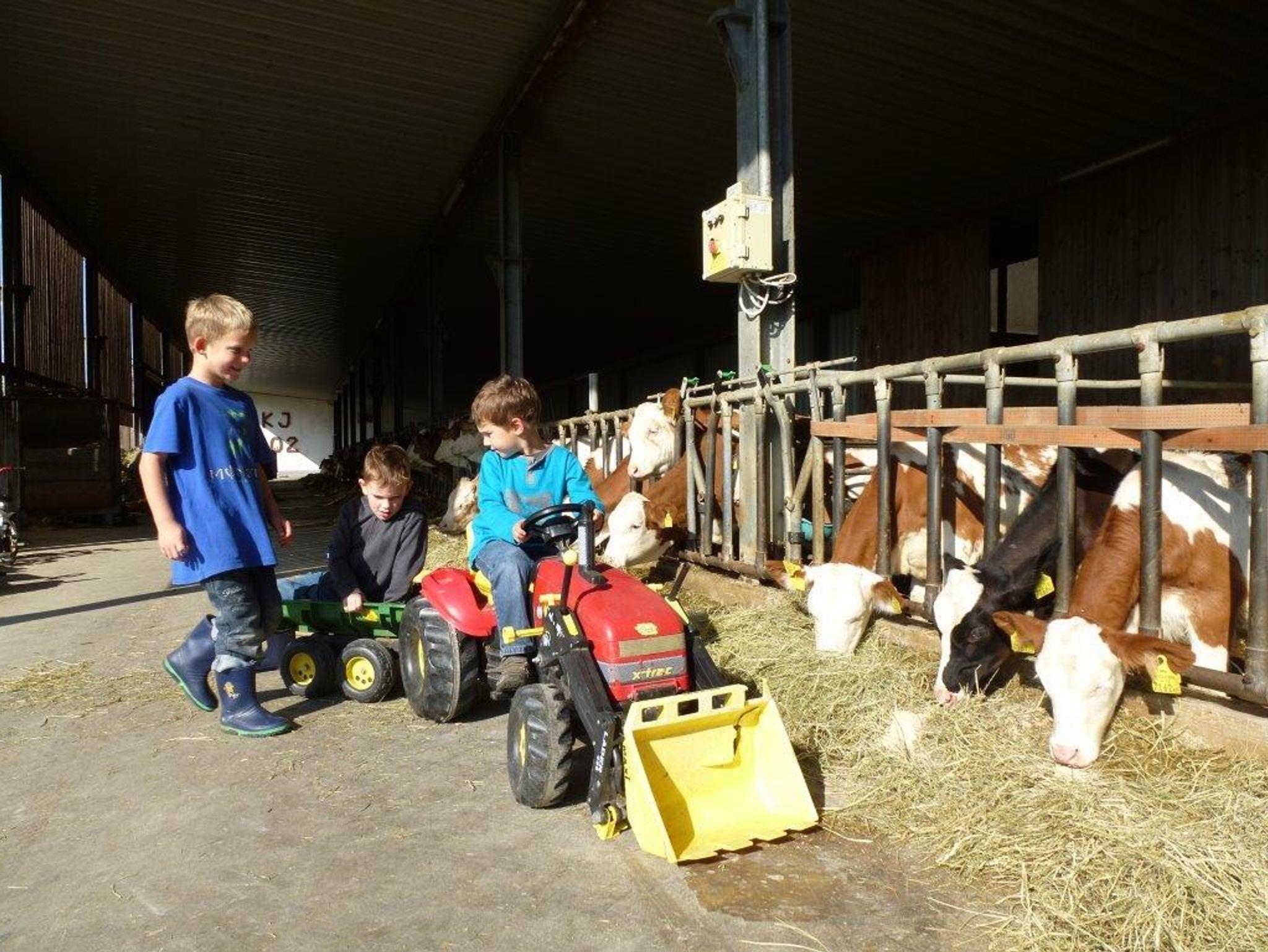 Wir sind ein landwirtschaftlicher Vollerwerbsbetrieb mit Jungrindern/Kühe und vielen Kleintieren(Hasen,Ponnys Ziegen;...). Unser überdachtes Schwimmbad, Spielplatz, Riesensandhaufen, Trampolin, Tischtennis, Go-Kart, Rutschautos, Spielesammlung und Spielräume für verschiedene Altersgruppen warten darauf von Euch entdeckt zu werden.