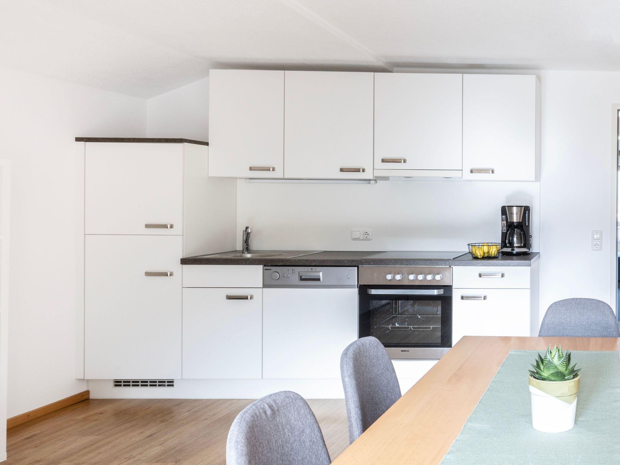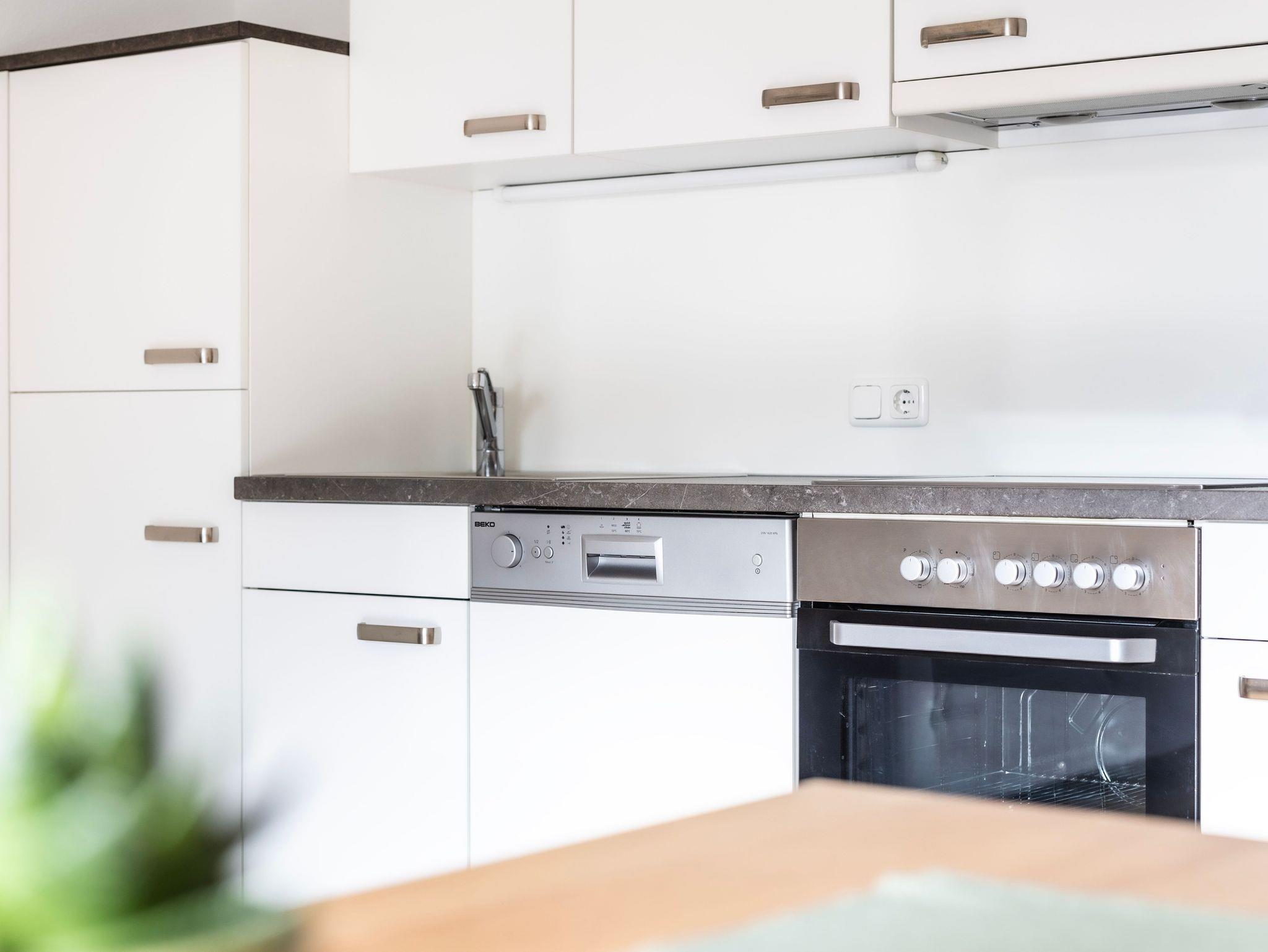 Die modernen Küchen sind voll ausgestattet und verfügen über einen großen Esstisch, Cerankochfeld, Backofen, Mikrowellenherd, Spülmaschine, Flatscreen TV, Couch und Balkon.