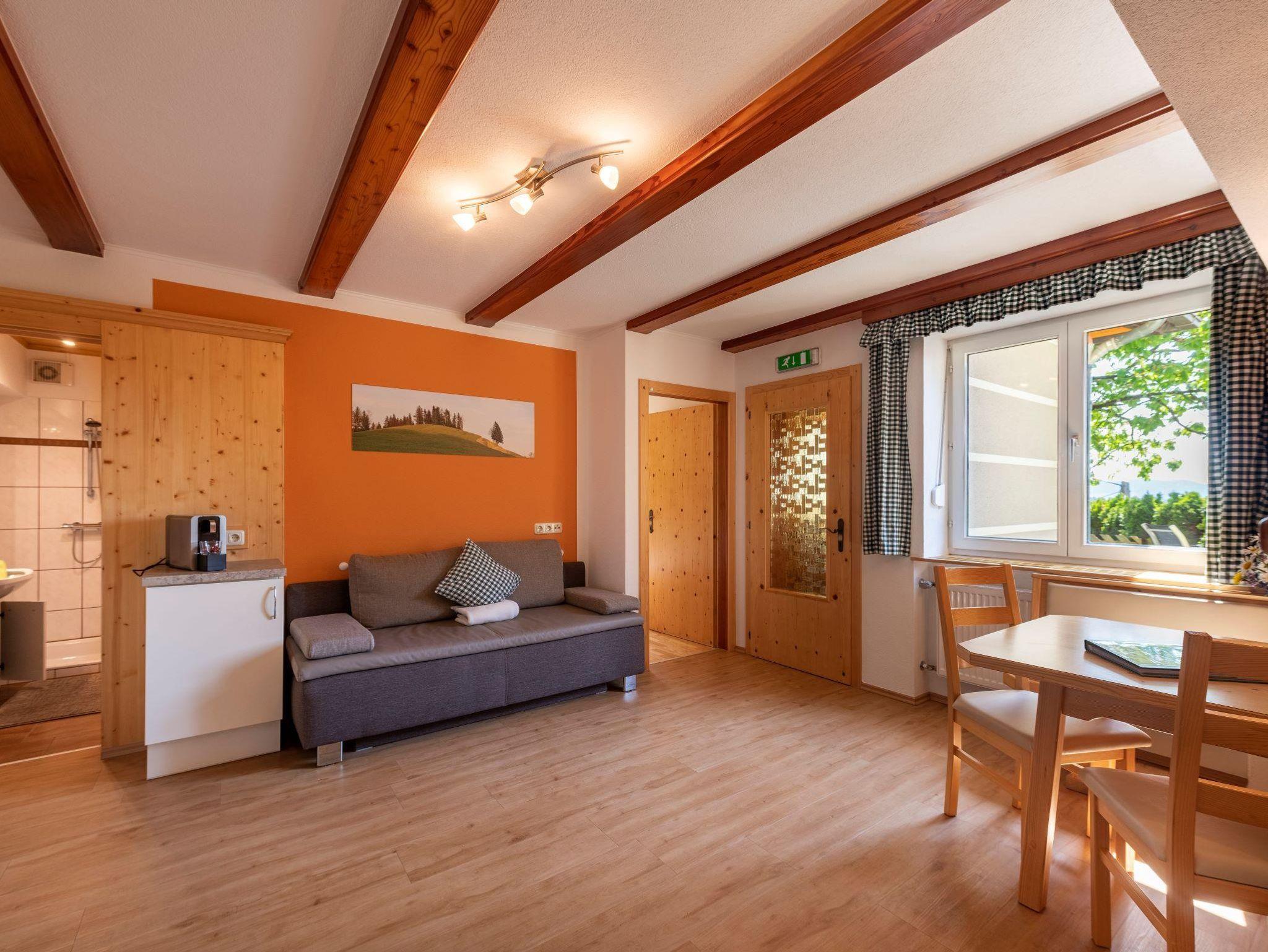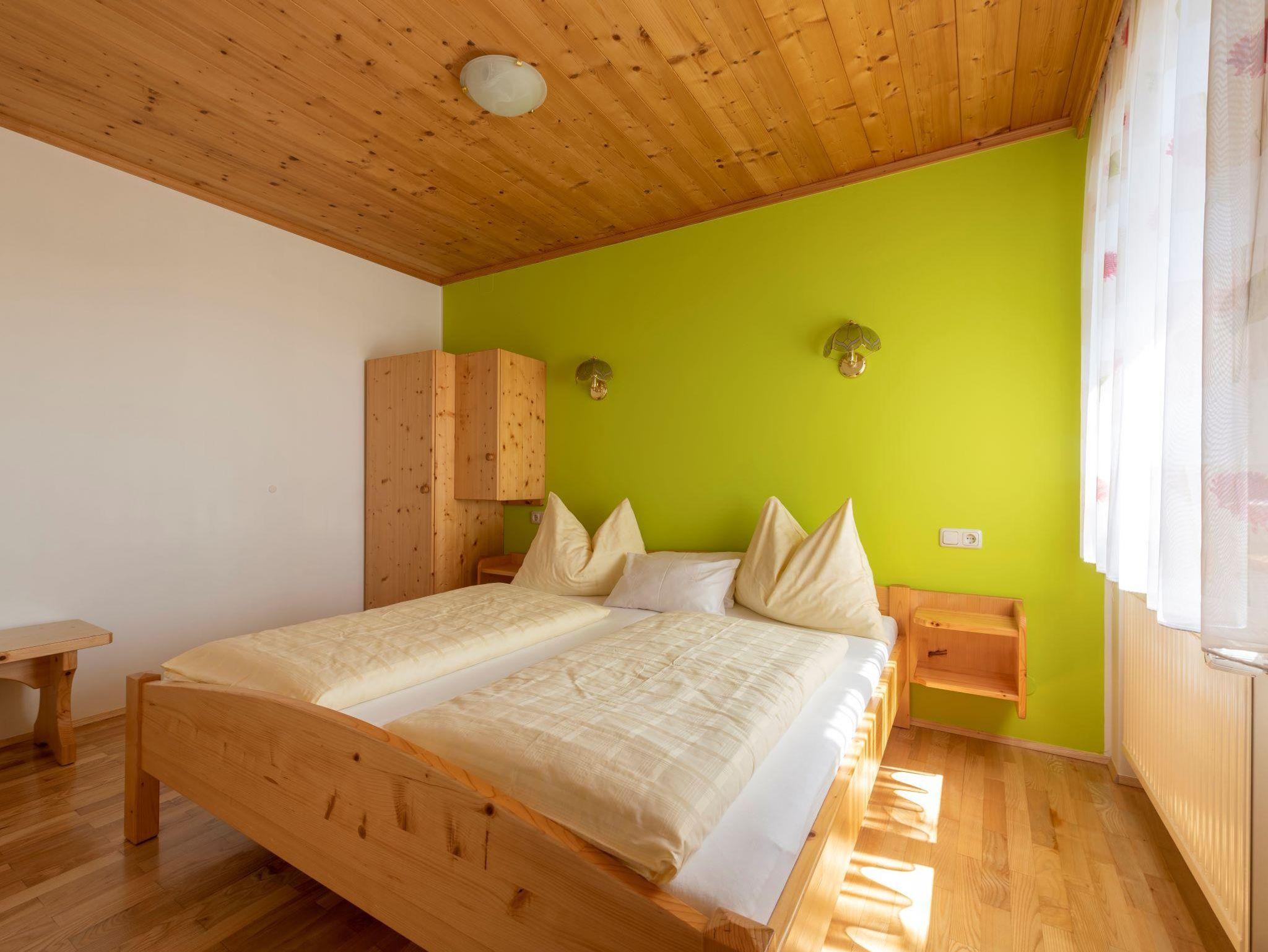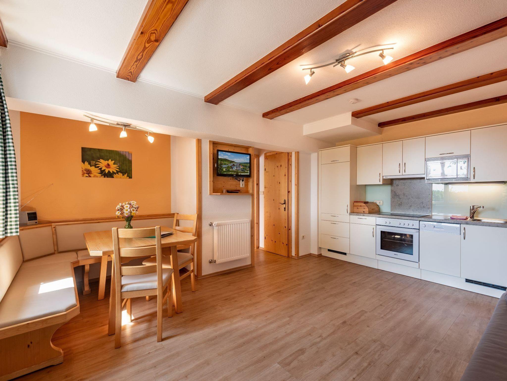 Die Ferienwohnung ist mit viel Holz ausgestattet. In der Wohnküche mit gemütlichen Sofa finden Sie einen Geschirrspüler, Mikrowelle, Kühlschrank, E-Herd mit Backrohr, Wasserkocher eine Kaffeemaschine und Sat-TV, 2 getrennte Schlafzimmer (1 Zimmer mit Doppelbett, ein 3 Bettzimmer davon ein Stockbett). Bad und WC getrennt, Vorraum. Um die herrliche Aussicht und frische Luft zu genießen gibt es einen eigenen großen Sitzgarten zum Faulenzen. Sehr beliebt ist die Wohnung, da Sie alleinstehend und ebenerdig ist.