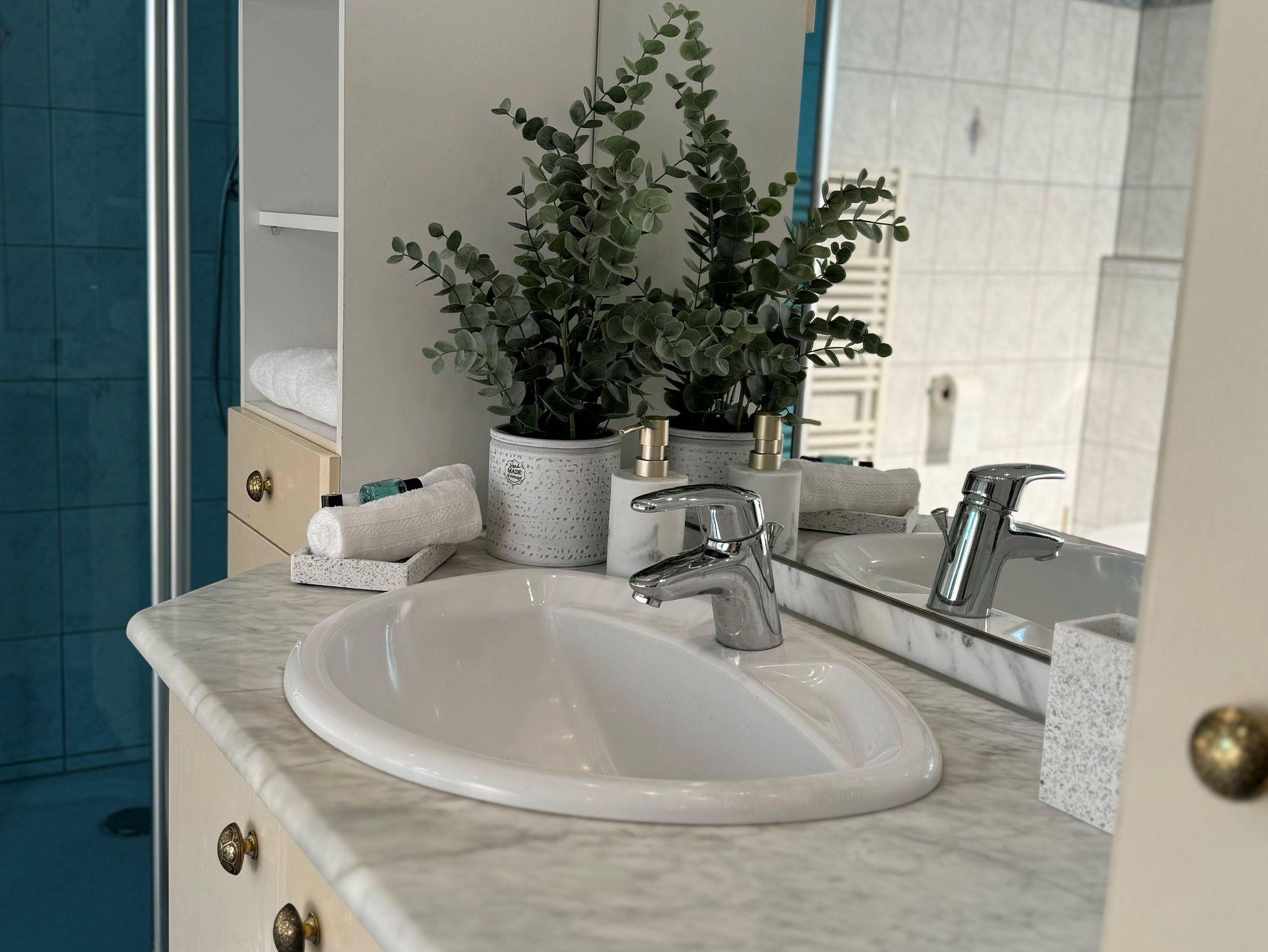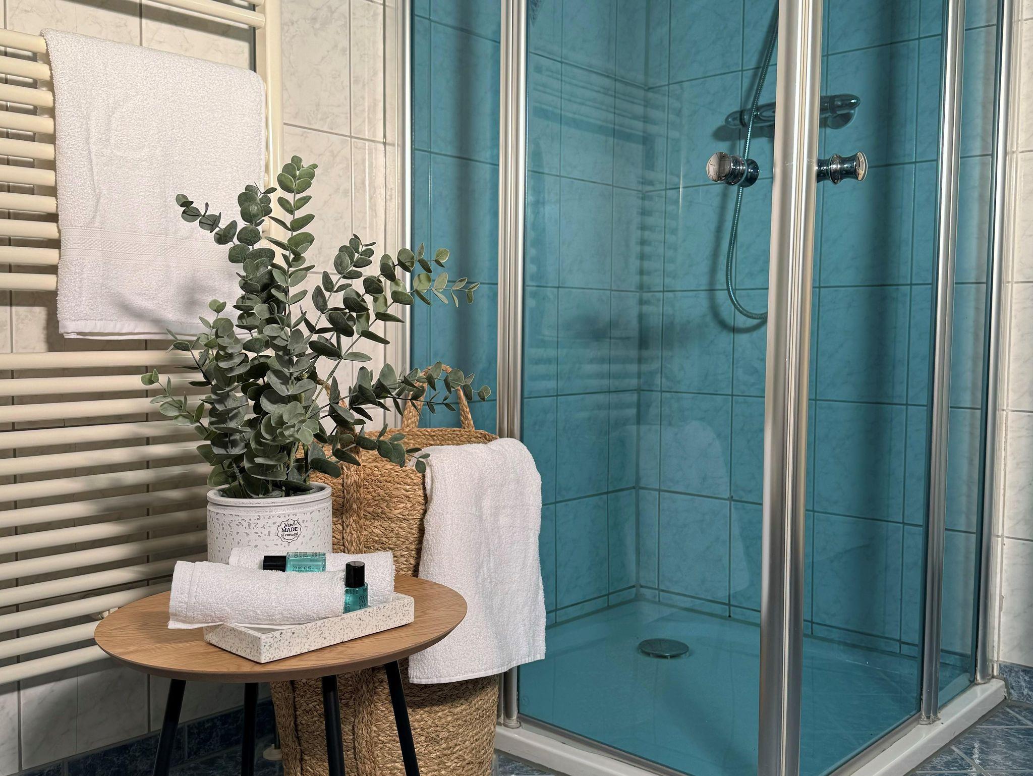 Im grossen Badezimmer befindet sich eine Dusche und eine zusätzliche Eckbadewanne. Zu den weiteren Annehmlichkeiten zählen eine Waschmaschine mit Bügelaustattung, kostenfreie Wasch- und Pflegeprodukte, Kaffeemaschine, Spülmaschine, … .